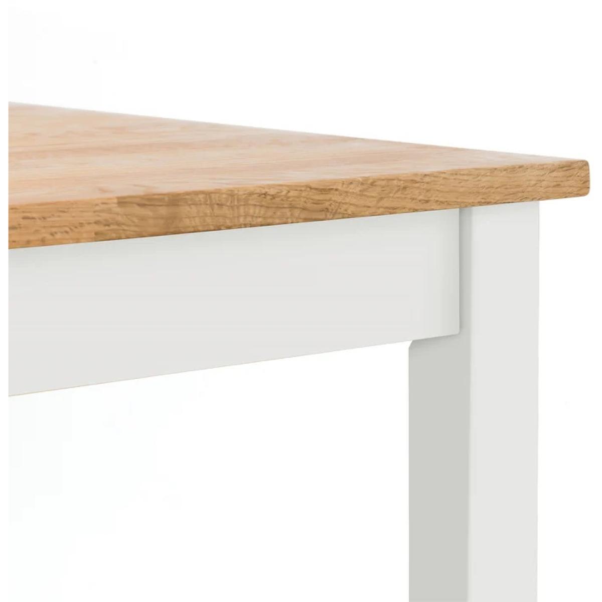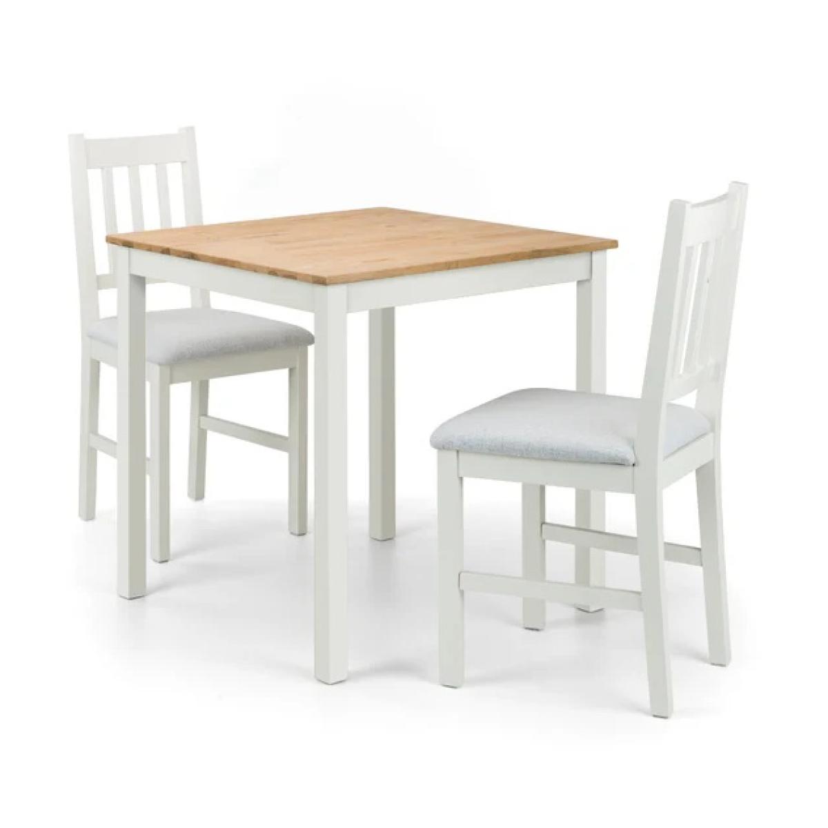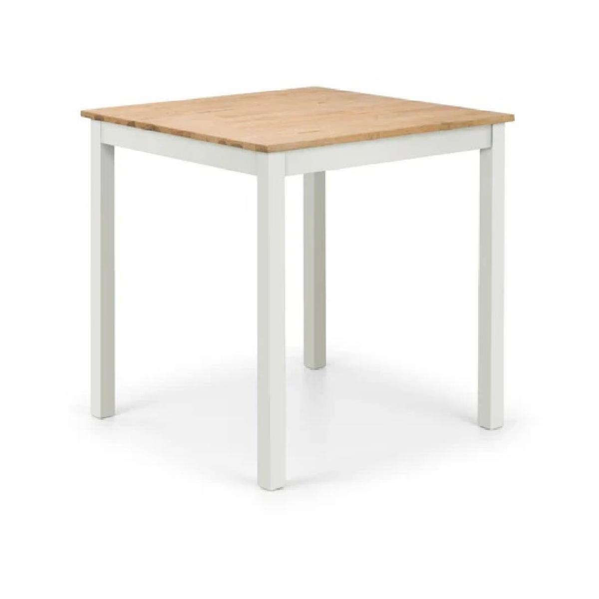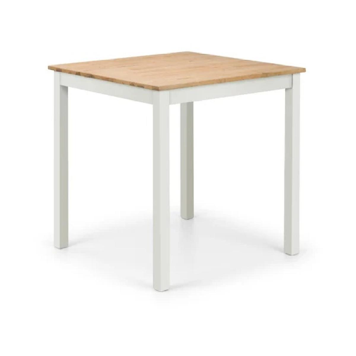 The Julian Bowen Coxmoor Square Dining Table 75cm – Ivory & Oak is a beautifully compact piece, ideal for smaller kitchen-diners or more modest dining spaces. With its solid oak top in a warm oiled finish and painted ivory legs, this table strikes a perfect balance between classic design and contemporary charm. Timeless Elegance: Crafted with care, the combination of natural oak and soft ivory brings a light, refined touch to your home—suiting both traditional and modern décor schemes with ease. Strong & Reliable: Constructed from sturdy solid wood, this table is built to handle daily use, offering excellent stability and durability for years of dependable dining. Space-Saving Style: Thoughtfully proportioned to suit small to medium-sized areas, it’s perfect for cosy mealtimes or casual gatherings, all while enhancing your dining space with its understated design. Dimensions: Overall: Height 75cm x Width 75cm x Depth 63cm Clearance beneath: Height 67.3cm – allowing generous legroom and comfortable seating. What’s Included: One Julian Bowen Coxmoor Square Dining Table (chairs sold separately). Minimal assembly required – all fixings and easy-to-follow instructions are provided for a straightforward setup.
