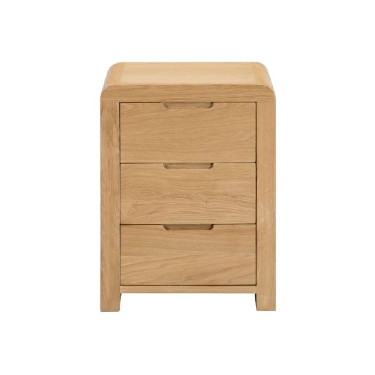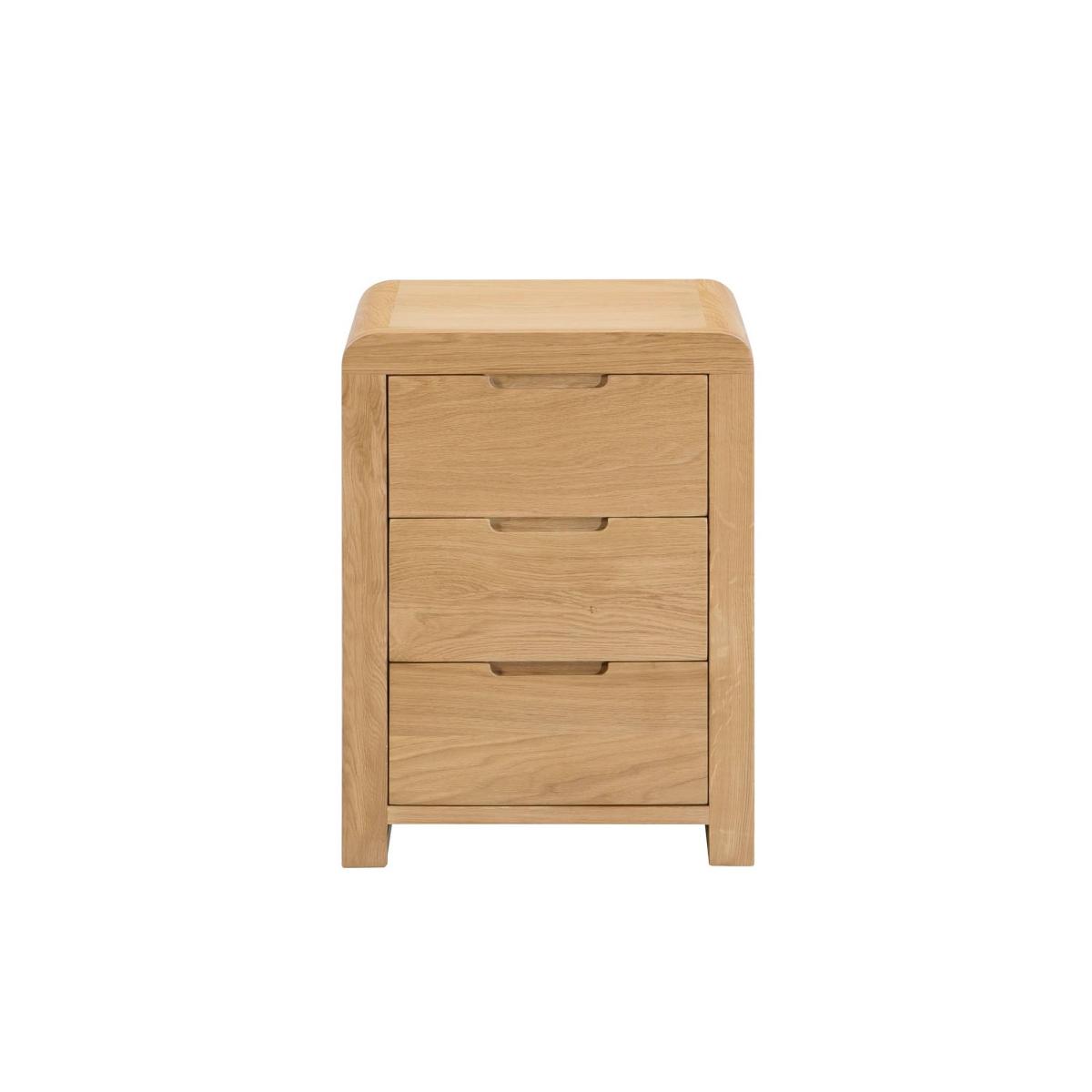 Crafted from solid white oak and oak veneers, the Curve combines clean lines with a gentle curved edging, adding a stunning touch to any bedroom. Recessed handles enable easy opening and a modern feel. This Curve bedside features three drawers, suitable for those items needed at hands reach from your bed. Solid white oak and oak veneers 3 drawers Assembly required Dimensions: 61cm (H) x 45cm (W) x 38cm (D)