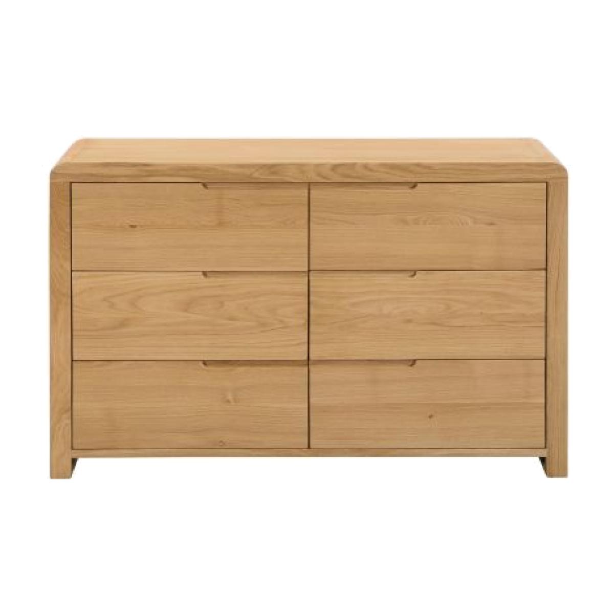 Crafted from solid white oak and oak veneers, the Curve combines clean lines with a gentle curved edging, adding a stunning touch to any bedroom. Recessed handles enable easy opening and a modern feel. This Curve wide chest features six large drawers, perfect for extra storage. White oak and oak veneers 6 drawers Assembly required Dimensions: 76cm (H) x 120cm (W) x 44cm (D)