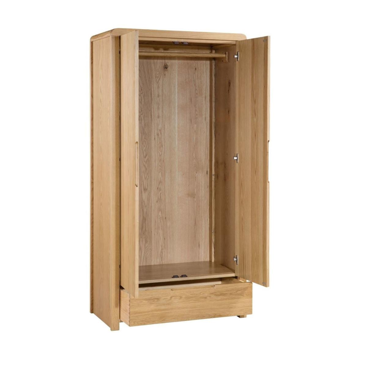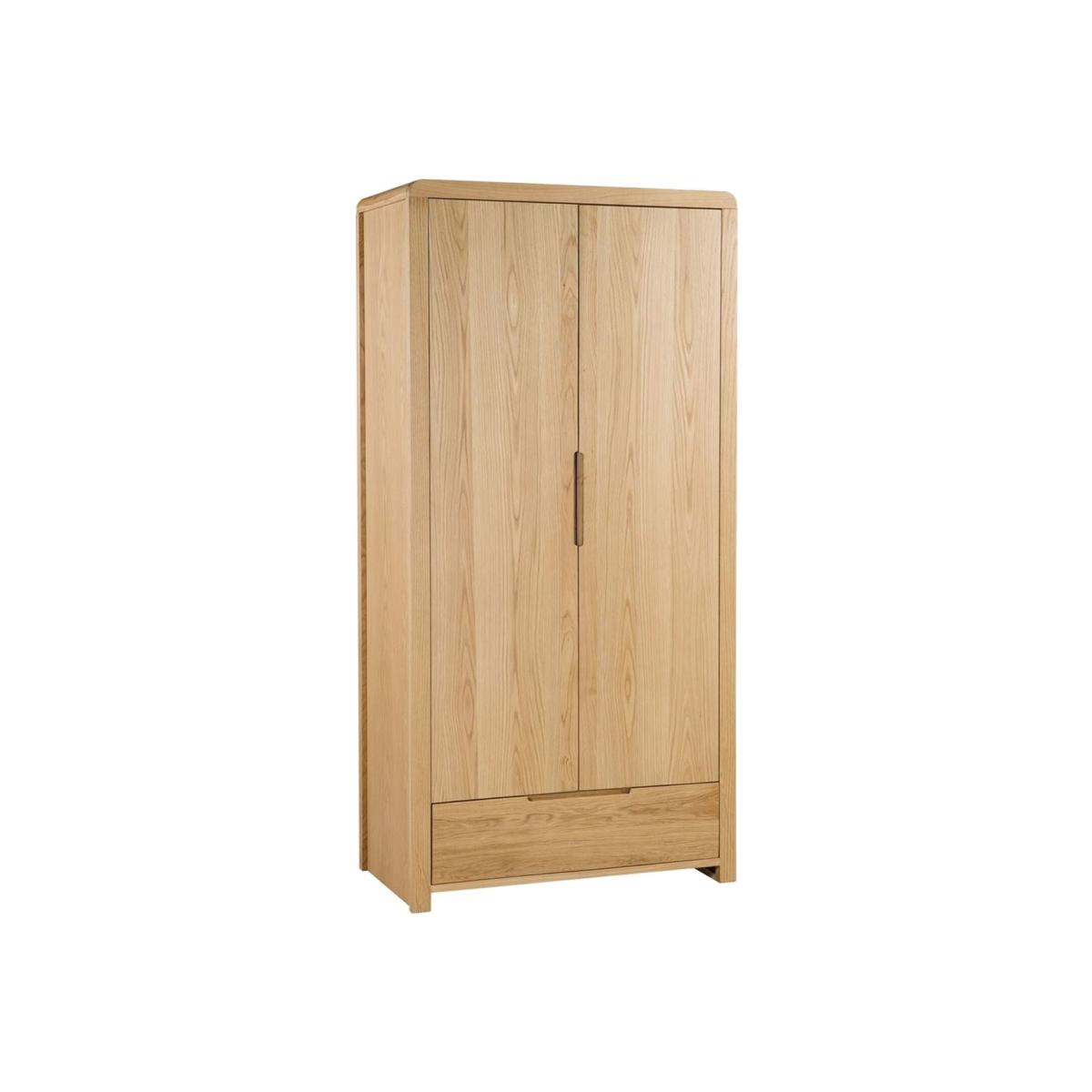 Dimensions H190 x W93 x D52 cm. The Curve wardrobe with 2 doors and 1 drawer is finished in oak and complimented in curves which provides sophistication and elegance. Features. Constructed from solid oak and  oak veneers. Recessed handles for a modern feel. Featuring ample hanging space and a large drawer. A perfect storage space. Matching items available Assembly required..