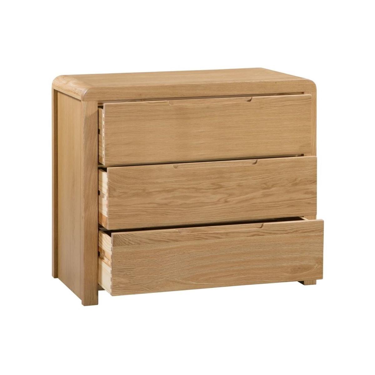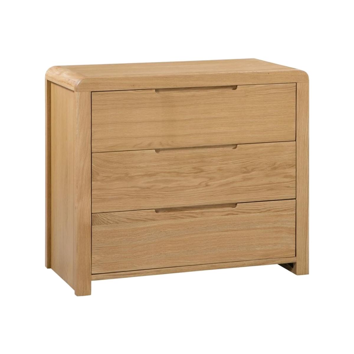Dimensions H81 x W91 x D50 cm. The Curve chest of drawers is finished in oak and complimented in curves which provides sophistication and elegance. Features. Constructed from solid oak and oak veneers. Recessed handles for a modern feel. Featuring 3 large drawers. Perfect for some extra storage and surface space. Matching items available Assembly not required..