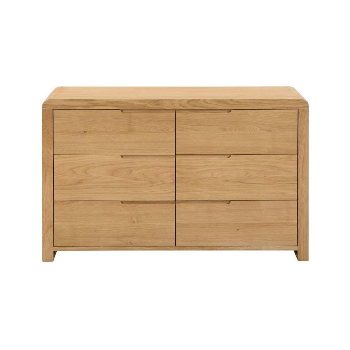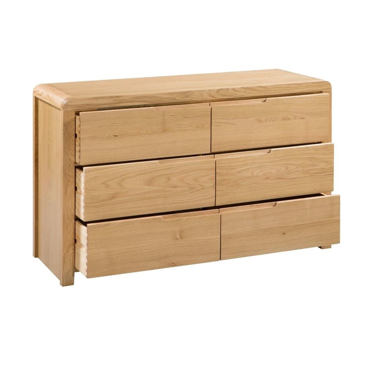 Dimensions H81 x W126 x D50 cm. The Curve 6 drawer wide chest is finished in oak and complimented in curves which provides sophistication and elegance. Features. Constructed from solid oak and oak veneers. Recessed handles for a modern feel. Featuring 6 large drawers for hiding clutter Perfect for some extra storage and surface space. Matching items available. No assembly required..