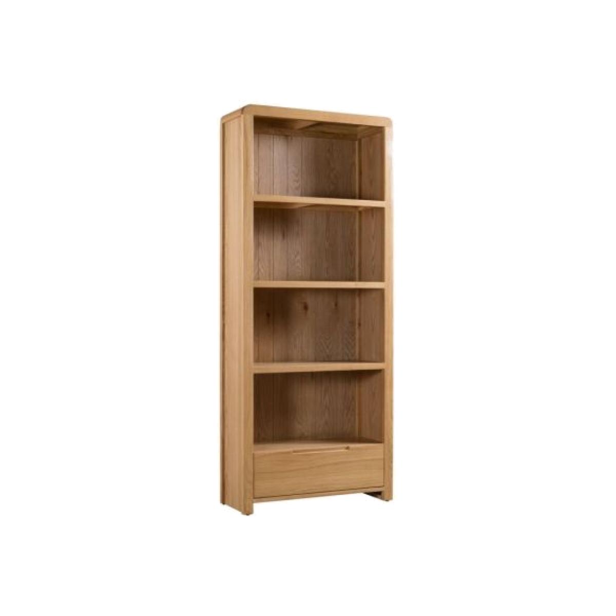 I’m a fan of this Curve oak tall bookcase for its straightforward silhouette and warm, natural finish. It sits comfortably in Scandi, modern farmhouse or even industrial schemes, and the five open shelves plus a handy drawer give you room to display books alongside storage baskets or ceramics. For styling, mix upright and laid-flat books, slot in a few potted plants to break up the wood tone, and use the drawer below for chargers or loose papers. Keep one or two shelves quite minimal to balance busier vignettes, and consider pairing it with a contrasting paint-colour wall - deep teal or soft grey works particularly well.