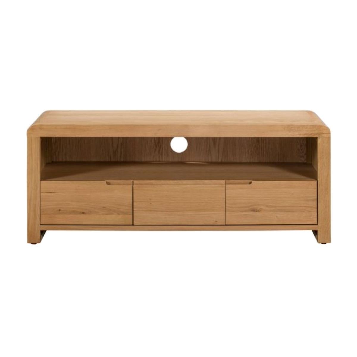 I love how the Curve Oak unit’s gently rounded edges and natural oak finish bring warmth to minimalist and Scandi-style living rooms without feeling fussy. Its clean lines and recessed handles suit contemporary country or modern industrial schemes alike, while the three drawers keep remotes and cables neatly out of sight and the open shelf is perfect for a set-top box or a sculptural piece. For practical styling, keep the top clear apart from your TV and one or two low-profile accessories - think a small plant in a textured pot or a simple ceramic vase. Thread any cables through the back hole to maintain that streamlined look. On the shelf below, stack a couple of coffee-table books and balance them with a compact speaker or greenery to add depth and interest without overcrowding.