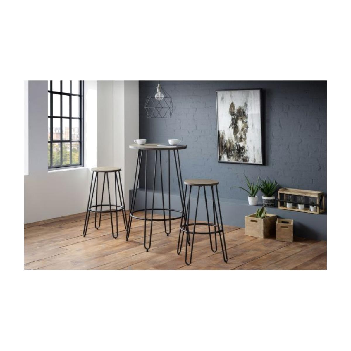 The Dalston Round Bar Table features hair pin legs giving a modern, industrial look to any room. Crafted from solid elm wood and satin black powder coated steel, this bar table offers a durable, sturdy space-saving construction. Pair up with the Dalston Bar Stool or Spitfire Bar Stool for an industrial bar set. The 2nd image shown features the Grafton Bar Stool. Assembly required. Please note, this product is an online exclusive and is not available to view in any of our stores.