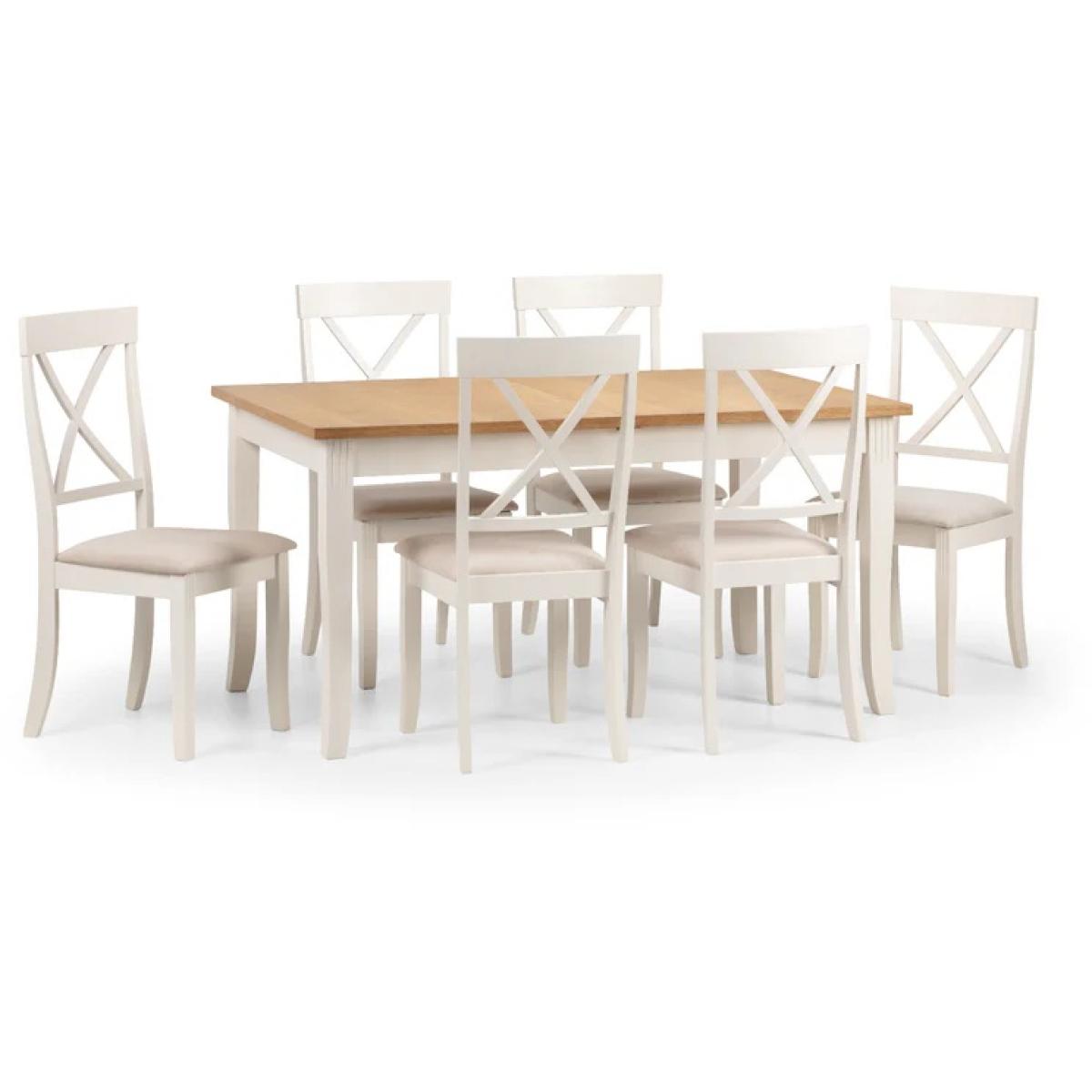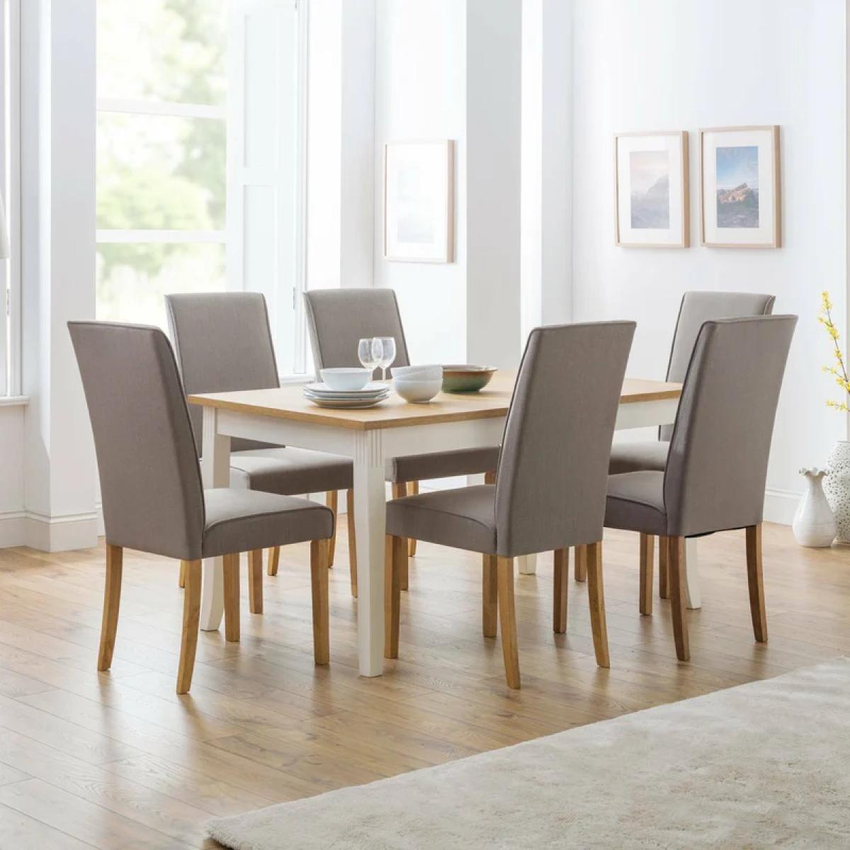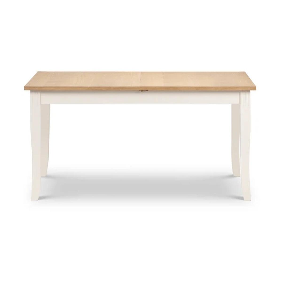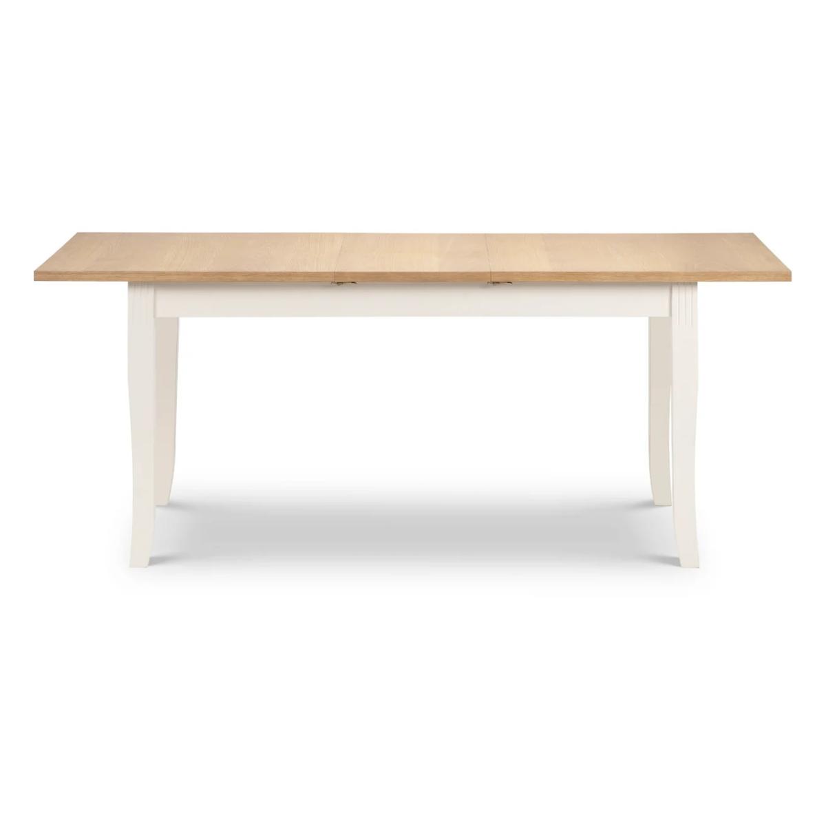 A perfect blend of practicality and elegance, the Julian Bowen Davenport Extending Dining Table is an ideal choice for both everyday use and entertaining guests. Crafted from solid rubberwood with a 25mm real oiled oak veneer top, it offers durability and timeless appeal. Elegant & Versatile Design: Finished in a classic ivory lacquer, this table complements a wide range of interior styles, adding a refined touch to any dining room or kitchen setting. Clever Space-Saving Extension: Featuring a smooth butterfly extension mechanism, the table extends effortlessly to provide additional seating when required. The extension neatly stores within the table, maintaining a tidy, streamlined look when not in use. Built to Last: Combining sturdy solid rubberwood with a beautifully grained oak veneer top, this piece is built for lasting use—perfect for everyday family dining or special occasions. Product Highlights: Crafted from solid rubberwood with a 25mm real oiled oak veneer top Elegant ivory lacquer finish Easy-to-use butterfly extension system Internal storage for extension leaf Full Assembly Required Part of the Julian Bowen Davenport range 12-month product guarantee Dimensions: Height 74.5cm Width 190cm Depth 90cm Pair it with matching items from the Davenport collection to create a coordinated and inviting dining space. Please note All screens vary in colour reproduction and whilst every effort has been made to display the colour as accurately as possible it is for guidance only.