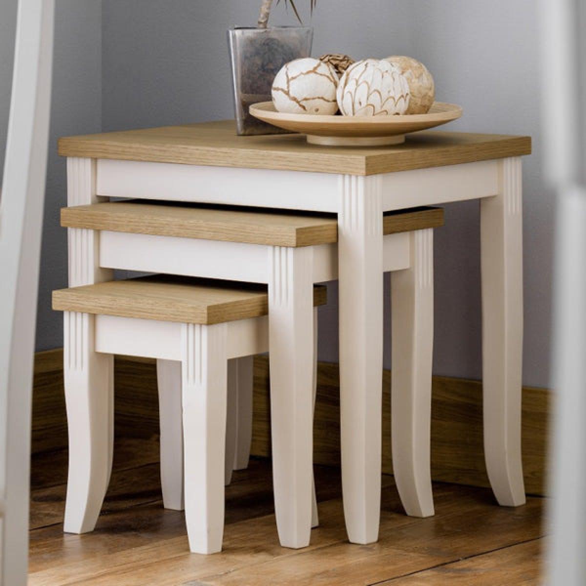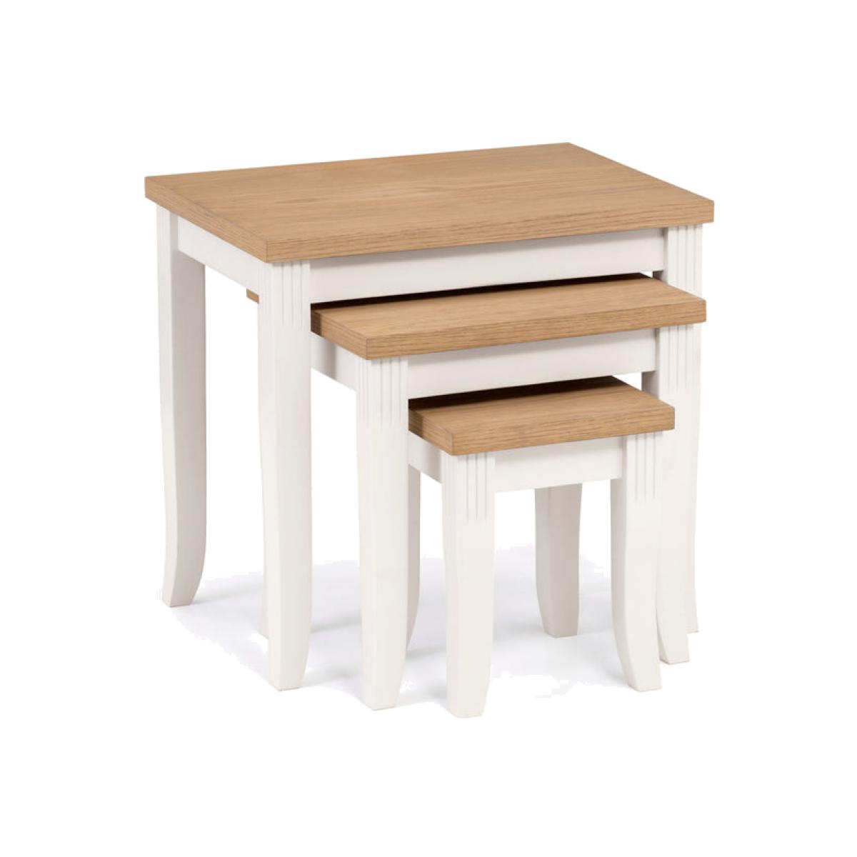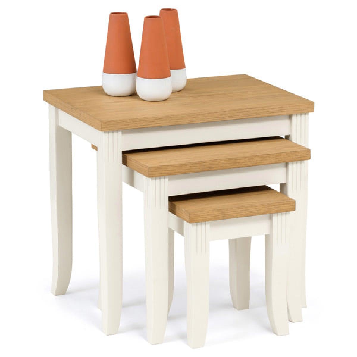 Crafted from solid rubberwood and a real oiled oak veneer 25mm top, this is the ideal nest of tables for your home. In an elegant ivory lacquered finish, with delicately shaped legs complemented by exquisite detailing creating classic living room decor. A wide range of co-ordinating items are available in the Julian Bowen Davenport collection.