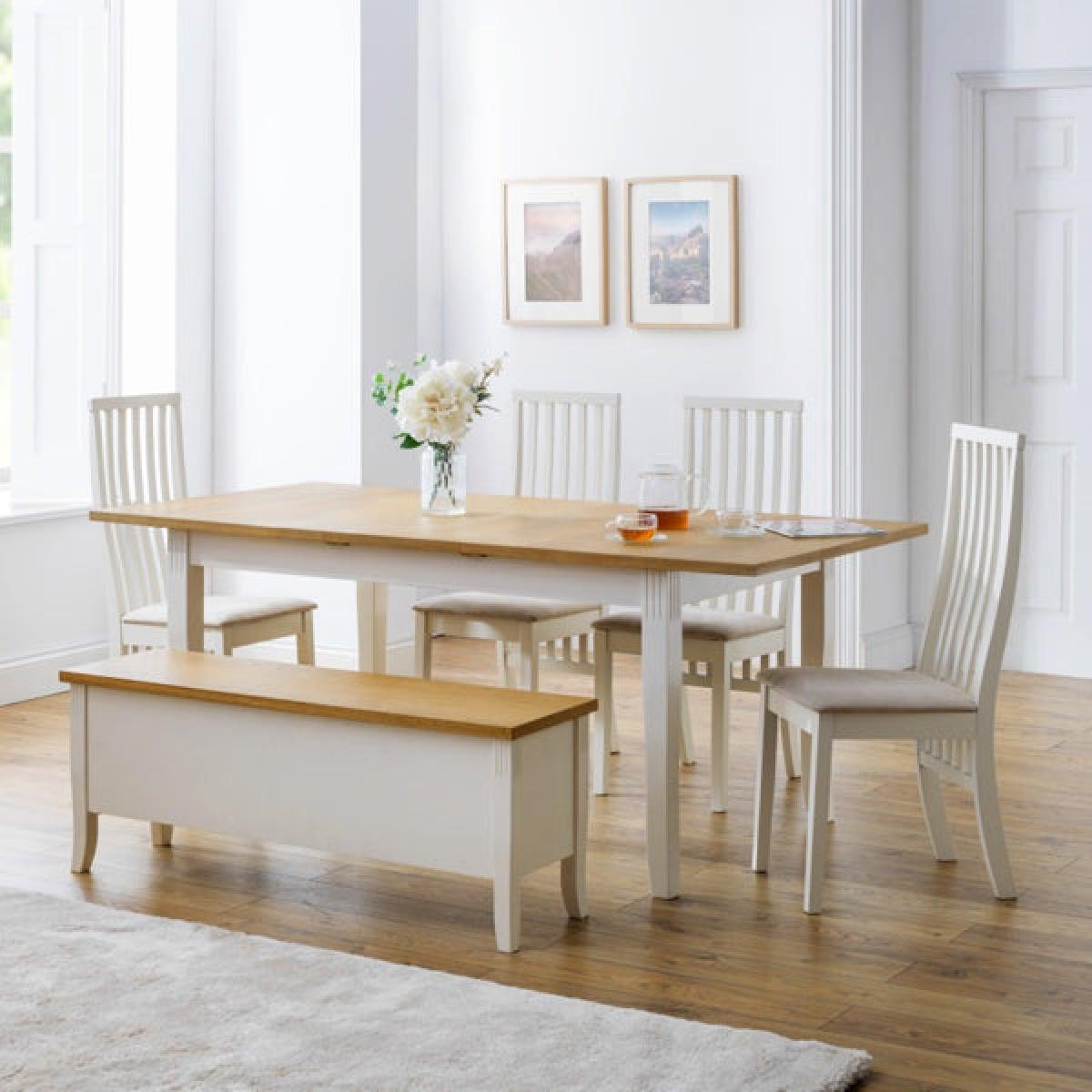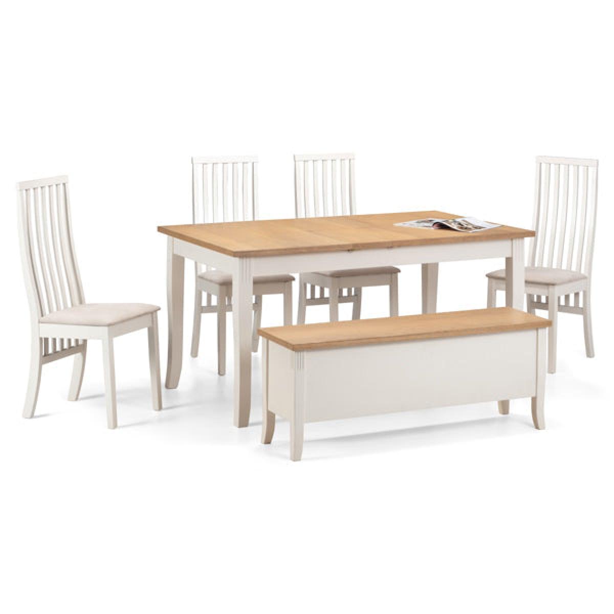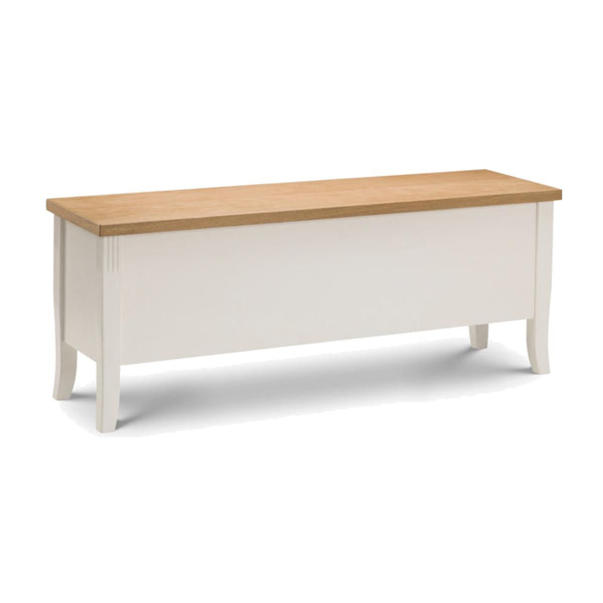Crafted from solid rubberwood and a real oak veneer top, this dining bench is the perfect addition for having dinner guests. An elegant ivory finish adds a touch of elegance to any dining area. A wide range of co-ordinating items are available in the Julian Bowen Davenport collection.