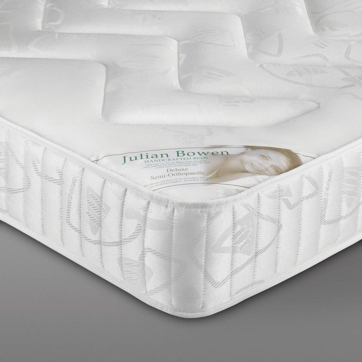 Product Description The Deluxe range of mattresses from Julian Bowen offer high comfort at affordable prices. You'll be sure to get a good night's sleep with a mattress from this range. The Deluxe King size Semi-Orthopaedic Mattress is the perfect companion to any king size bed frame and will be sure to give you a comfortable night. The stitch quilted oyster damask cover adds a little detail and a high quality essence. Available in five different sizes you'll easily be able to find a mattress that suits your bed. Finish Fabric Size W152.5cm x D198cm x H23cm Features. King size mattress Deluxe semi-orthopaedic mattress23cm Deep mattress High Quality Damask Cover Part of the deluxe mattress range..