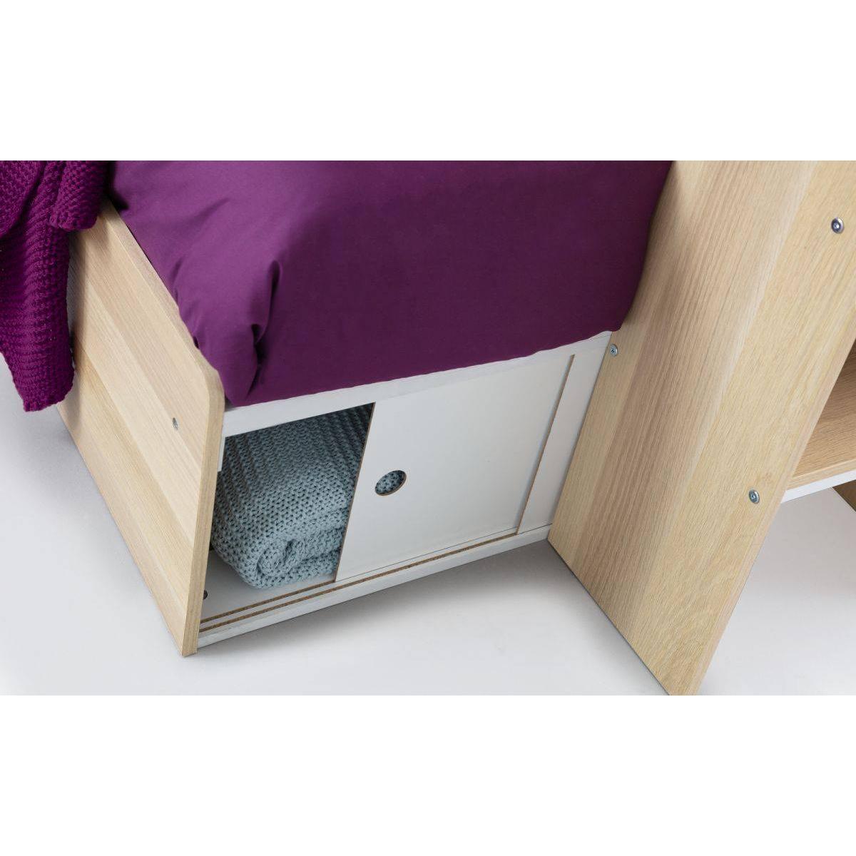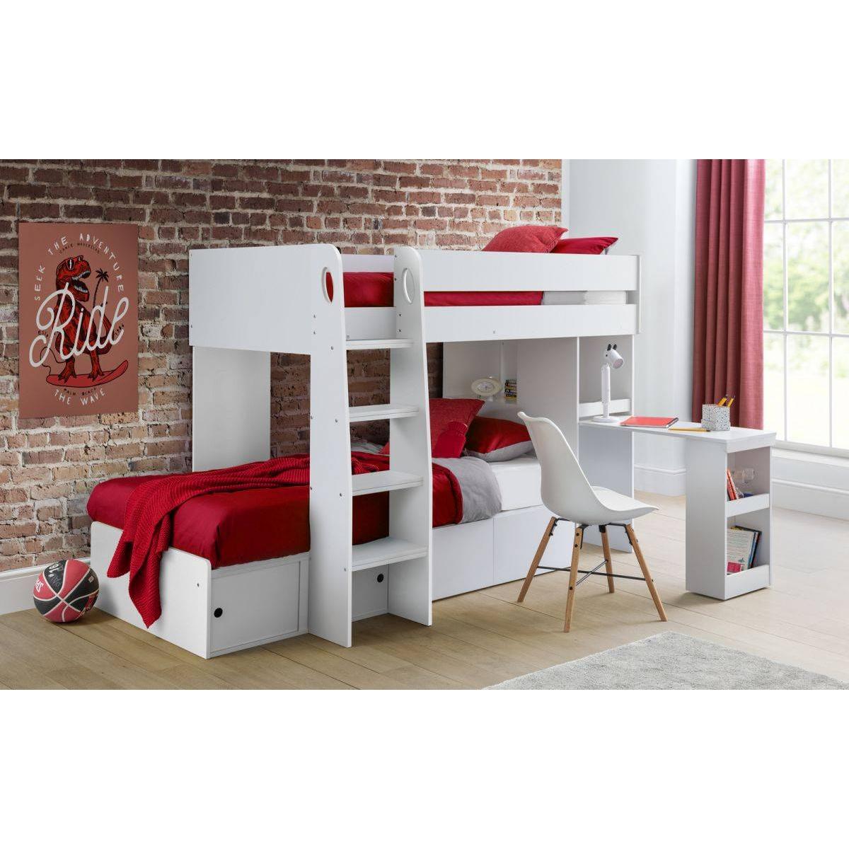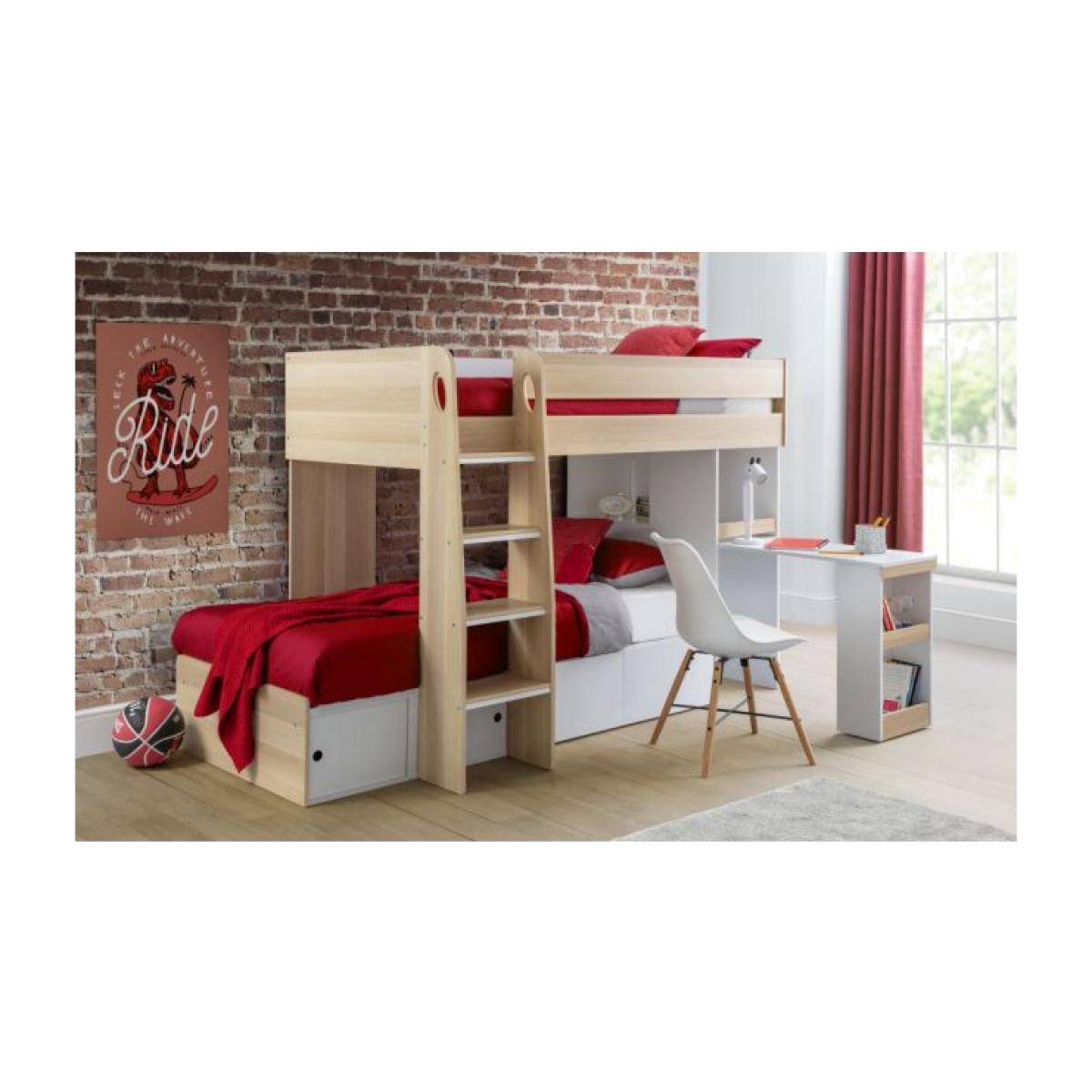 The Eclipse bunk bed combines contemporary style with great practicality. Offering a vast amount of storage helping to save on floor space, this bunk features a pull-out desk with a storage shelf on the end perfect for displaying books, 2 pull-out storage drawers and a shelf. This offset bunk offers 2 separate cosy sleeping spaces, with a robust ladder displaying attractive cut-out handles. The Eclipse Bunk is available in a crisp white or oak and white colour, suitable for any childrens bedroom! Features: Dimensions: 98cm D x 240cm W x 150cm H This modern, neutral design will suit both boys and girls rooms making it very versatile Featuring a robust ladder with attractive cutout handles Includes a pull-out desk with a storage shelf on the end, 2 pull-out drawers and a shelf Available in a crisp white or scandinavian oak and white colour, suitable for all décor Requires assembly Material: Particleboard Please note, this product is an online exclusive and is not available to view in any of our stores.