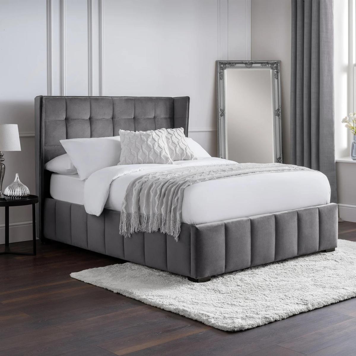 Julian Bowen Gatsby Velvet Bed in Light Grey – Timeless Elegance Meets Modern Luxury Step into a world of refined comfort with the Gatsby Bed, where classic design meets contemporary sophistication. Upholstered in sumptuous light grey velvet, this bed transforms your space into a serene and luxurious retreat. At the heart of its design is a stunning winged headboard, creating a striking focal point while adding depth and elegance to your bedroom. Subtle detailing on the headboard brings a modern edge to its otherwise timeless silhouette, blending traditional charm with today’s design sensibilities. Crafted to elevate any décor, the Gatsby Bed is the perfect centrepiece for a sophisticated, restful sanctuary. Redefine your bedroom with the Gatsby Bed – a true symbol of comfort, style, and enduring appeal. Features: Elegant winged headboard for a bold, graceful statement Soft light grey velvet upholstery for a plush, luxurious finish Refined details blend classic style with a modern touch Timeless design suited to both traditional and contemporary interiors Backed by a 12-month product guarantee Delivered flat-packed for home assembly Dimensions: Double: Height: 127cm Width: 157cm Depth: 206cm King: Height: 127cm Width: 171cm Depth: 215cm All screens vary in colour reproduction and whilst every effort has been made to display the colour as accurately as possible it is for guidance only.