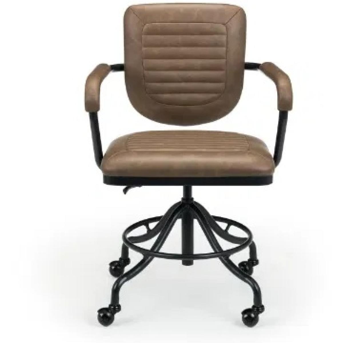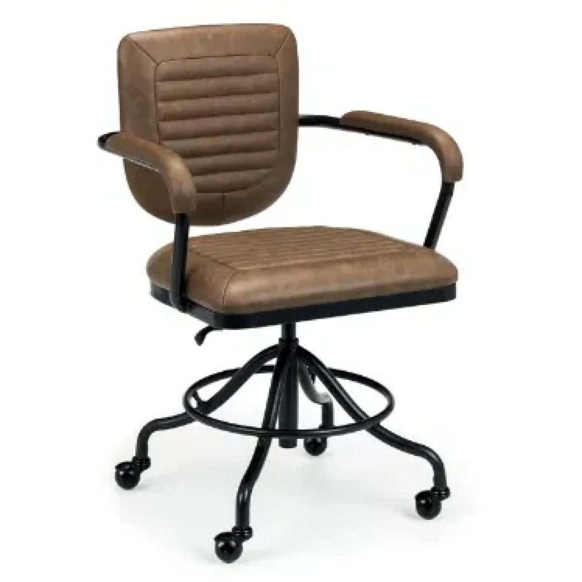 Bring a touch of modern sophistication to your workspace with the Julian Bowen Gehry Upholstered Office Chair. Featuring sleek brown faux leather upholstery and striking black metal accents, this chair effortlessly blends contemporary style with industrial flair. Designed for both comfort and durability, the Gehry chair boasts a generously padded seat and backrest with elegant, detailed stitching. The sturdy black-finished metal frame provides reliable support, while the height-adjustable base ensures a tailored fit for your desk or workstation. Whether used in a home office or as a stylish accent in the lounge, this versatile chair offers both function and flair. Features: Upholstered in high-quality brown faux leather Eye-catching black metal base for a luxurious finish Comfortable padded seat and backrest with refined stitching Height-adjustable with smooth gas-lift mechanism Swivel functionality for everyday convenience Ideal for office, bedroom, or living spaces Dimensions: Height: 84–94 cm Width: 60 cm Depth: 58 cm The Gehry Office Chair is a bold and elegant seating solution, perfect for elevating any contemporary interior.