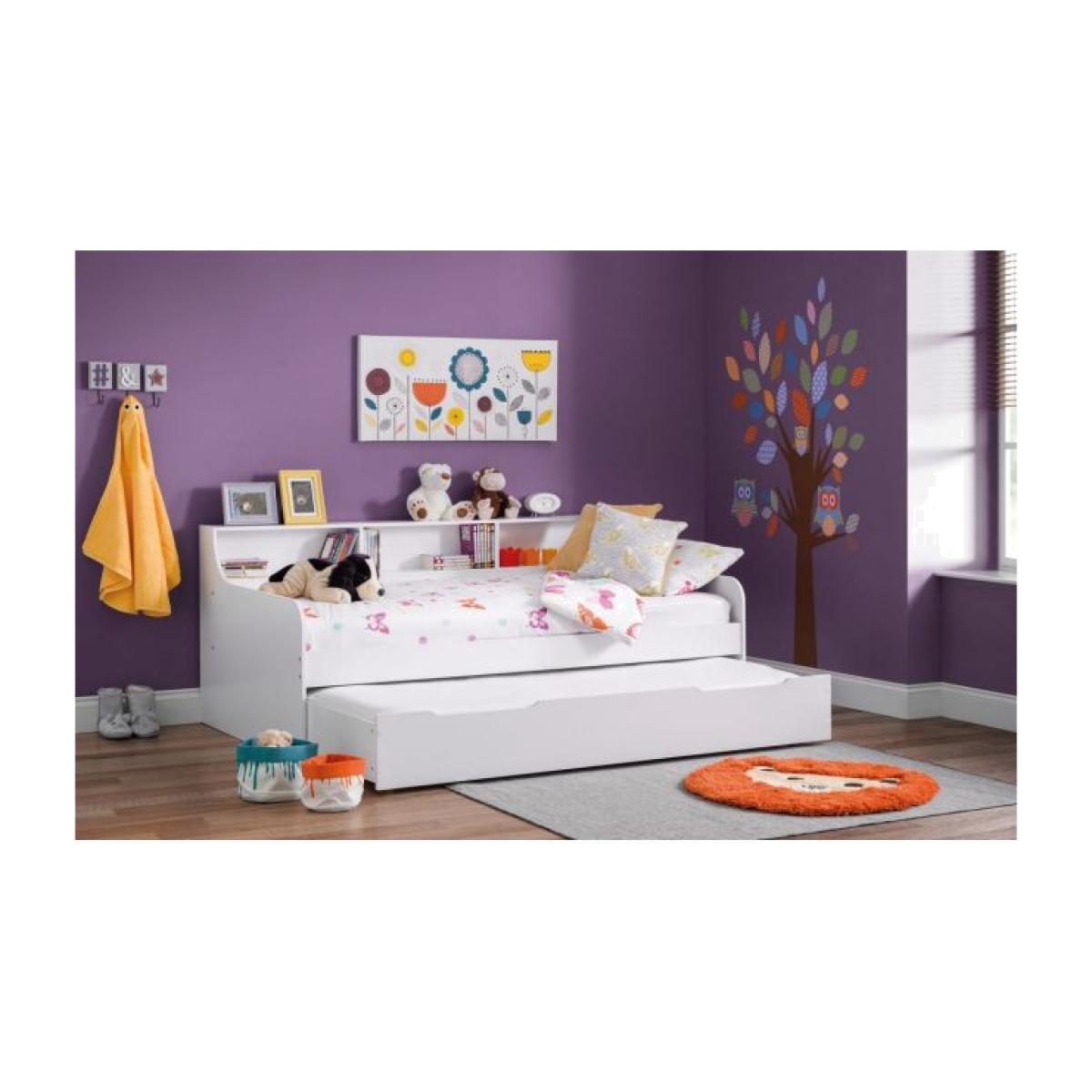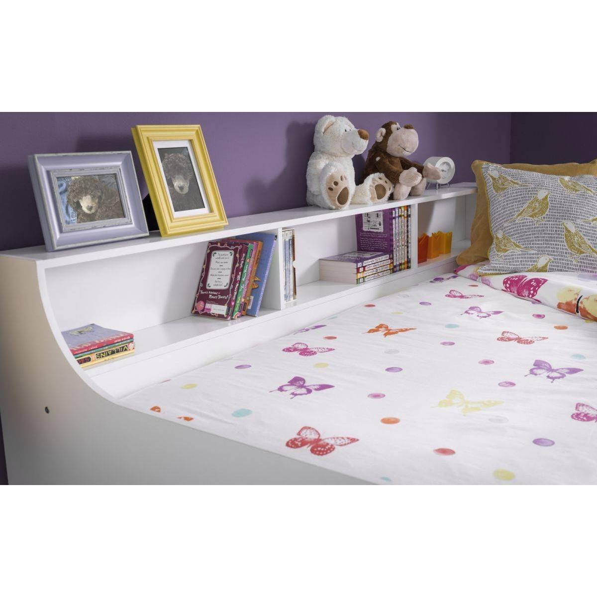 Grace is a stunning pure white daybed which offers  great functionality for both children's rooms and elsewhere. The sleek curved design incorporates copious handy shelving, and when combined with the Ellie Underbed provides enormous amounts of underbed storage or the option of an extra sleeping surface. Features: Dimensions: 112cm D x 196cm W x 82cm H Clean, Matt White Finish Stylish and Practical Design Accepts a Standard UK Single Sized Mattress - 90cm x 190cm Ellie Underbed/Large Storage Drawer available separately Requires assembly Material: Coloured Particleboard