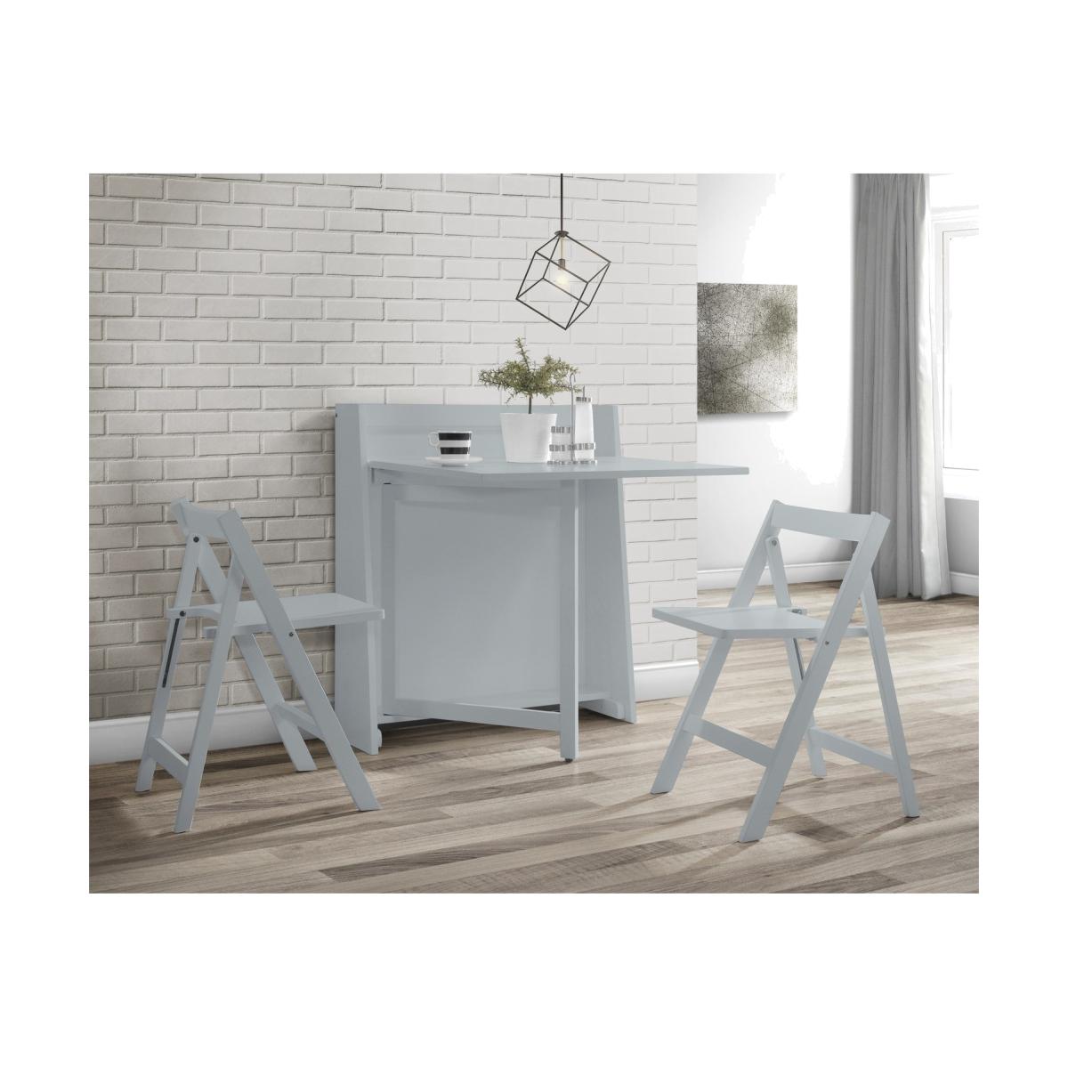 Dimensions H90 x W80 x D27 cmA Neat and Functional Space Saving Dining Set where the Chairs can be Folded and Stored Inside the Table. Crafted from MDF and Rubberwood in a grey finish this dining set is suitable for any modern dining space with a crisp clean feeling. Features. Modern unique design. Folds into hallway unit. Comes with 2 folding dining chairs. Neat and Functional Space Saving Dining Set. Chairs can be Folded and Stored Inside the Table. No assembly required..