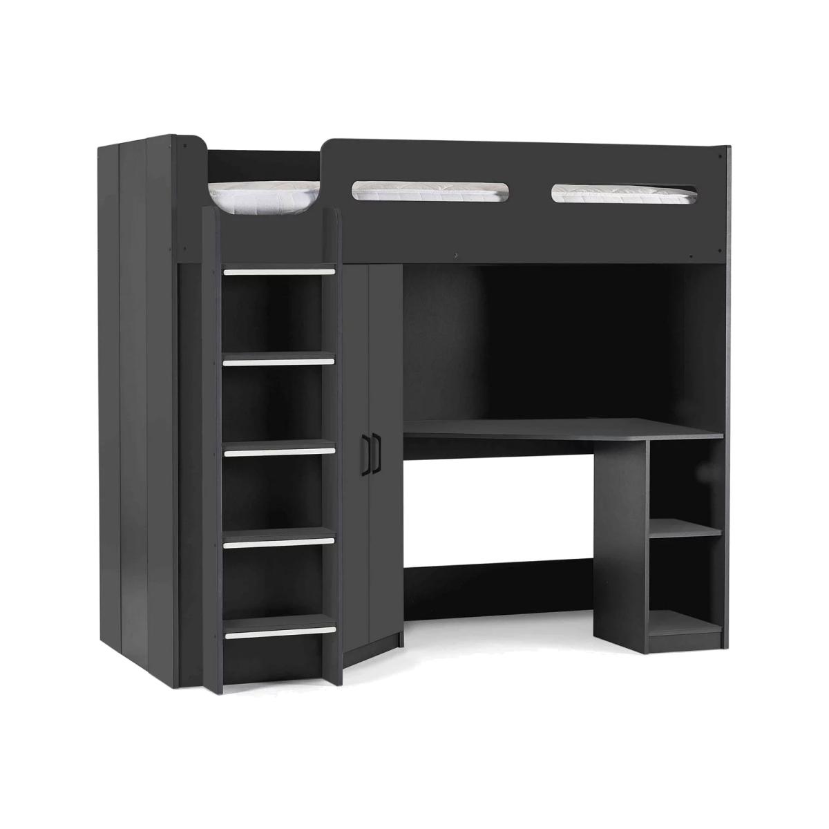 Designed with perfect functionality, the Julian Bowen Hercules High Sleeper - Anthracite is the ultimate bed for your child. The angled wardrobe provides ample space for clothing, whilst the built-in shelving is great for all their files, folders, trainers, or games to stay organised. With glow-in-the-dark steps, and colourways of woodgrain and anthracite, white, and anthracite, there is an option for any interior style. Features: Perfect functionality Built in angled wardrobe Built in Shelving Glow in the dark steps 12 month product guarantee. Dimensions: Height 172.8cm Width 96cm Depth 196.6cm All screens vary in colour reproduction and whilst every effort has been made to display the colour as accurately as possible it is for guidance only.