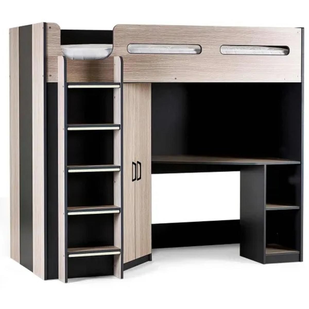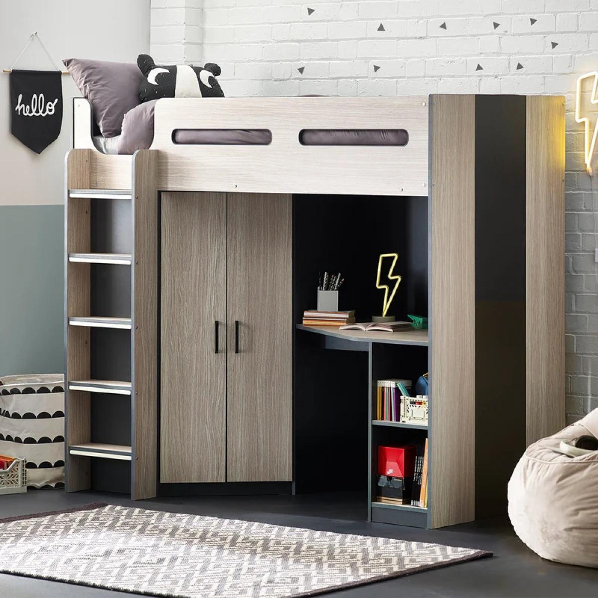 Create the ultimate multifunctional bedroom space with the Julian Bowen Hercules High Sleeper in a bold Woodgrain & Anthracite finish. Designed with modern families in mind, this innovative high sleeper is more than just a bed—it’s a fully integrated sleep, study, and storage solution tailored for growing children and compact spaces. The raised bed platform provides a cozy, elevated sleeping area complete with high side rails for safety and peace of mind. Beneath, a thoughtfully designed layout includes a spacious built-in wardrobe with a hanging rail, an open-shelving system for books, toys, or décor, and a sleek desk—perfect for homework, gaming, or creative projects. Finished in a contemporary combination of textured woodgrain and deep anthracite grey, the Hercules strikes the perfect balance between practicality and style, suiting a range of interiors from minimalist modern to urban industrial. Features: Perfect functionality Built in angled wardrobe Built in Shelving Glow in the dark steps 12 month product guarantee. Dimensions: Height 172.8cm Width 96cm Depth 196.6cm All screens vary in colour reproduction and whilst every effort has been made to display the colour as accurately as possible it is for guidance only.