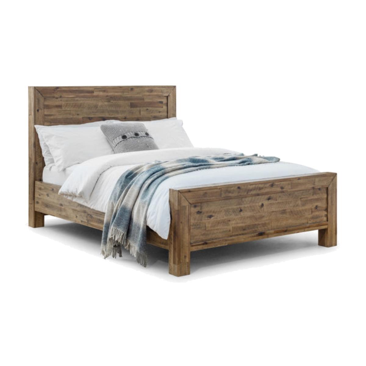 The Hoxton Bed is crafted from solid acacia, in a rustic oak finish and has a solid, unfussy design. Allowing the natural beauty of the wood to shine through with its distinctive lines, this contemporary bed is available in a 135cm double, 150cm king, and 180 cm sizes. Perfect for adding a touch of industrial chic to any bedroom. H:120 x W: 161. 6 x D: 220 x Head H: 120 x Foot H: 55. 5 cm. H:120 x W: 191. 6 x D: 220 x Head H: 120 x Foot H: 55. 5 cm.