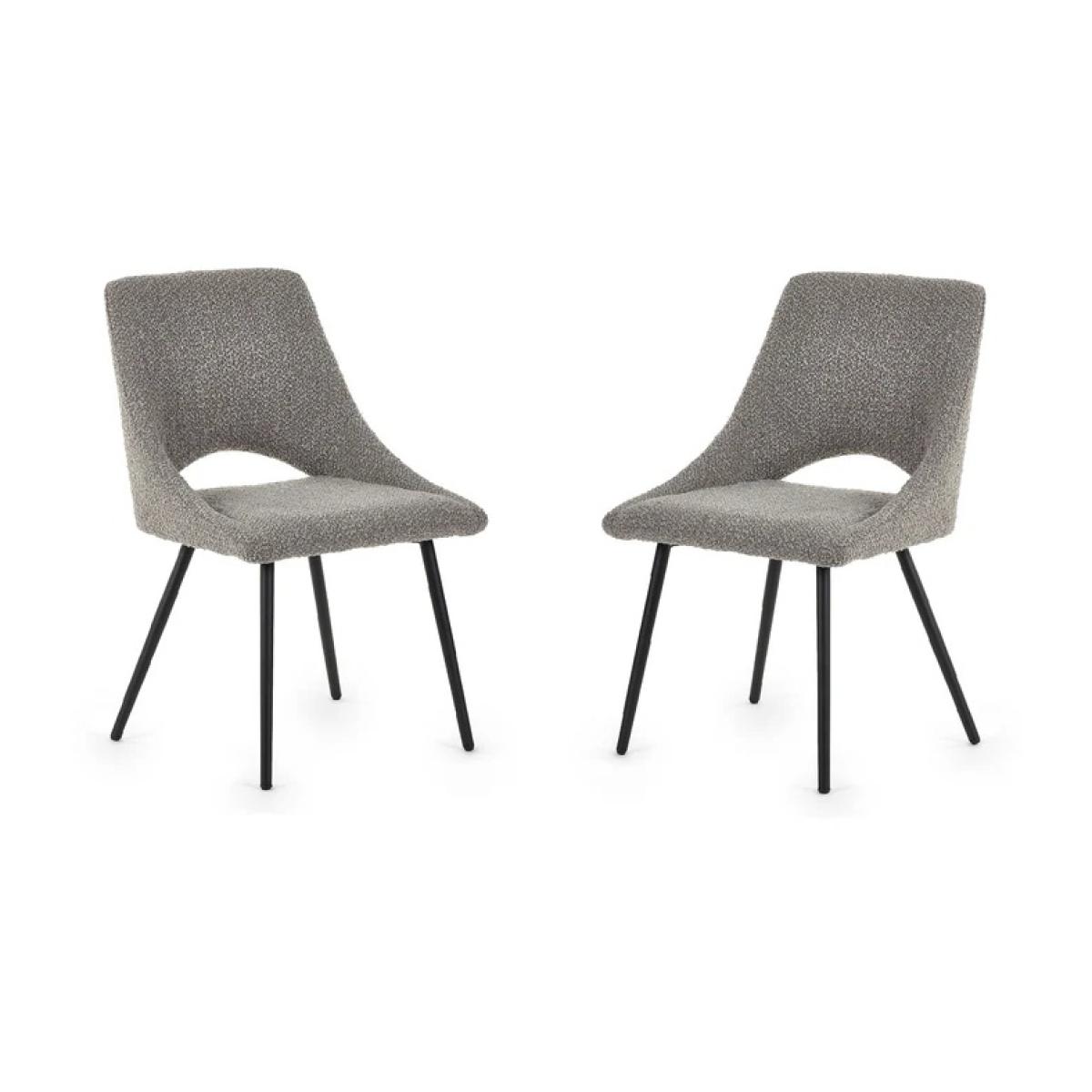 Add a touch of modern elegance to your dining space with the Iris Bouclé Dining Chair in Grey by Julian Bowen. Wrapped in a soft, textured bouclé fabric, this chair blends contemporary design with luxurious comfort, making it a standout addition to any home. The curved backrest and gently tapered black metal legs create a sleek silhouette, while the plush upholstered seat offers exceptional support—perfect for lingering dinners and everyday use alike. The soft grey hue complements a wide range of décor styles, from minimalist to Scandi chic, making it a versatile choice for modern interiors. Whether used as part of a dining set or as an accent chair, the Iris Bouclé Dining Chair delivers both style and substance with effortless charm. Features: Finished in a gorgeous grey boucle. Comfortable seat pad makes this product both comfortable and durable. Leaves a glamorous, retro look in your dining space. Contrast black legs make these chairs a stand out piece in your home. Home Assembly Required Dimensions: Height 84cm Width 61cm Depth 52cm All screens vary in colour reproduction and whilst every effort has been made to display the colour as accurately as possible it is for guidance only