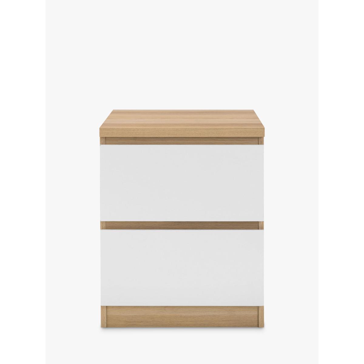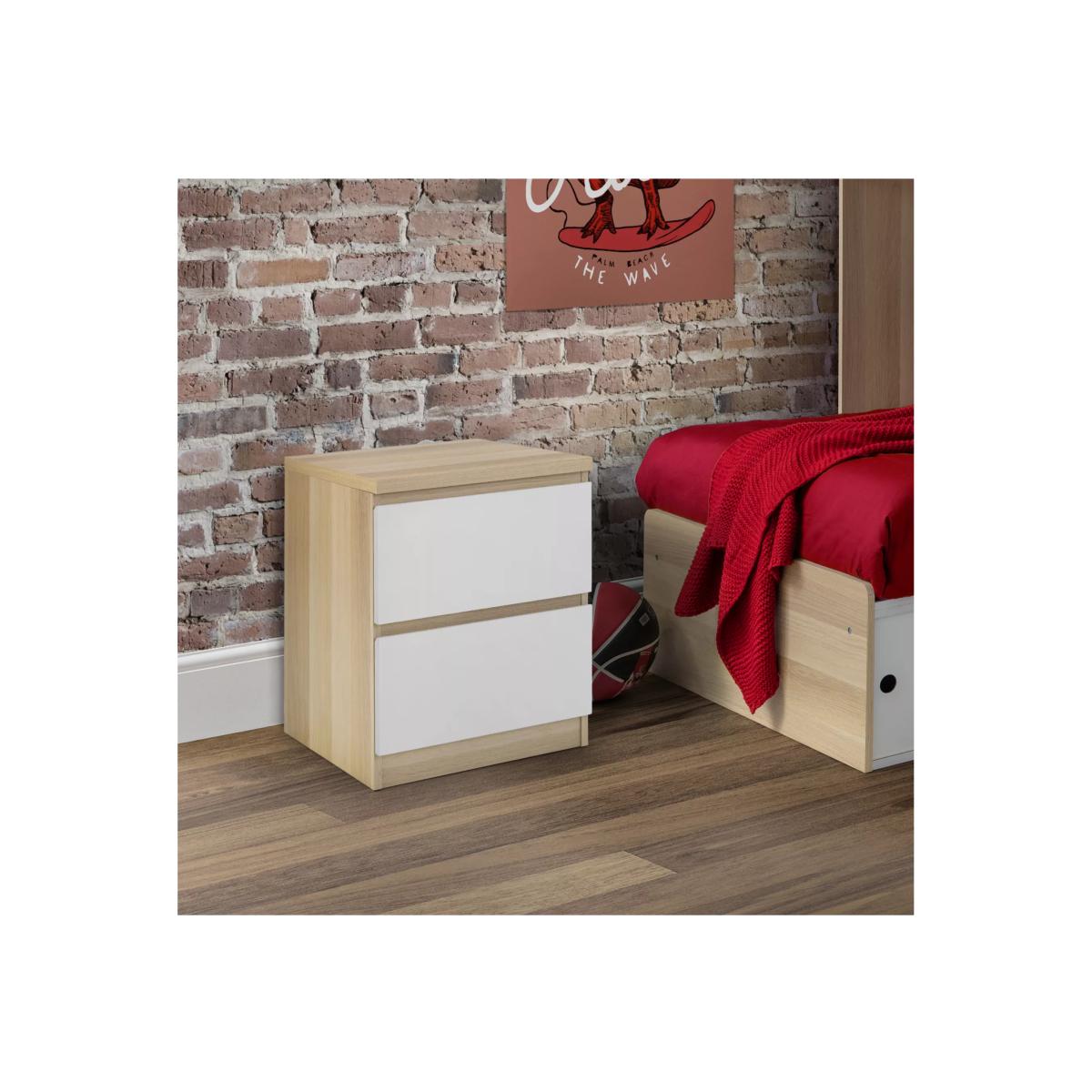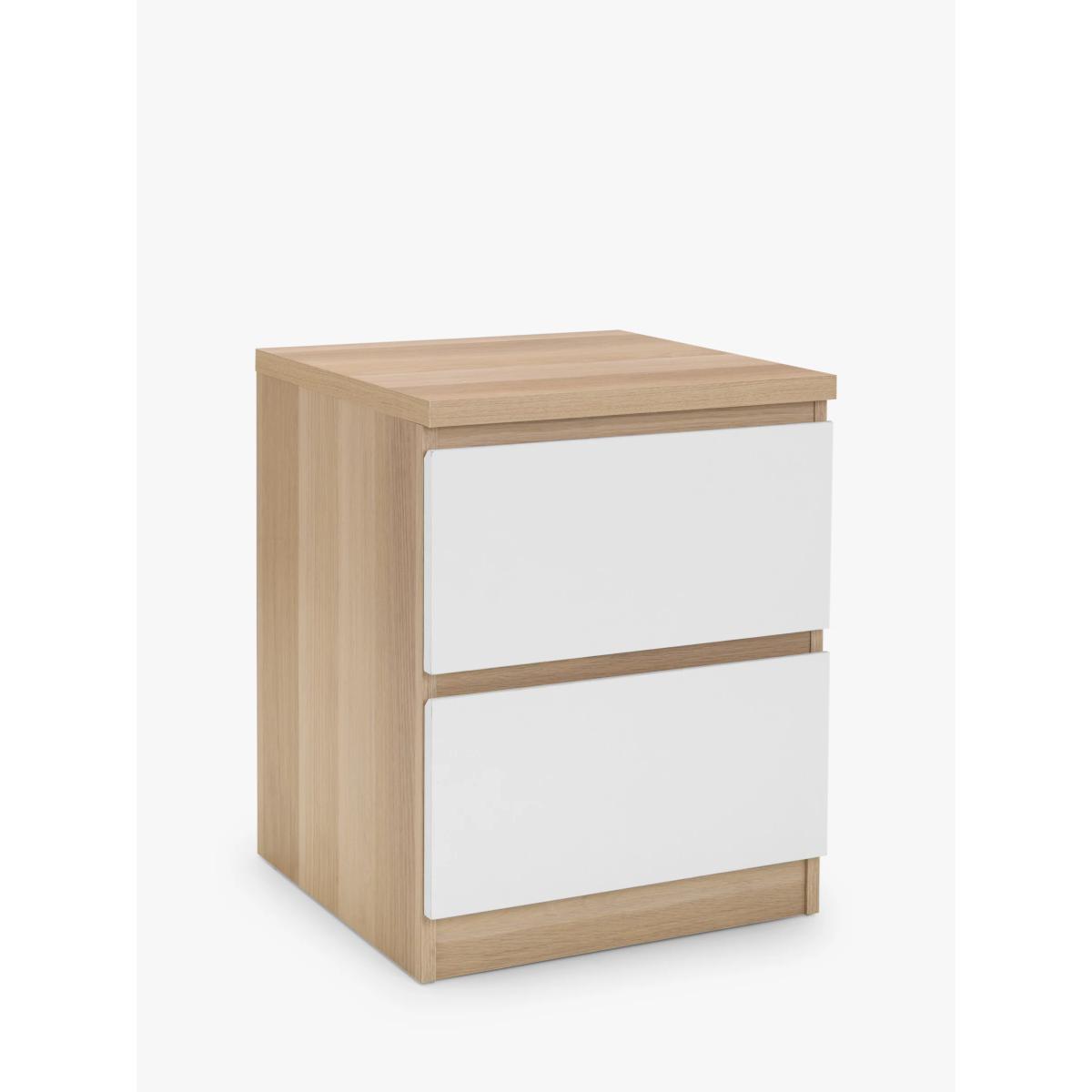 The Jupiter White & Oak bedroom collection is suitable for a wide range of modern bedrooms. The contemporary design features modern white high gloss drawer fronts and an oak effect frame. The Jupiter 2 drawer bedside table provides ample space for your bedside essentials./p> Want to see it first? You may want to see and get a feel for the furniture in one of our shops before ordering. We'll be able to tell you where the range you'd like to view is on display.