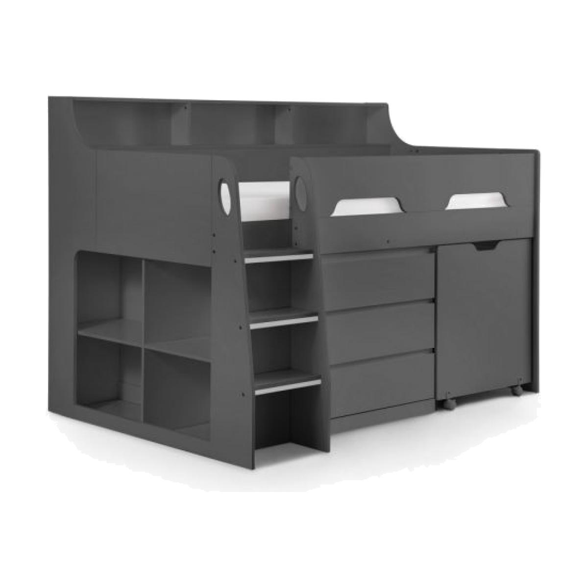 I’m a fan of the Jupiter midsleeper in anthracite for its clean lines and clever storage - it’s perfect for compact kids’ rooms. The dark slate finish works well in modern schemes, especially alongside monochrome or bold primary accents. A few brightly coloured cushions or a geometric rug will lift the look without spoiling its sleek appeal. For practical styling, slot in baskets on the open cubbies to keep toys tidy and add a small pegboard on the back panel for books or artwork. A string of soft LED lights along the top rail creates a snug bedtime atmosphere. Pair with pale-wood accents and neutral linens to balance the dark frame.