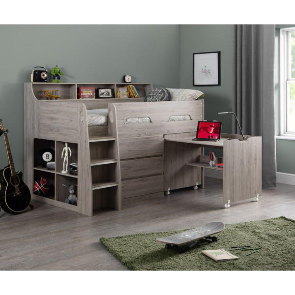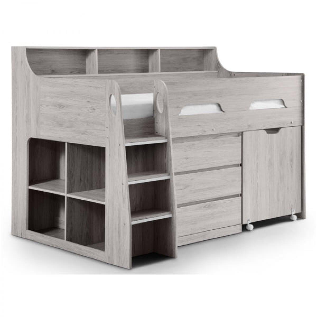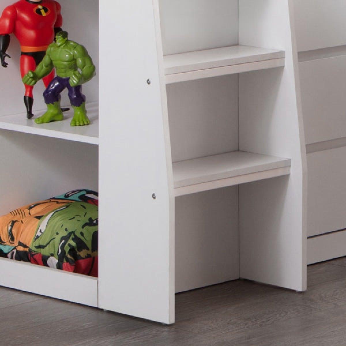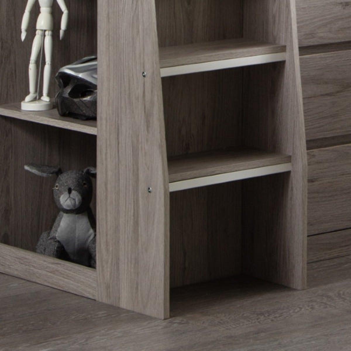 The Jupiter Midsleeper is an ideal space saver, featuring a chest of drawers, various shelves and a pull out desk. Available in two colour options, White or Grey Oak, the Jupiter is the perfect match for any kids bedroom, creating a fresh modern design. The robust ladder features beautiful cut out handles, with glow in the dark strips on the steps for added safety.