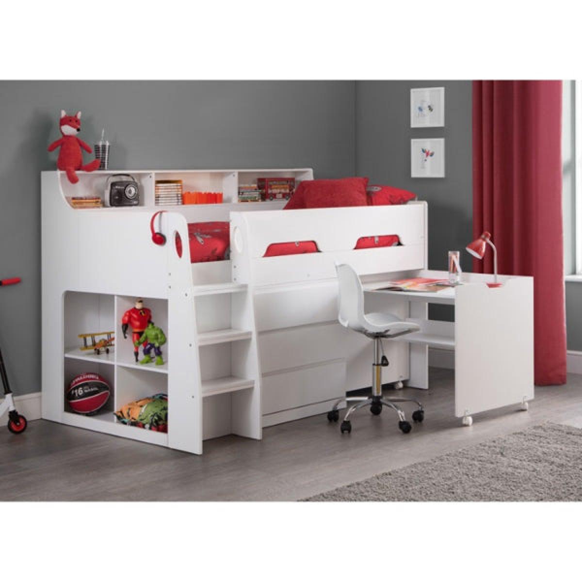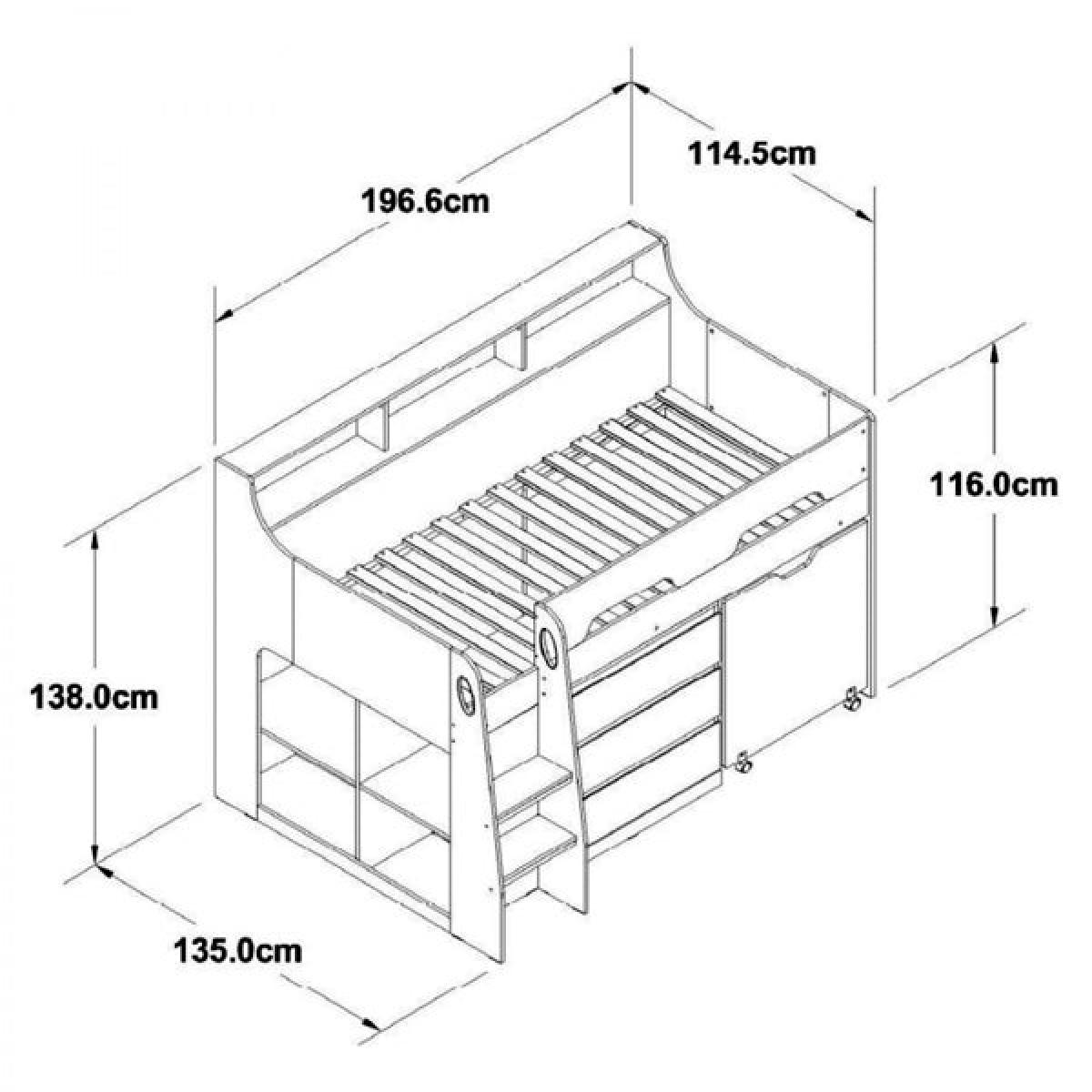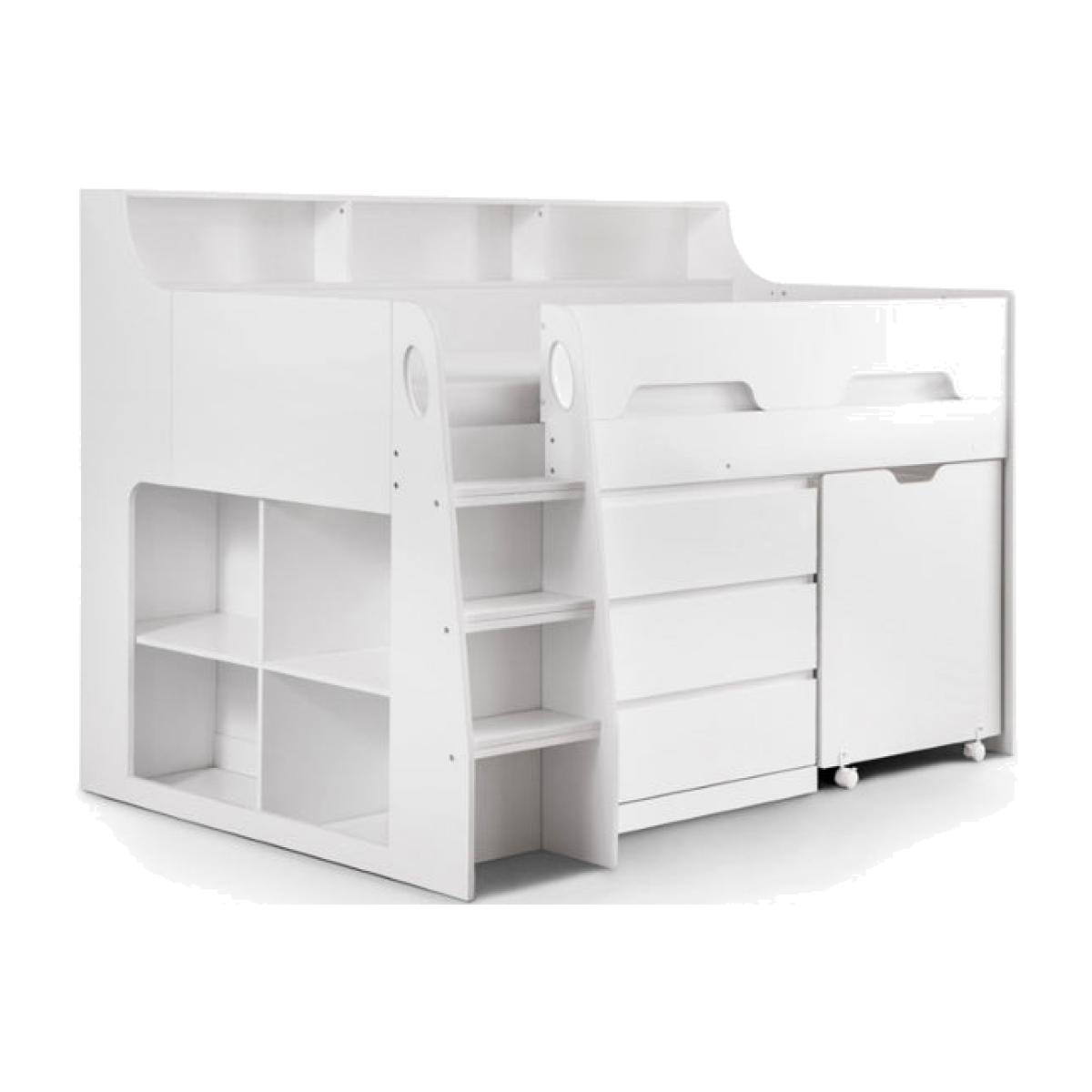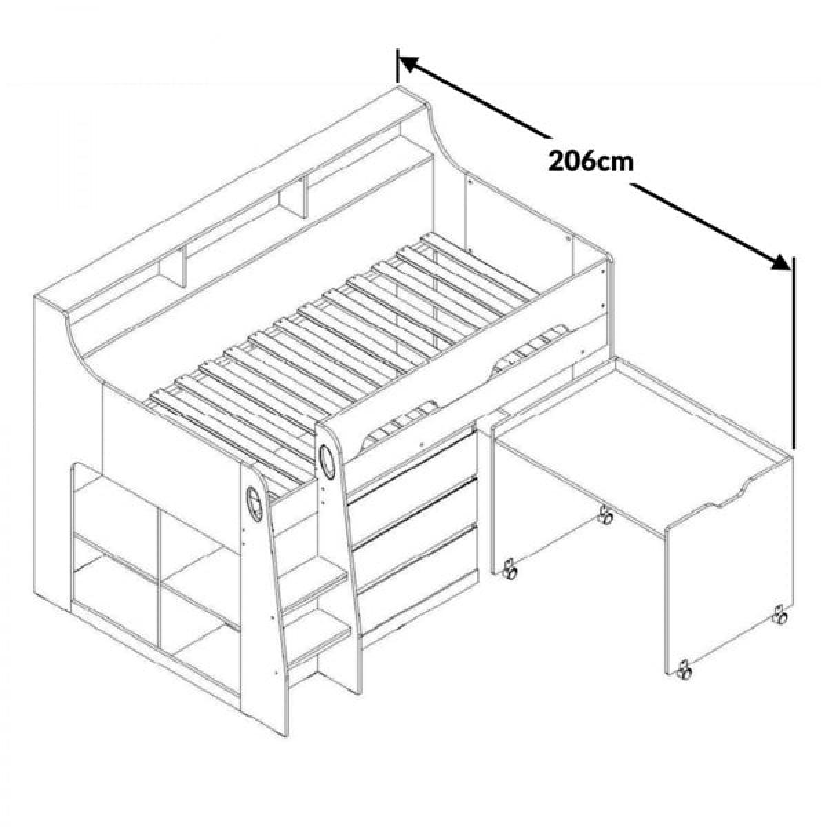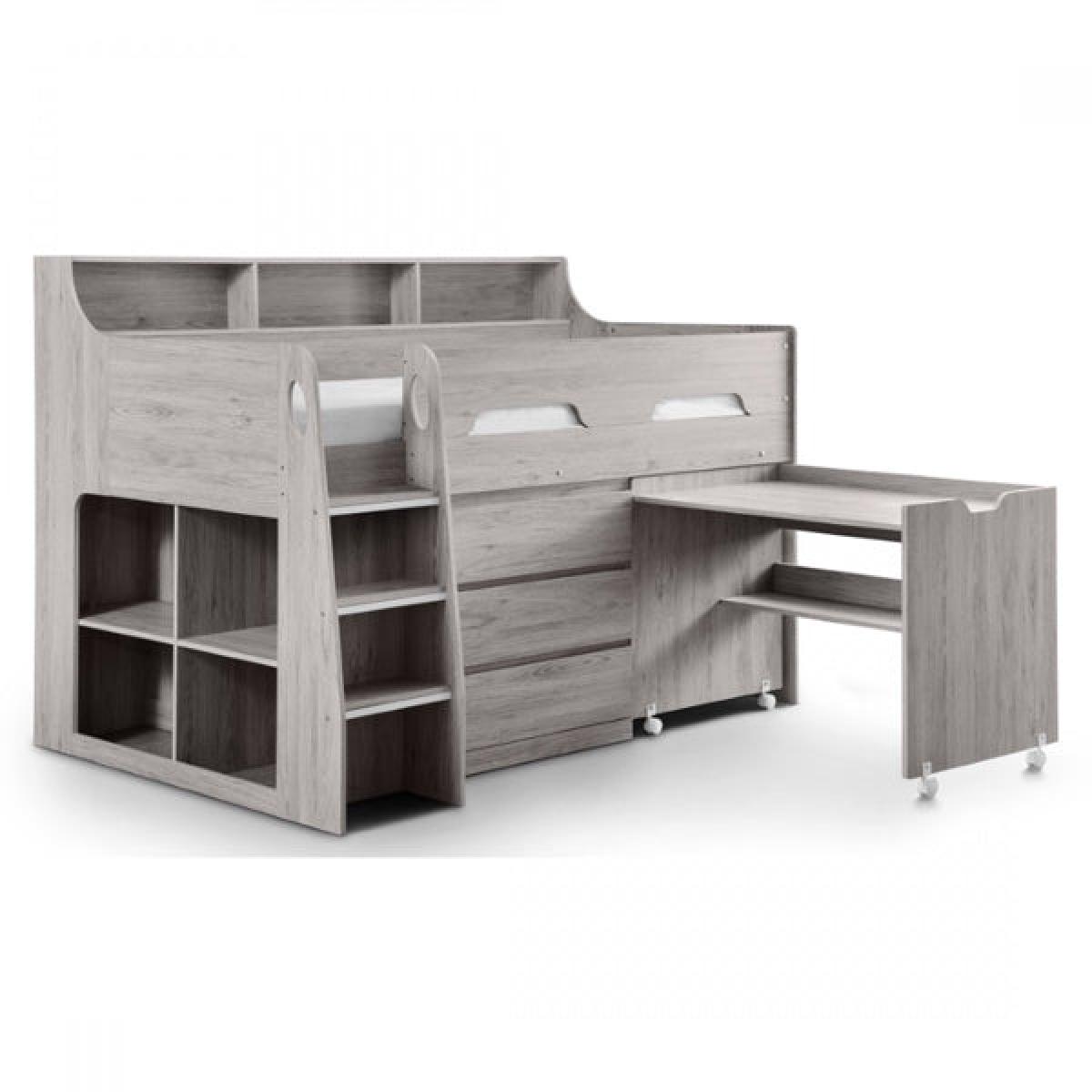 The Jupiter Midsleeper is an ideal space saver, featuring a chest of drawers, various shelves and a pull out desk. Available in two colour options, White or Grey Oak, the Jupiter is the perfect match for any kids bedroom, creating a fresh modern design. The robust ladder features beautiful cut out handles, with glow in the dark strips on the steps for added safety.