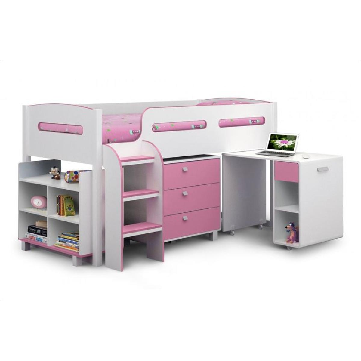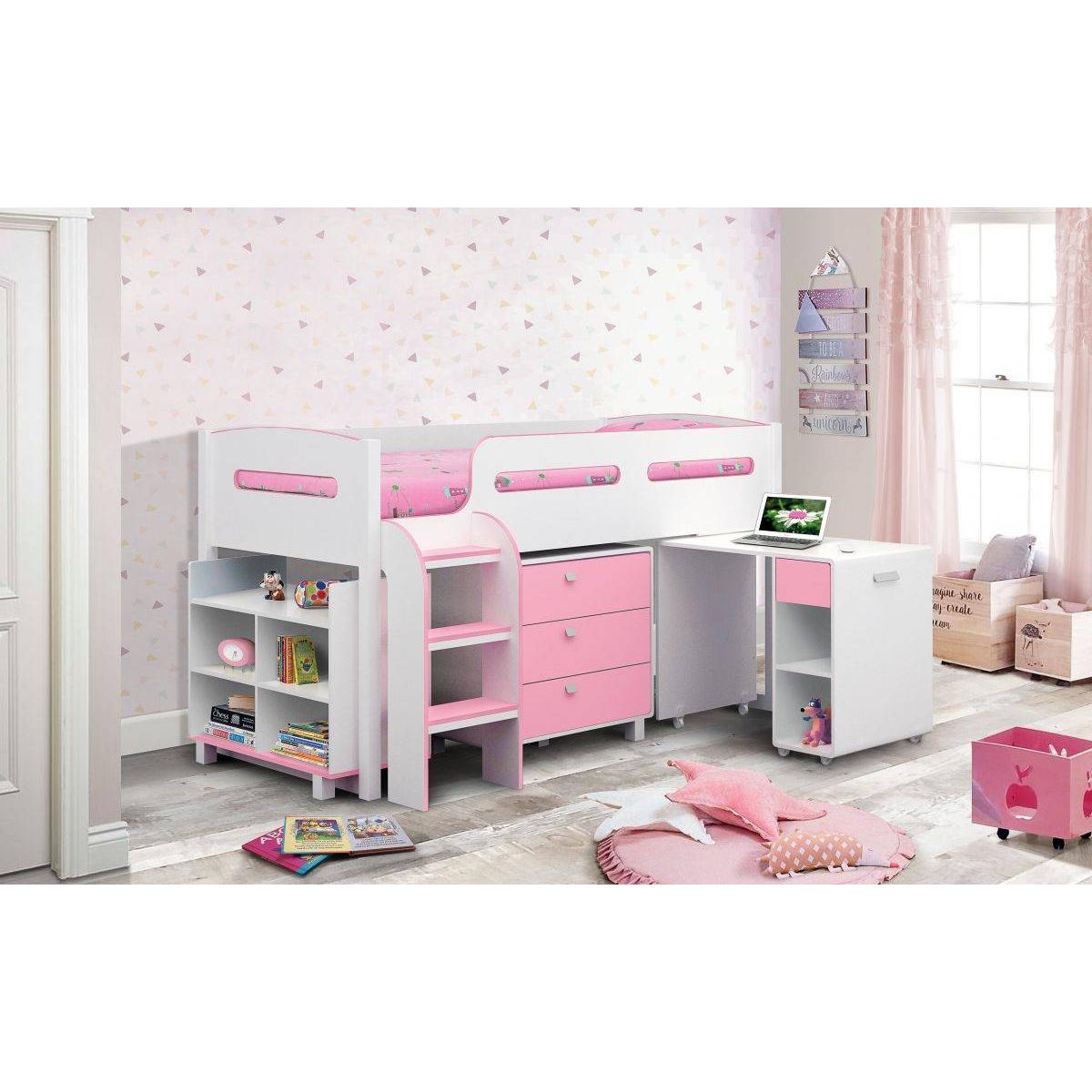 Available in white and soft pink and white and sky blue the Kimbo Cabin bed incorporates a whole host of features making the Kimbo Cabin Bed by Julian Bowen perfect for space limited rooms. Featuring an three drawer chest, hide away desk with drawer and shelf and a shelving unit that will all neatly pack away under the Kimbo Cabin bed. 90 x 190cm mattress size (sold separately) Un-assembled Coated particleboard, matt white and coloured coating with melamine edging Dimensions 203cm (L) x 120cm (W) x 115cm (H)