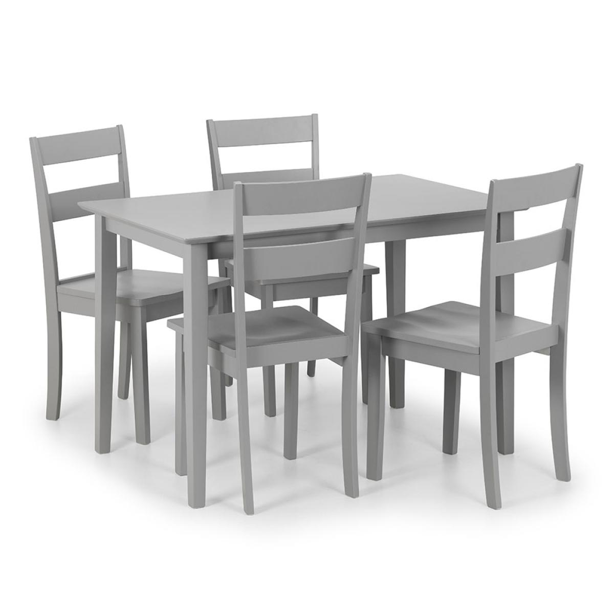 Stylish and uncomplicated; enjoy breakfast, lunch and dinner sat around the Kobe Dining Set from Julian Bowen. Including a compact, rectangular table, it would be well suited to smaller kitchens and dining areas. The 4 chairs have been designed with high backs and molded seats so you'll dine in comfort wherever your decide to pop yours! Finished in a gorgeous cool grey colourway, the Kobe table and chairs set will fit perfectly with your existing furniture and decor.