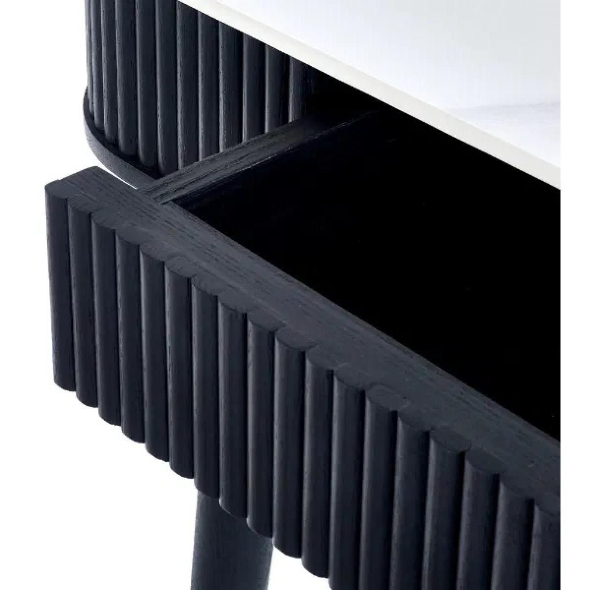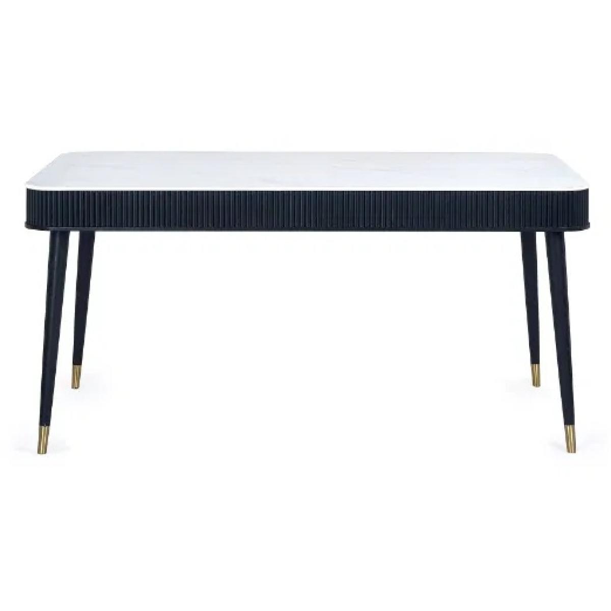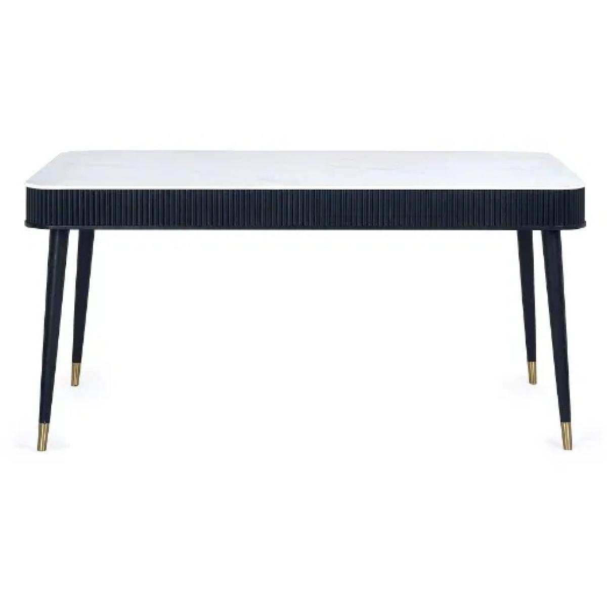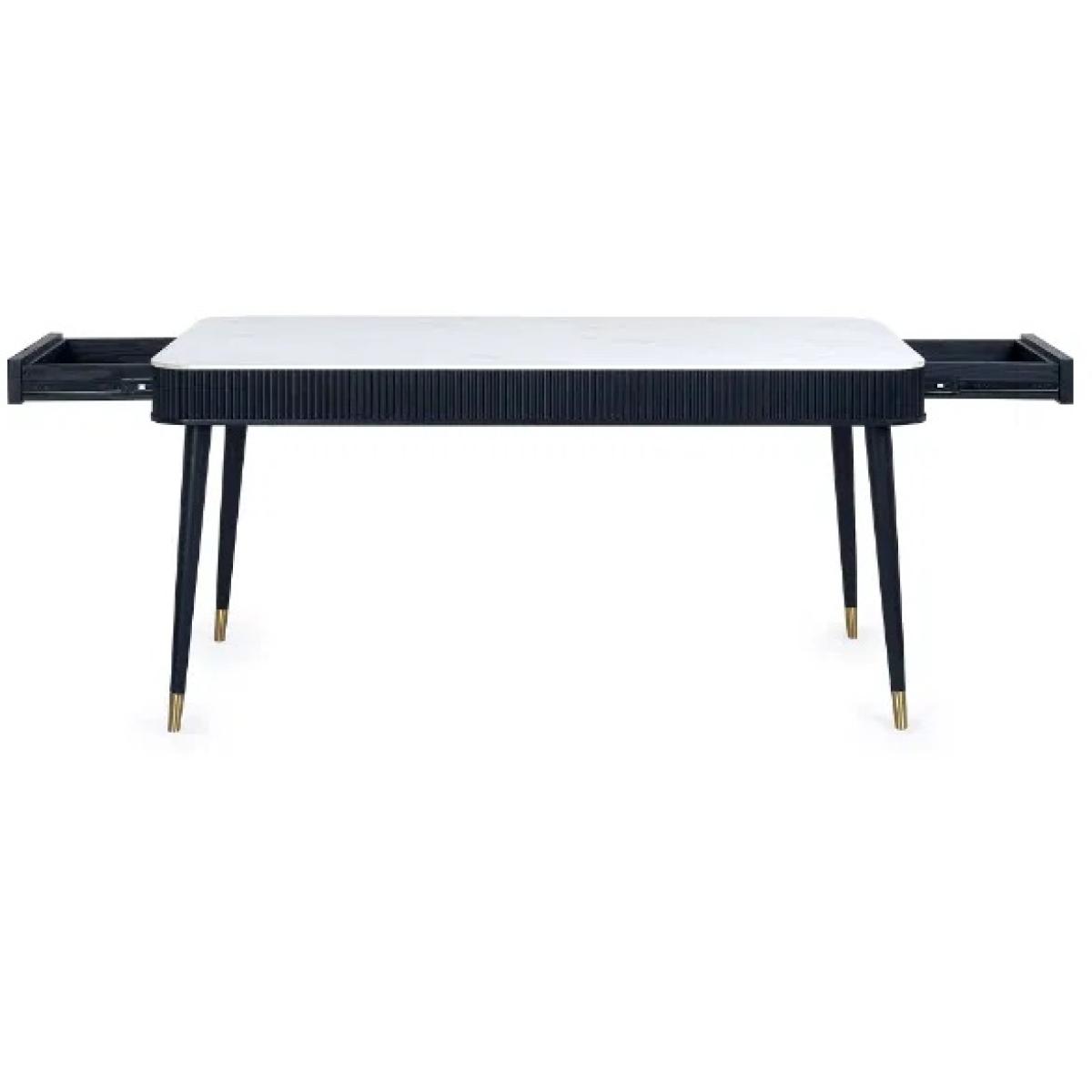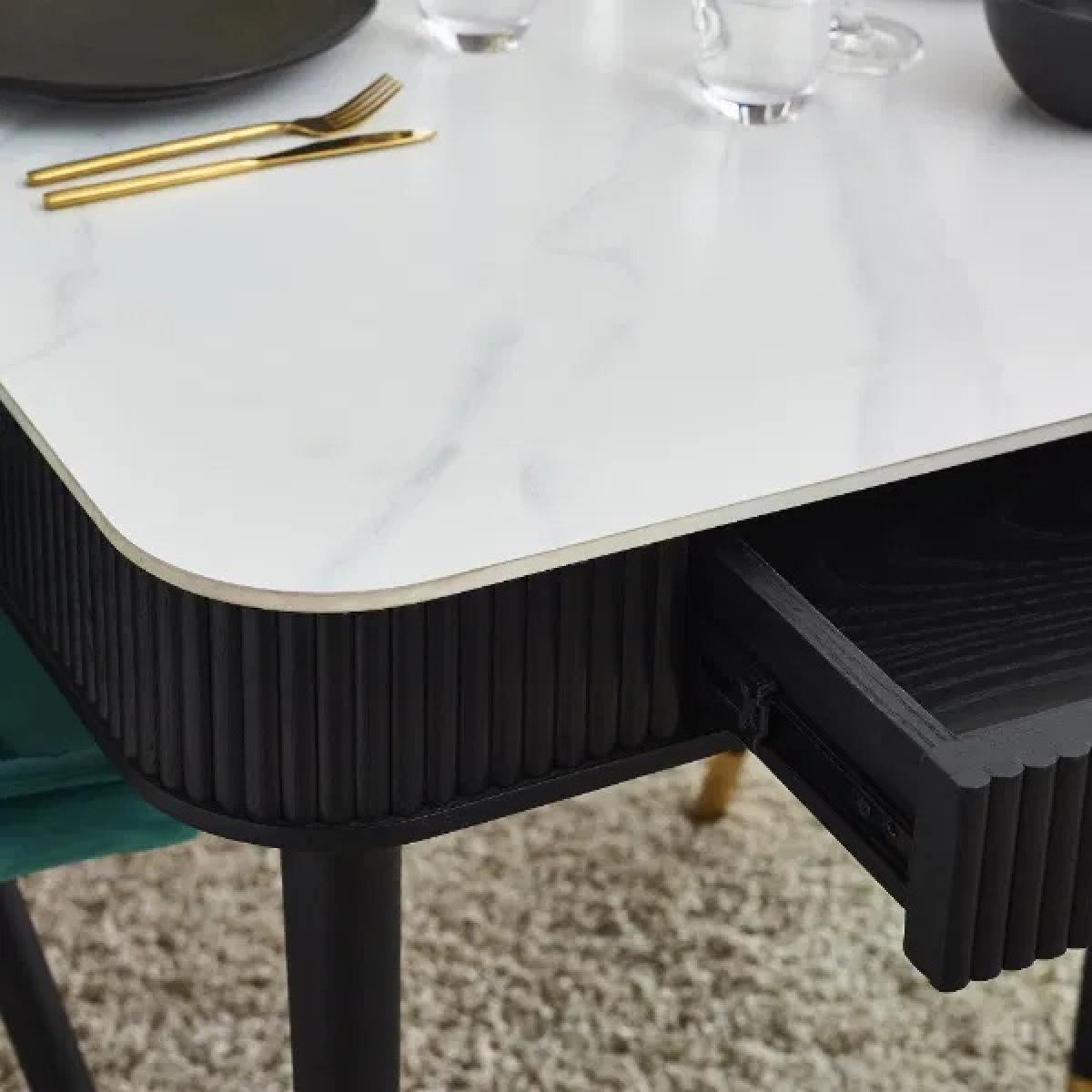 Bring refined sophistication to your dining area with the Louis Fluted Stone Top Dining Table by Julian Bowen. This statement piece features a luxurious white marble-effect stone top, beautifully contrasted by matt black fluted edging for a truly elegant finish. The table’s gently tapered legs, detailed with gold metal tips, lend a touch of glamour, while the built-in drawers offer practical storage for tableware or everyday essentials. Perfect for both stylish entertaining and everyday dining, this piece blends opulence with functionality. Minimal assembly is required for a hassle-free setup. Features: Luxurious white marble-effect stone top Sophisticated matt black fluted edging Elegant tapered legs with gold detailing Two integrated drawers for discreet storage Ideal for modern or contemporary interiors Minimal assembly required Dimensions: Height: 77cm Depth: 90cm Width: 190cm Please note All screens vary in colour reproduction and whilst every effort has been made to display the colour as accurately as possible it is for guidance only.