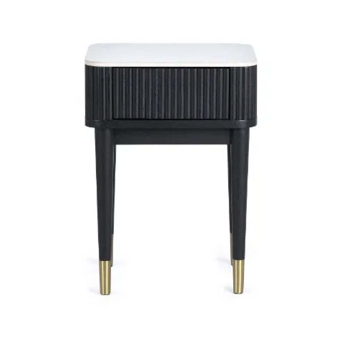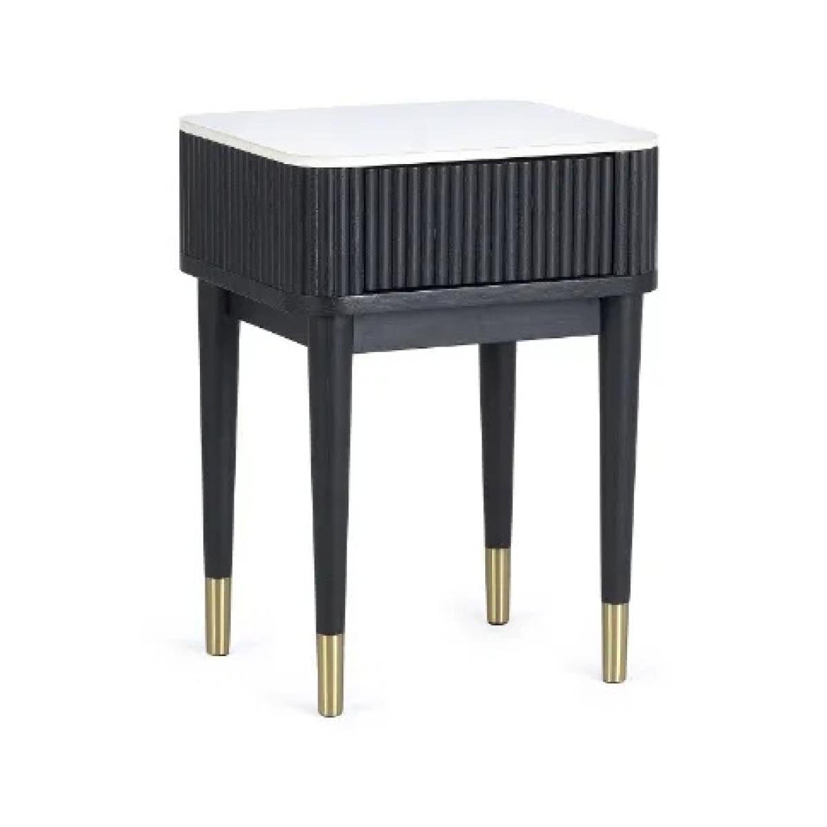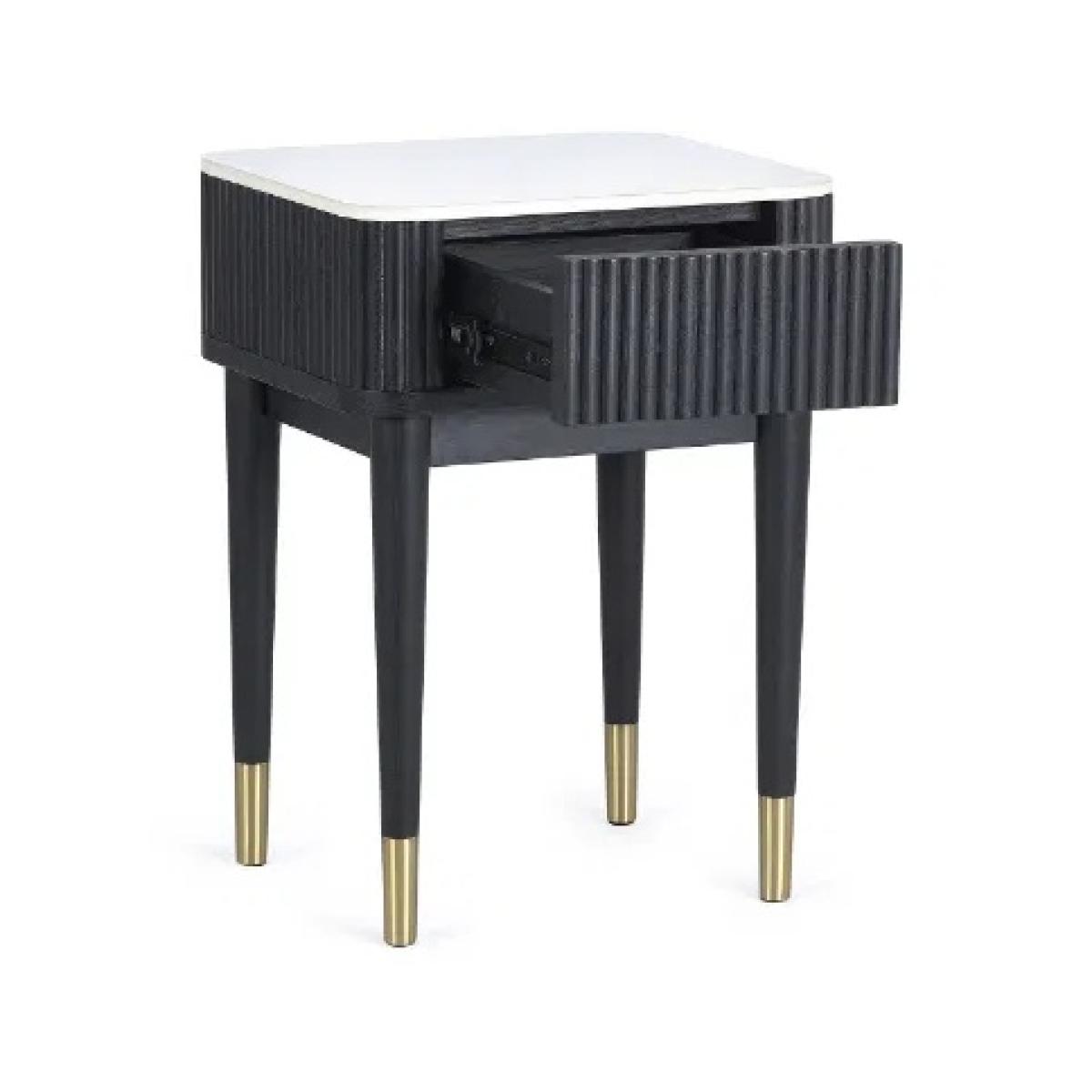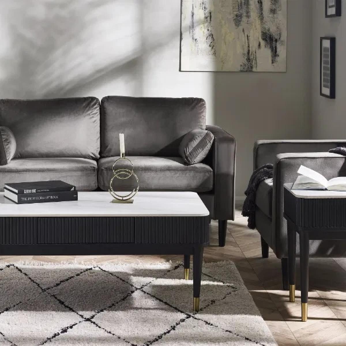Add a touch of refined elegance to your home with the Louis Fluted Stone Top Lamp Table with Drawers by Julian Bowen. This stunning piece combines modern sophistication with everyday practicality, making it the perfect addition to any stylish living space. The table features a luxurious white marble-effect stone top, framed by striking matt black fluted edging. Elegant gold-tipped tapered legs provide a subtle hint of glamour, while two discreet push-touch drawers offer hidden storage for everyday essentials. Whether placed beside a sofa or used as a bedside companion, this lamp table makes a chic and functional statement. Minimal assembly required. Features: White marble-effect stone top for a luxurious finish Stylish matt black ribbed edging Two push-touch drawers for hidden storage Sleek, tapered legs with gold metal tips Elegant and functional design suitable for any room Simple assembly required Dimensions: Height: 56cm Depth: 35cm Width: 40cm Please note All screens vary in colour reproduction and whilst every effort has been made to display the colour as accurately as possible it is for guidance only.