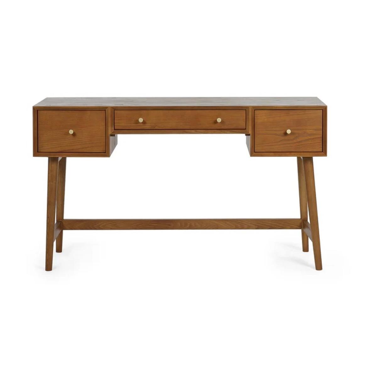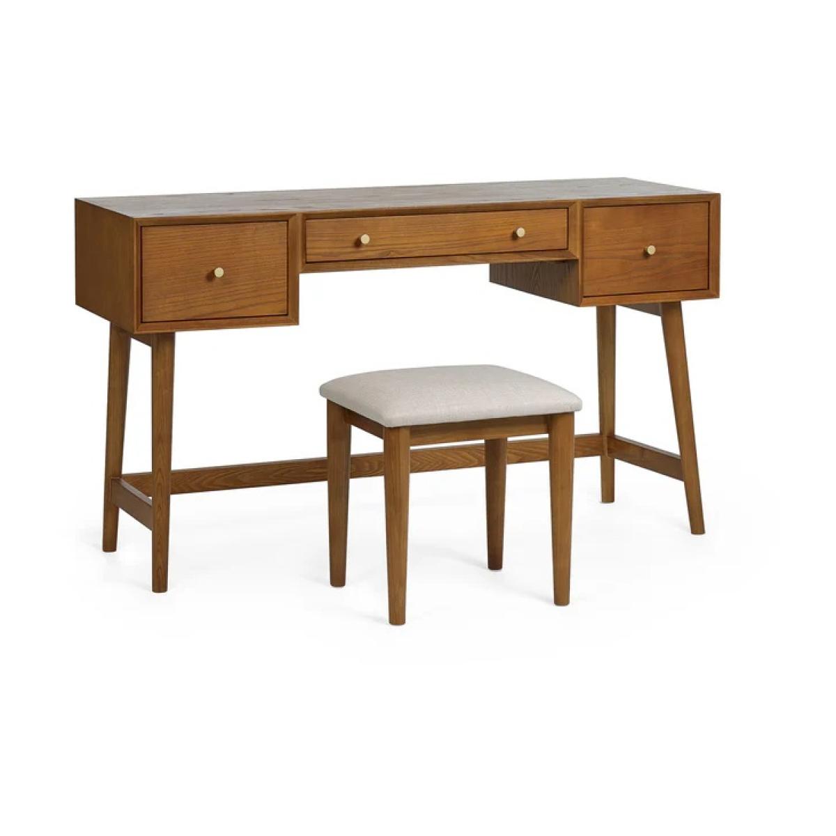 Bring contemporary charm and practical elegance to your bedroom with the Julian Bowen Lowry Dressing Table & Stool Set. Designed with clean lines, a modern two-tone finish, and a minimalist aesthetic, this chic set creates a stylish space to get ready, organise beauty essentials, or even work from home. The dressing table features two spacious drawers—perfect for makeup, jewellery, or everyday accessories—while the matching cushioned stool offers comfort and completes the look. Crafted for durability and visual appeal, the Lowry set pairs function with finesse, making it a standout addition to modern bedrooms or dressing areas. Features: A gorgeous retro-inspired design Constructed from an exquisite cherry ash wood veneer Featuring two wide pull-out drawers & one narrow drawer Upholstered padded Stool 12 month product guarantee. Full Assembly Required Dimensions: Height 76cm Width 132cm Depth 44cm All screens vary in colour reproduction and whilst every effort has been made to display the colour as accurately as possible it is for guidance only.