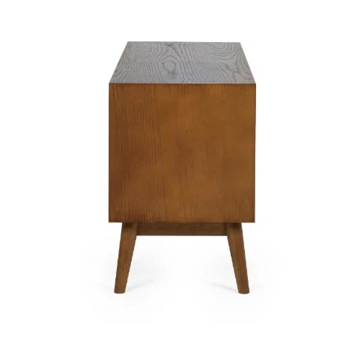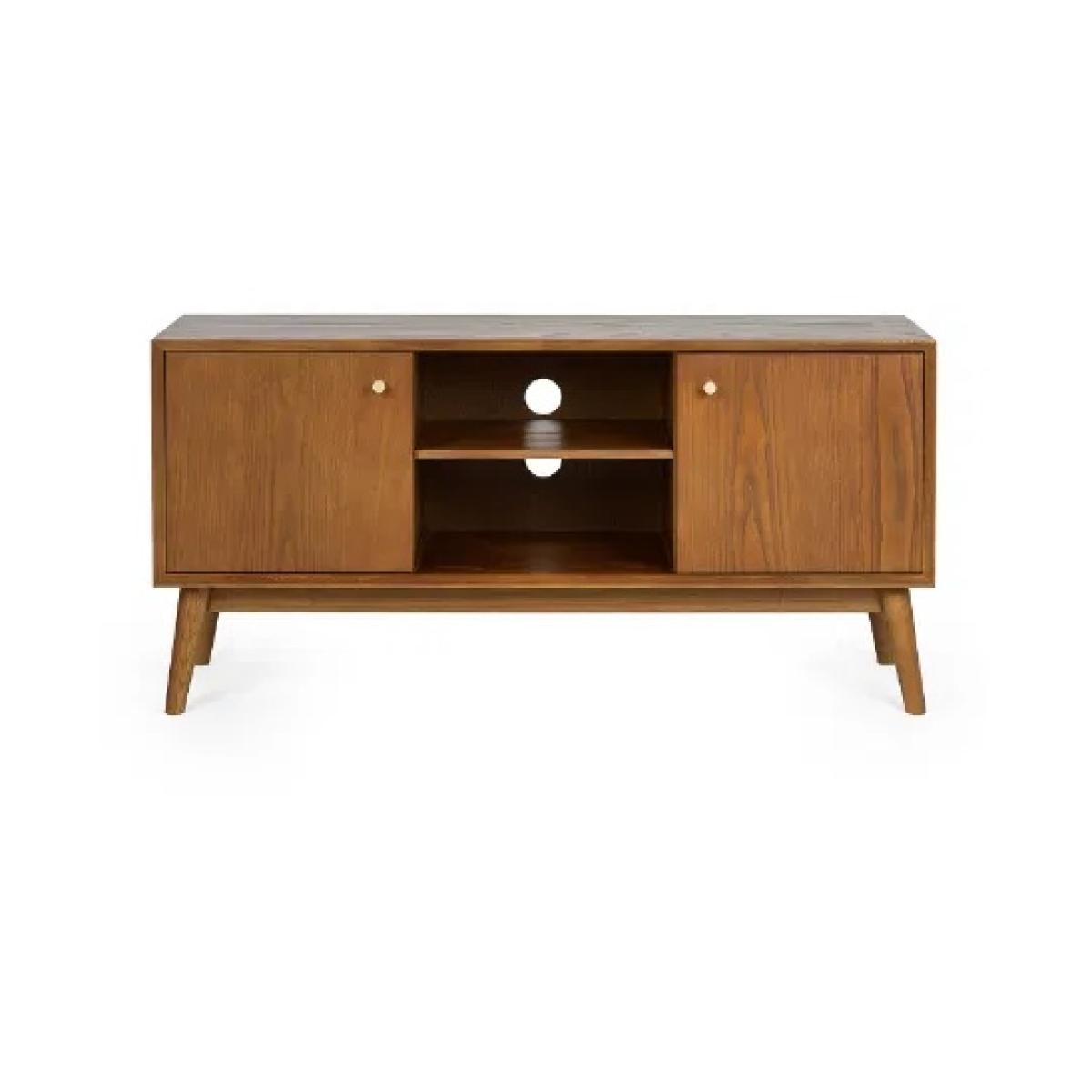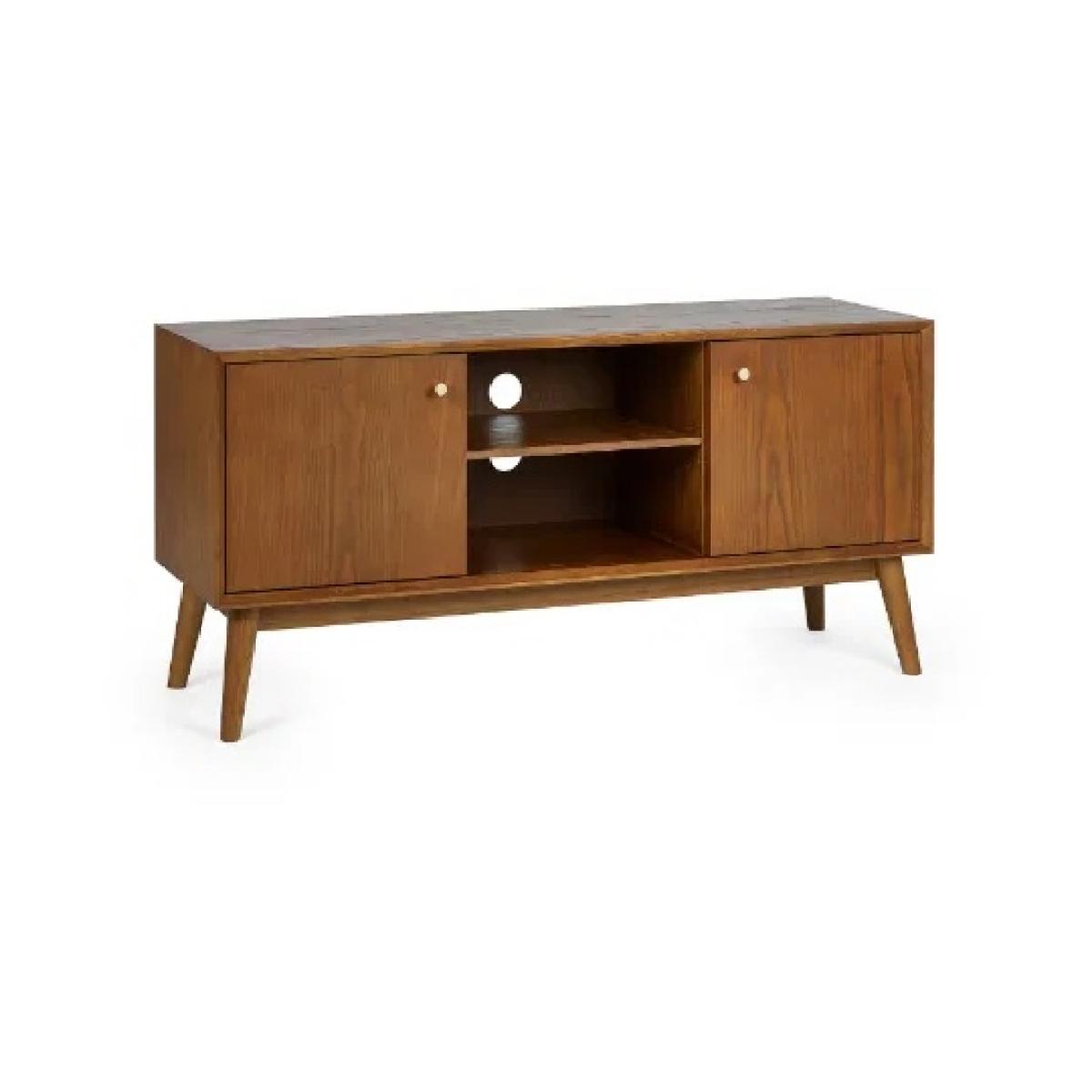 Bring a touch of mid-century elegance to your living space with the Julian Bowen Lowry Media Unit. Showcasing a retro-inspired design, this striking piece is crafted from a rich cherry ash wood veneer and finished with beautifully tapered legs, creating a timeless and sophisticated look. The unit features two soft-touch cupboard doors with internal shelving, providing ample storage for consoles, remotes, and media accessories. Golden framed knobs add a refined finish, making this a stylish and functional centrepiece for any lounge or entertainment area. Features: Retro-inspired design with cherry ash wood veneer Two soft-touch cupboards with interior shelves Ideal for housing media devices and accessories Elegant gold-framed knobs for a refined finish Tapered legs for a classic mid-century silhouette A perfect blend of style and practicality for modern homes Dimensions: Height: 50cm Width: 120cm Depth: 40cm Please note All screens vary in colour reproduction and whilst every effort has been made to display the colour as accurately as possible it is for guidance only.