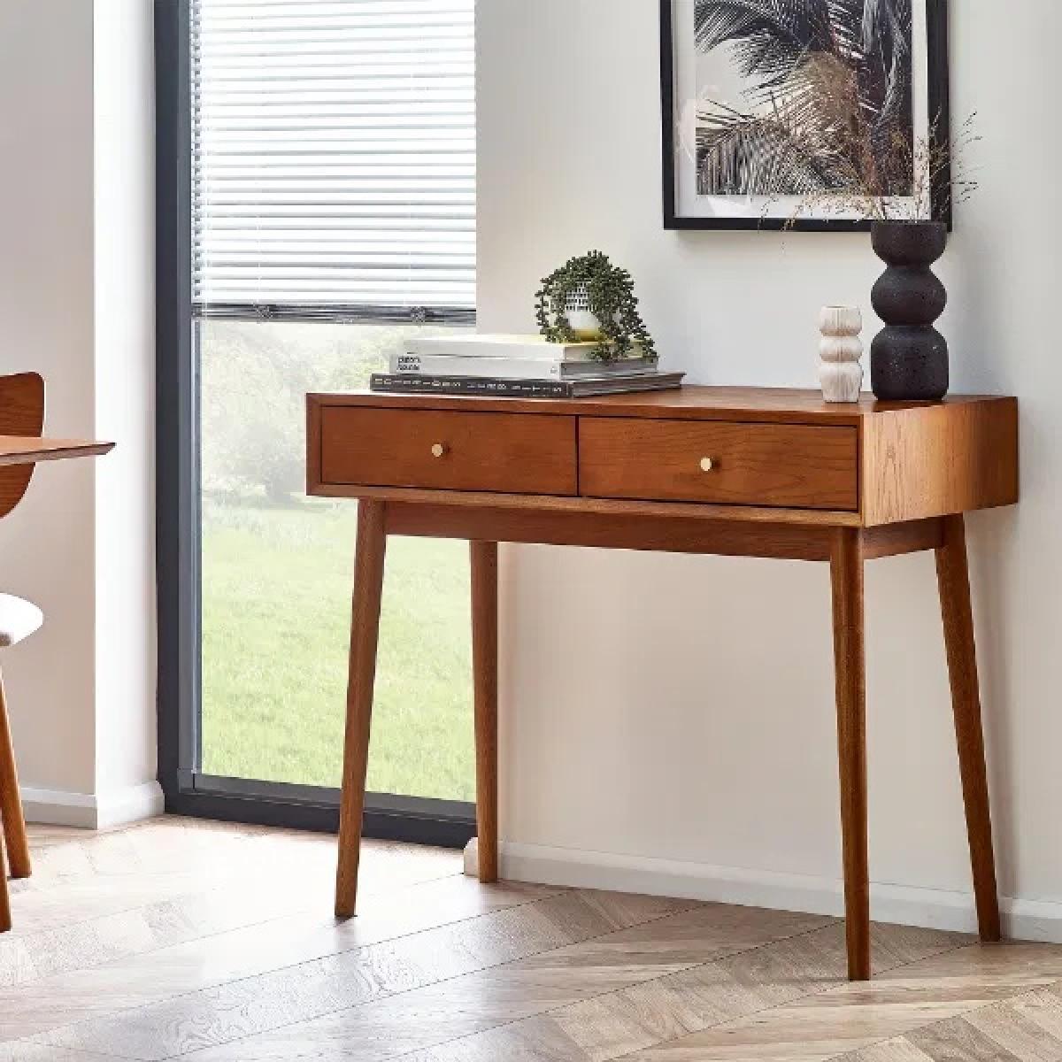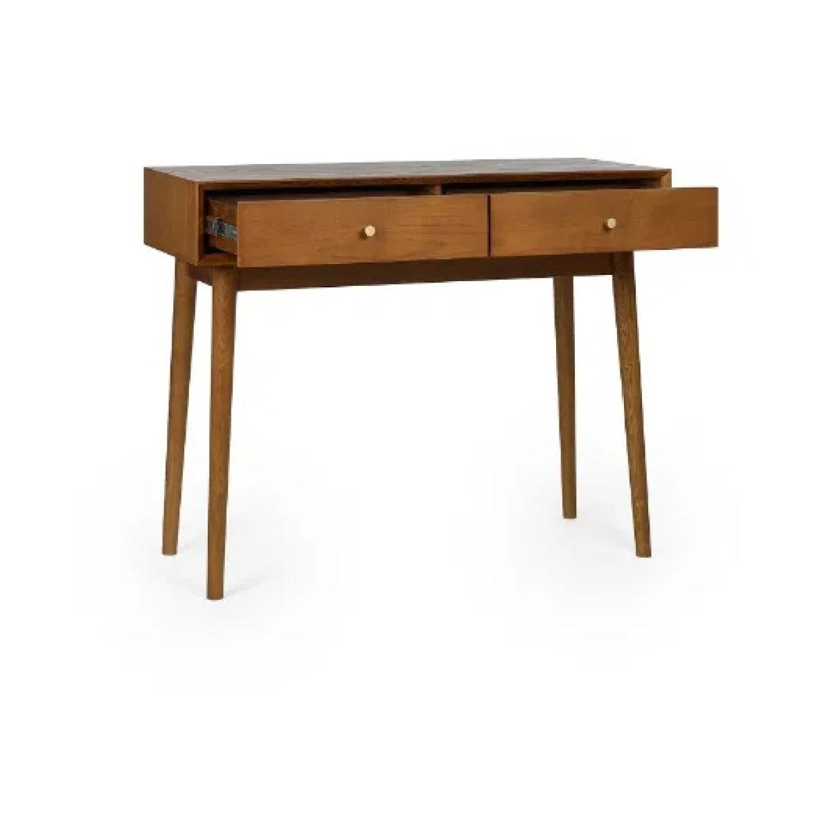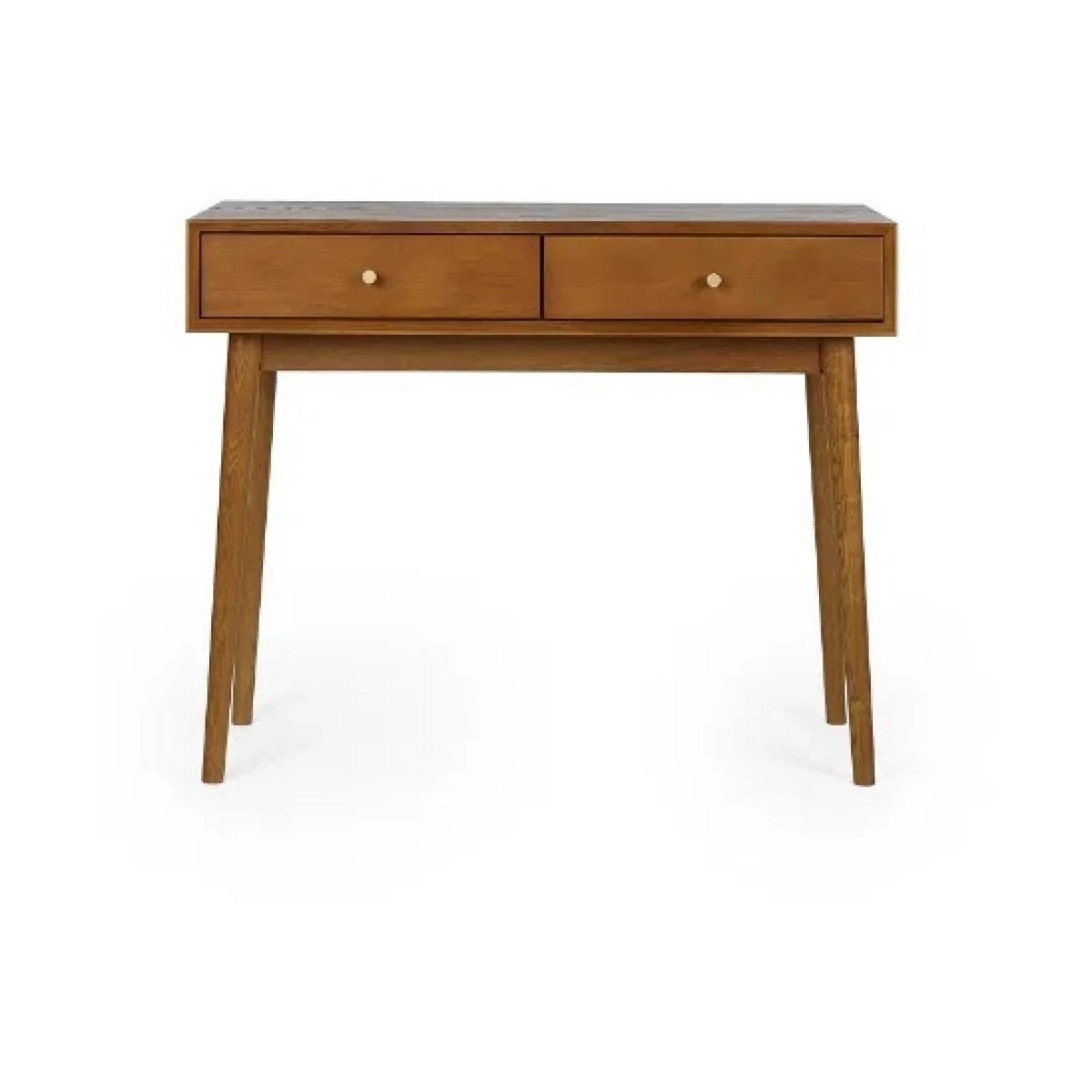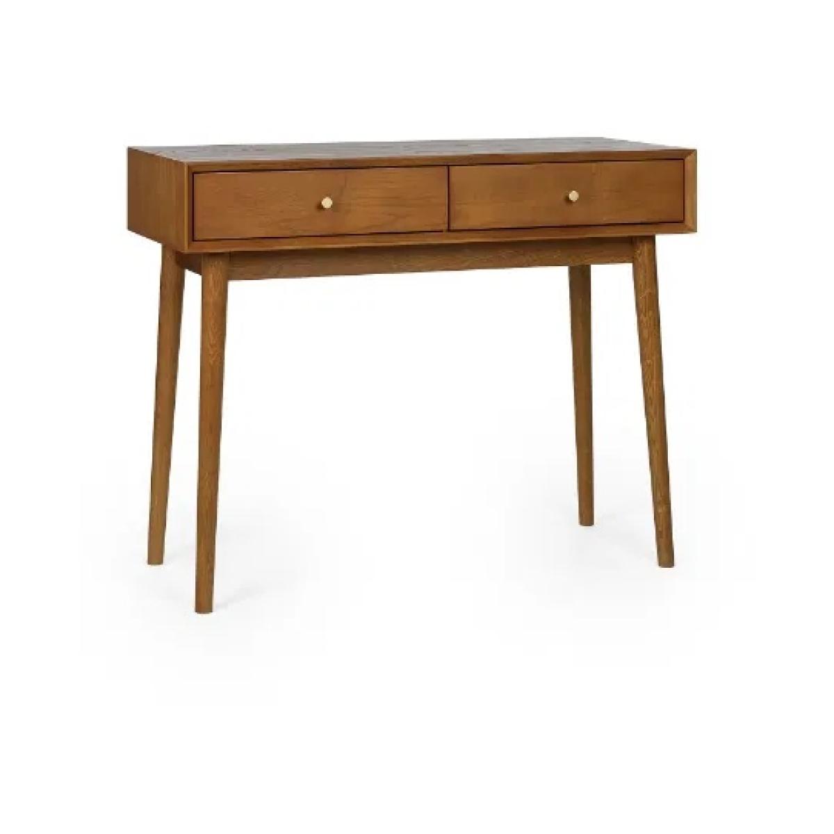 Bring a touch of retro charm to your home office with the Julian Bowen Lowry Writing Desk. Featuring a nostalgic design and timeless aesthetic, this elegant desk is crafted from a rich cherry ash wood veneer and stands on beautifully tapered legs for a refined finish. With two spacious pull-out drawers, each adorned with gold-framed knobs, this desk offers practical storage for stationery and workday essentials, keeping your space both stylish and organised. A perfect addition to any modern or traditional interior, and part of the wider Julian Bowen Lowry Dining and Occasional Collection. Features: Retro-inspired writing desk with cherry ash wood veneer Two pull-out drawers with gold-framed knobs Beautifully tapered legs for a classic mid-century feel Ideal for home office or study spaces Coordinates with the Julian Bowen Lowry collection Dimensions: Height: 80cm Width: 100cm Depth: 45cm Please note All screens vary in colour reproduction and whilst every effort has been made to display the colour as accurately as possible it is for guidance only.