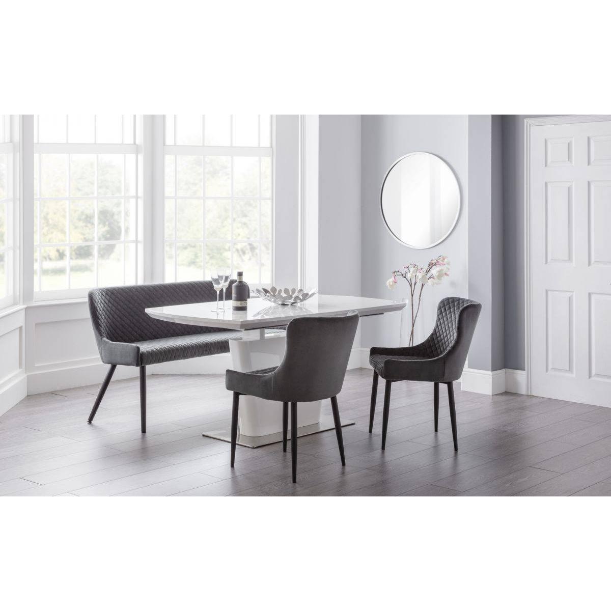 The Luxe High Back Bench offers a classic style with a modrn twist, beautifully upholstered in a modern grey velvet with a luxuriant quilted finish offering depth and texture. This bench is perfect use for dining or a striking focal point for any room. Dimensions: 62cm (D) x 143cm (W) x 82.5cm (H)Assembly required.