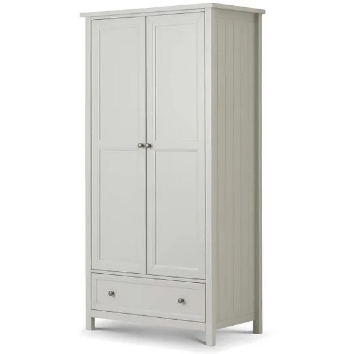 Bring classic charm and smart storage into your bedroom with the Julian Bowen Maine 2 Door Combination Wardrobe in a soft dove grey finish. Inspired by traditional New England styling, this wardrobe features elegant panelled doors, brushed metal handles, and a calming grey tone that suits both modern and classic interiors. Behind the double doors, you’ll find ample hanging space for clothes, while the lower drawer offers additional room for folded garments or accessories. Built from durable MDF with a smooth lacquered finish, this combination wardrobe is both sturdy and stylish—perfect for keeping your space tidy with timeless elegance. Features: 2-door wardrobe with integrated storage drawer Finished in Dove Grey for a modern, versatile look Full-width hanging rail for optimal garment storage Traditional shaker-style panelled doors Sturdy MDF construction with brushed metal handles Matches other pieces in the Julian Bowen Maine bedroom range Full assembly required Dimensions: Height 190cm Width 97cm Depth 55cm All screens vary in colour reproduction and whilst every effort has been made to display the colour as accurately as possible it is for guidance only.