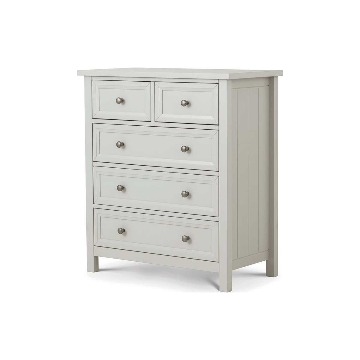 With its classic styling, the Maine 3+2 Chest of Drawers from Julian Bowen will have no trouble blending seamlessly into your interior style. Available in a choice of colours with a lacqeur finish and beautiful panelling detail at the sides, this dressing table has a timeless look that will add a touch of class to any bedroom in your home. With two drawers above three larger drawers, there is plenty of storage space in this beauty plus everything can be organised to perfection. Jumpers in one drawer, jeans in the next, undies and socks at the top - ideal. Pair with other pieces from the Maine collection to give your bedroom a complete makeover.