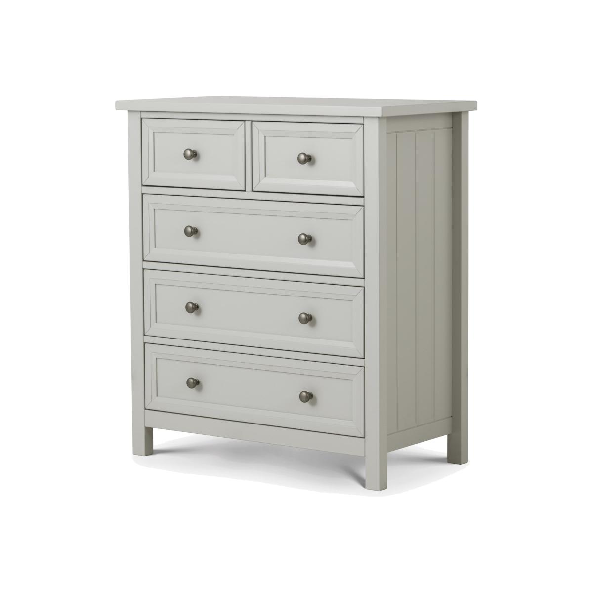Small Drawers 28.5cm x 33.5cm x 15cm Large Drawers 64.5cm x 33.5cm x 15cm Maine is an elegant New England style range of bedroom furniture. The combination of exquisite dove grey lacquered finish with characteristic side panelling and detailed chamfered cabinetry makes for a soothing and refined aesthetic with timeless appeal, while delicate pewter handles add the perfect finishing touch. The Maine 3+2 drawer chest offers great storage with three large drawers topped with two smaller drawers.