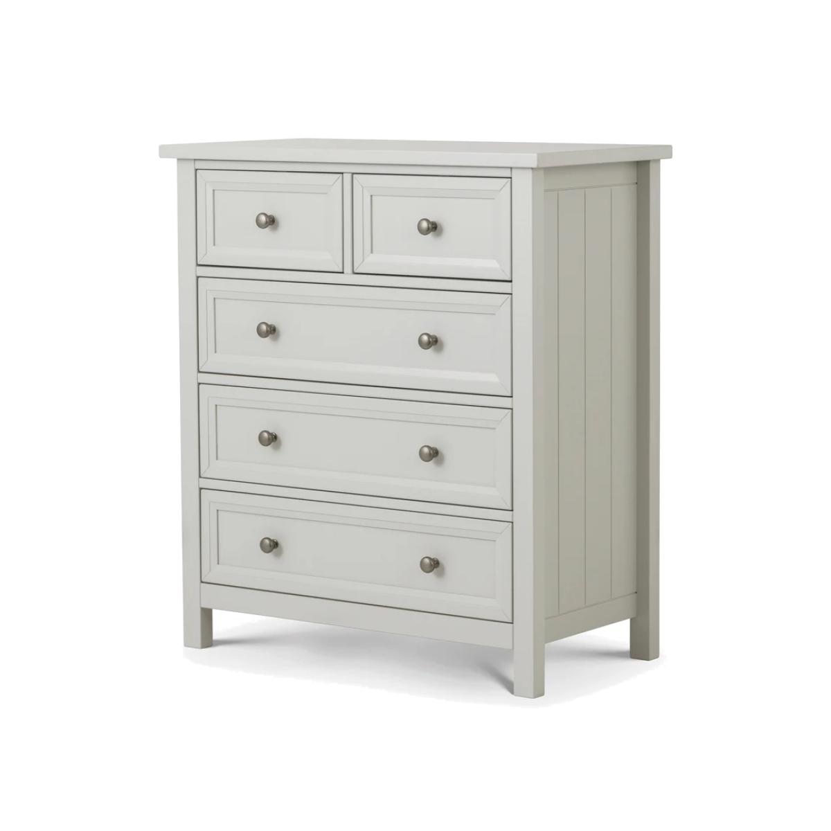 Enhance your bedroom storage with the Julian Bowen Maine 3 + 2 Drawer Chest, beautifully finished in a soft dove grey. This elegant piece blends classic shaker design with practical everyday function, offering three spacious lower drawers for bulkier items and two smaller top drawers for accessories or essentials. Crafted from durable MDF with subtle detailing and brushed metal handles, it’s a timeless addition to both traditional and contemporary spaces. Whether you're organising clothing, linens, or personal items, the Maine chest brings order and understated style to your home. Features: 3 large drawers + 2 smaller top drawers for flexible storage Classic shaker design with a Dove Grey painted finish Brushed metal handles for a stylish contrast Durable MDF construction built to last Complements the full Julian Bowen Maine bedroom collection Full assembly required Dimensions: Height 94cm Width 84cm Depth 44cm All screens vary in colour reproduction and whilst every effort has been made to display the colour as accurately as possible it is for guidance only.