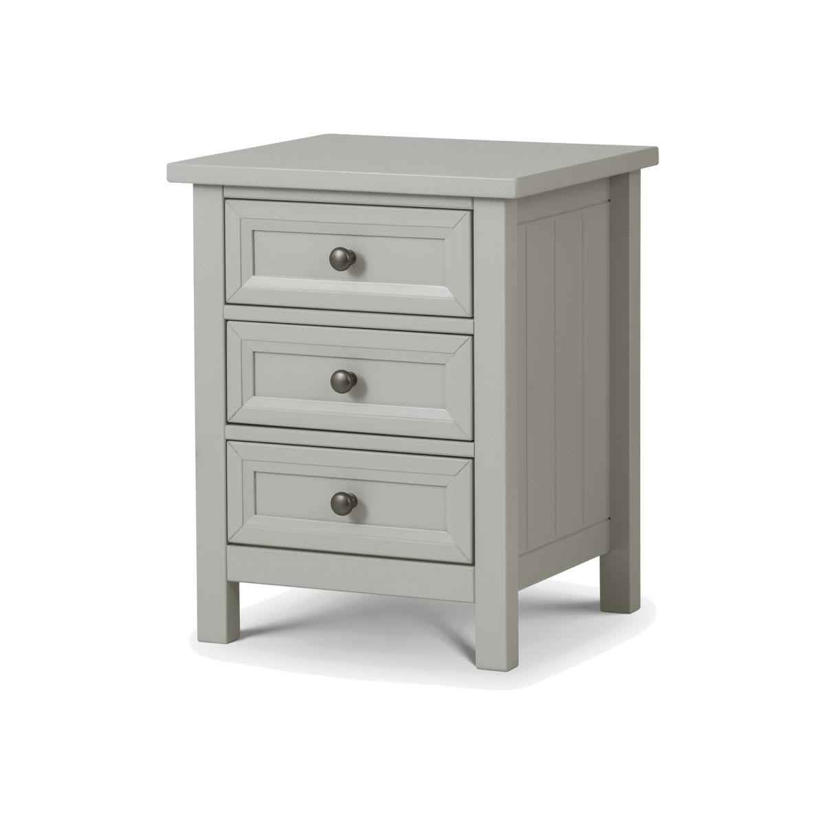 Dimensions W48cm x D44cm x H60.5cm. Maine is an elegant New England style range of bedroom furniture. The combination of exquisite dove grey lacquered finish with characteristic side panelling and detailed chamfered cabinetry makes for a soothing and refined aesthetic with timeless appeal while delicate pewter handles add the perfect finishing touch. Features. 3 Drawer Bedside Table. Panelled New England style with detailed chamfered cabinetry Dove grey lacquered finish. Atractive pewter handles. Part of Julian Bowen's Maine bedroom collection..