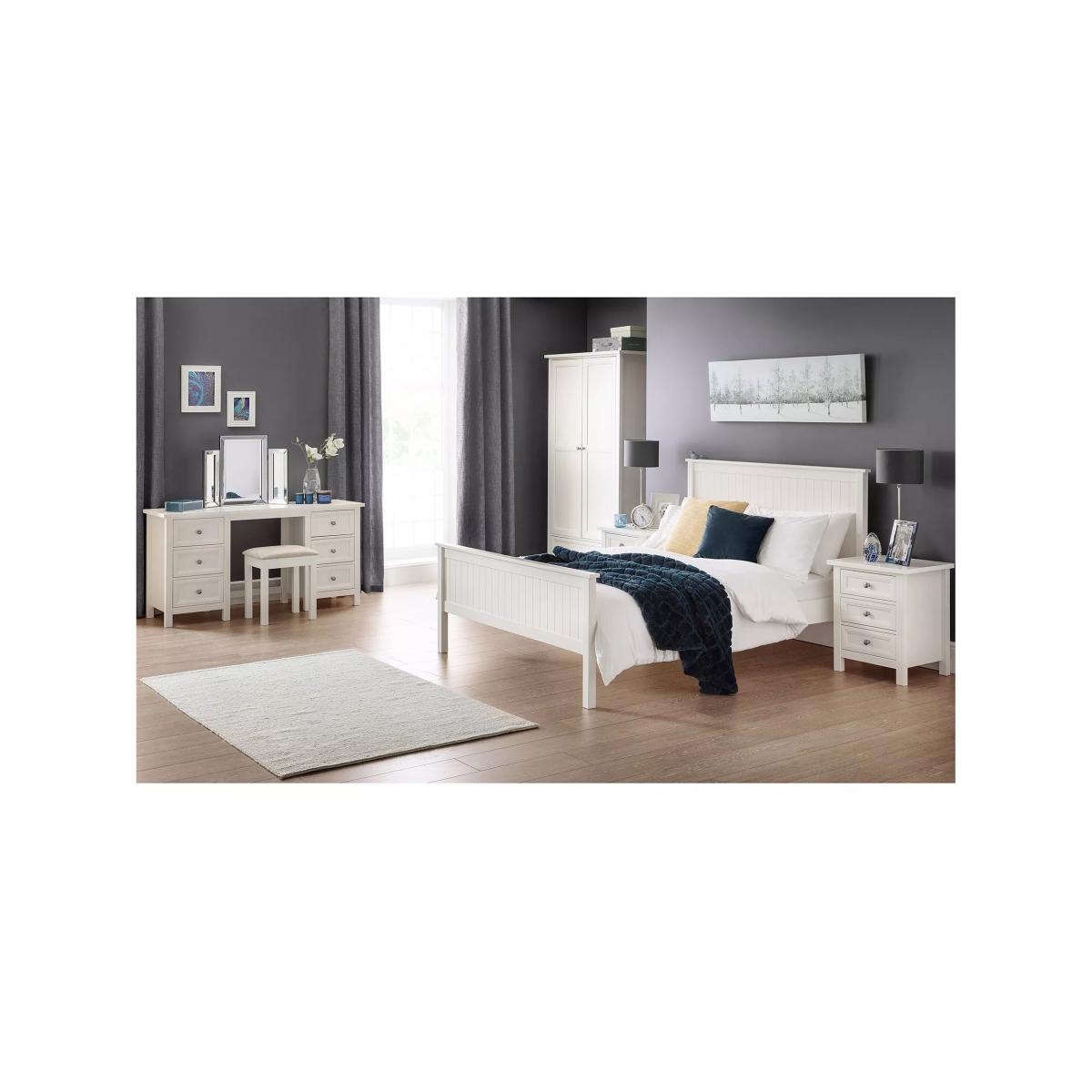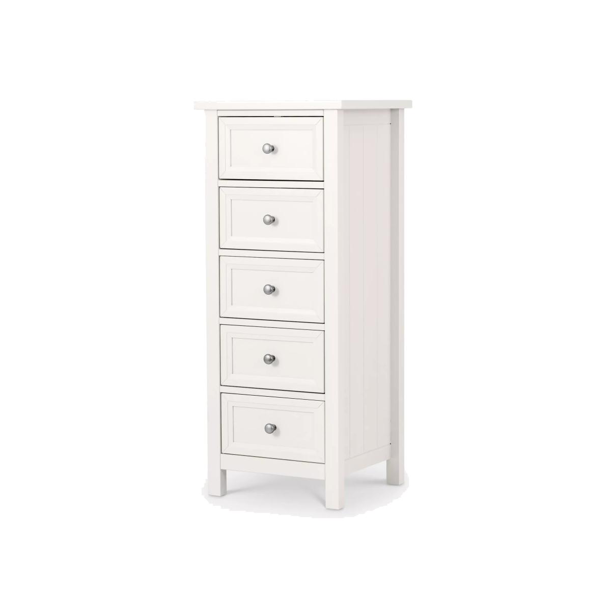Maine is an elegant New England style range of bedroom furniture. The combination of exquisite surf white painted finish with characteristic side panelling and detailed chamfered cabinetry makes for a soothing and refined aesthetic with timeless appeal, while delicate pewter handles add the perfect finishing touch. The Maine 5 drawer tall chest's compact footprint makes it a great storage solution for smaller bedrooms. Want to see it first? You may want to see and get a feel for the furniture in one of our shops before ordering. We'll be able to tell you where the range you'd like to view is on display.