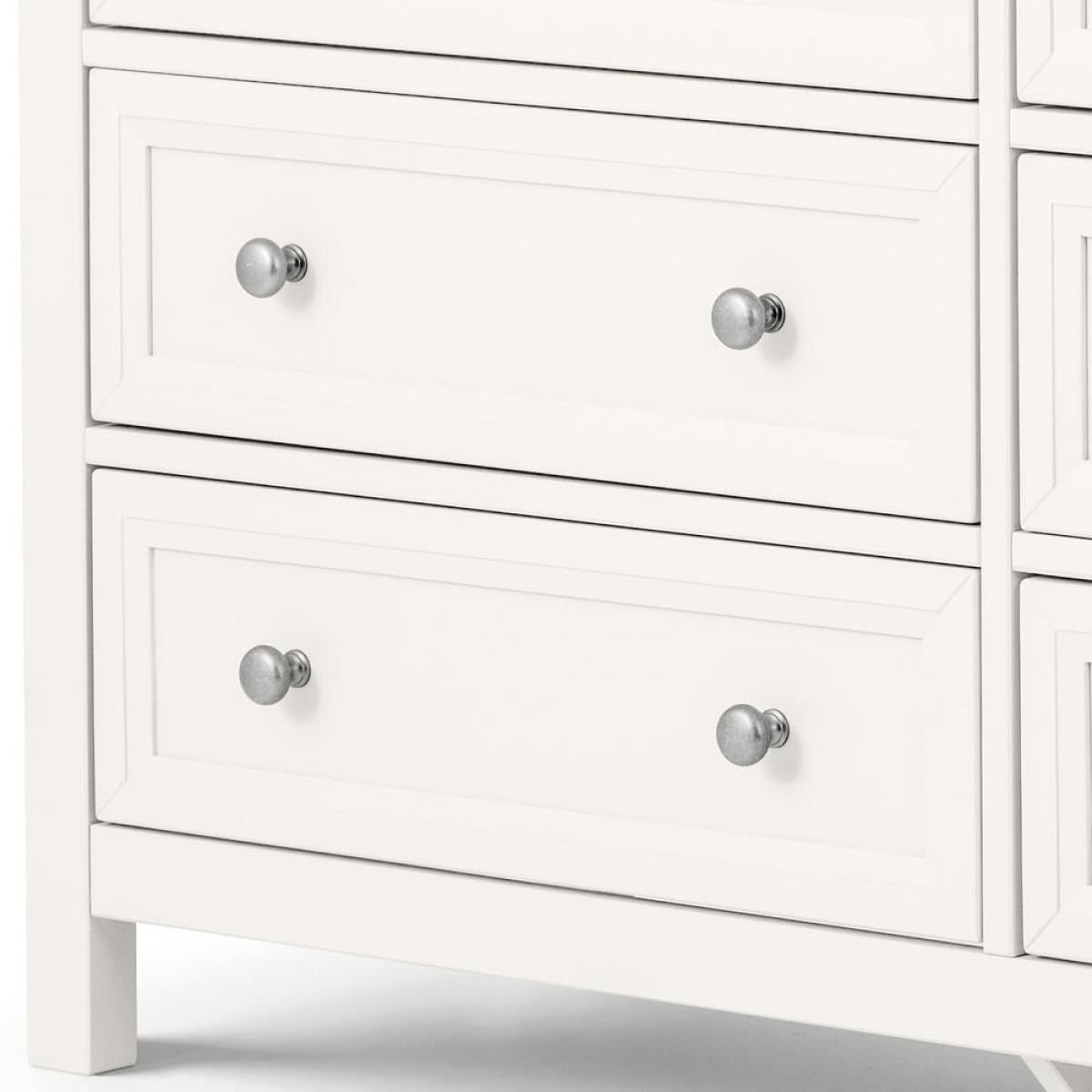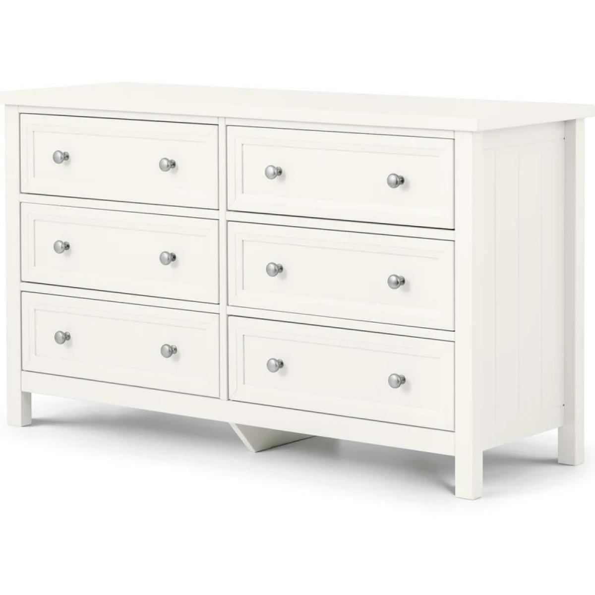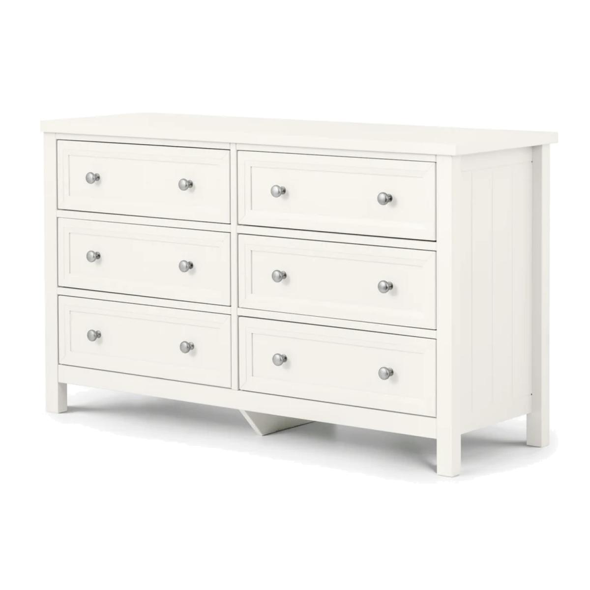 Bring timeless elegance and practical storage to your bedroom with the Julian Bowen Maine 6 Drawer Wide Chest in Surf White. Inspired by classic New England style, this beautifully crafted piece features a clean, painted finish that brightens any space with its fresh, coastal charm. The wide chest offers six spacious drawers, perfect for keeping clothing, accessories, and everyday essentials neatly organized. Grooved panel detailing and brushed metal handles add a refined touch, while the sturdy construction ensures lasting durability. Whether you’re styling a modern retreat or a traditional setting, the Maine chest combines function and form effortlessly—making it a versatile centrepiece for any bedroom. Features: Finished in a soft Surf White for a bright, airy look Six generously sized drawers for maximum storage Grooved panel design with shaker-style charm Brushed metal handles for a contemporary touch Durable construction with smooth drawer runners Part of the Julian Bowen Maine bedroom collection Dimensions: Height 74.3cm Width 130cm Depth 44cm All screens vary in colour reproduction and whilst every effort has been made to display the colour as accurately as possible it is for guidance only.