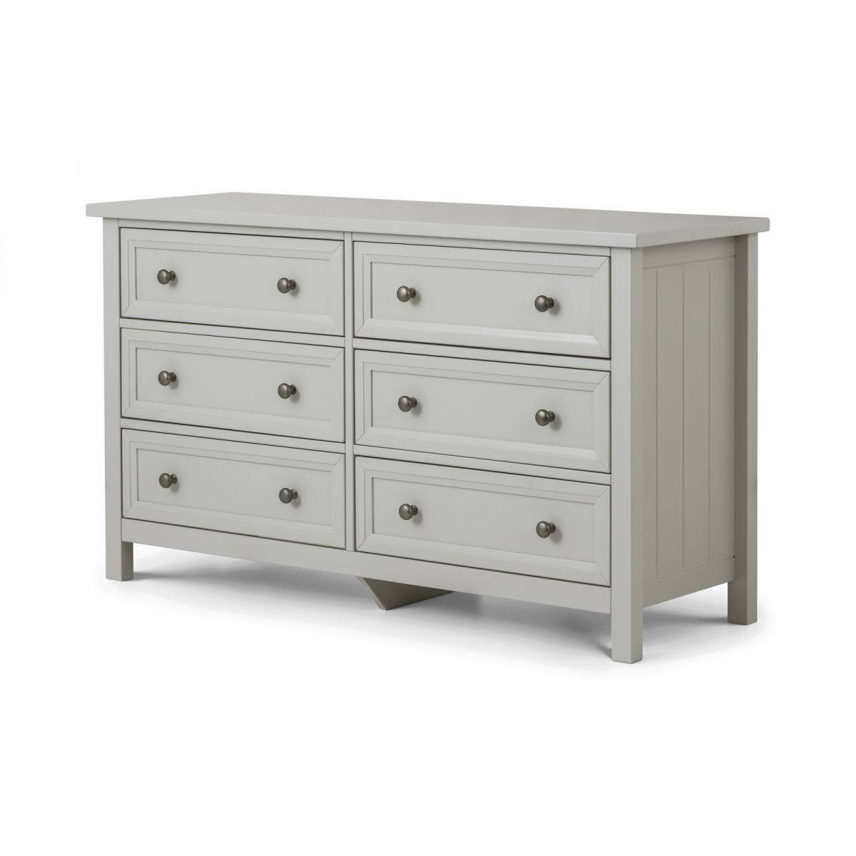 Maine is an elegant New England style range of bedroom furniture. The combination of exquisite dove grey lacquered finish with characteristic side panelling and detailed chamfered cabinetry makes for a soothing and refined aesthetic with timeless appeal, while delicate pewter handles add the perfect finishing touch. The Maine 6 drawer wide chest offers copious amounts of storage and can also be used as a dressing table. Features: Dimensions: 44cm D x 130cm W x 74.5cm H Panelled New England style with detailed chamfered cabinetry Dove grey lacquered finish. Also available in surf white Atractive pewter handles Internal drawer dimensions - 51.5cm x 33.5cm x 15cm Part of the Julian Bowen Maine bedroom collection Requires assembly Please note, this product is an online exclusive and is not available to view in any of our stores.