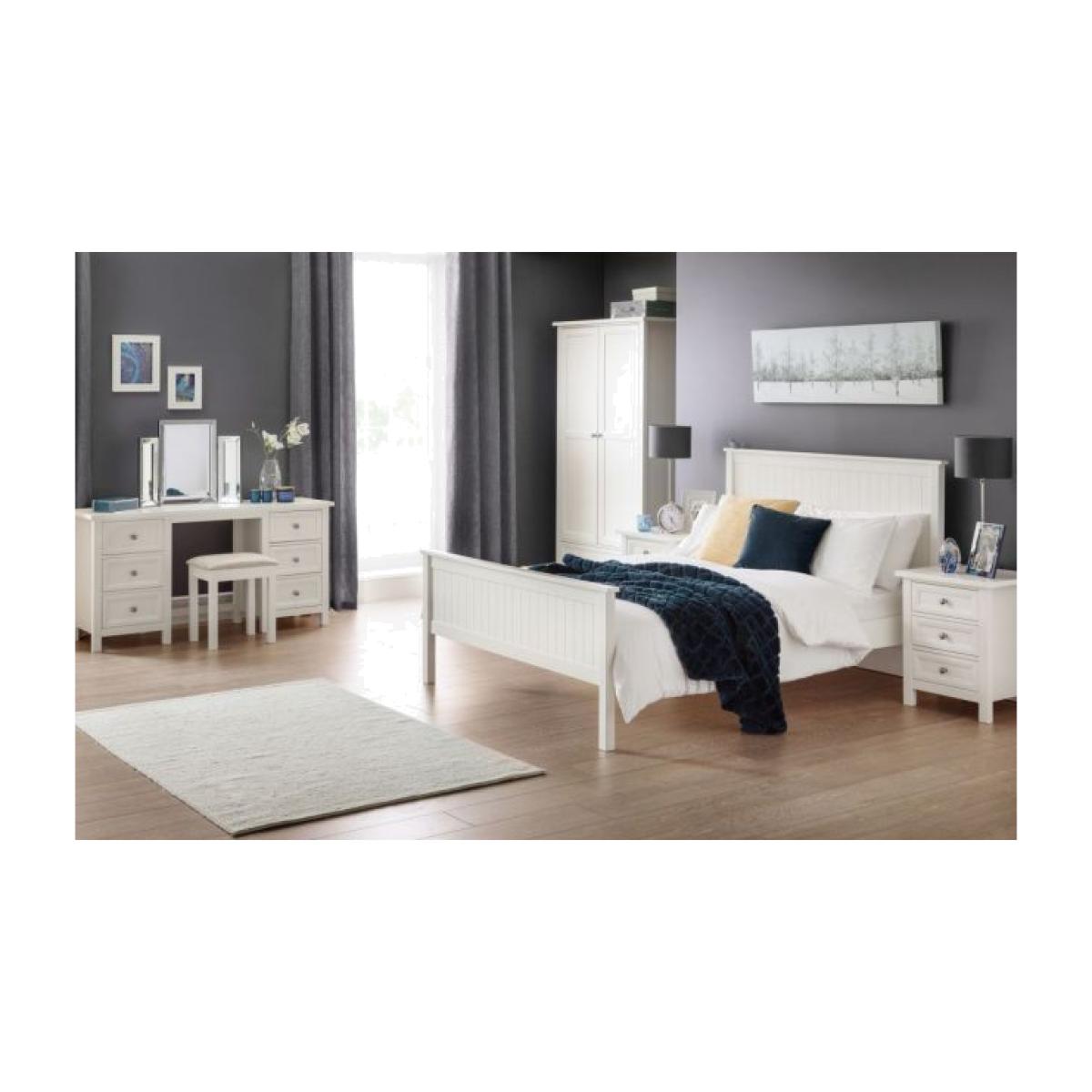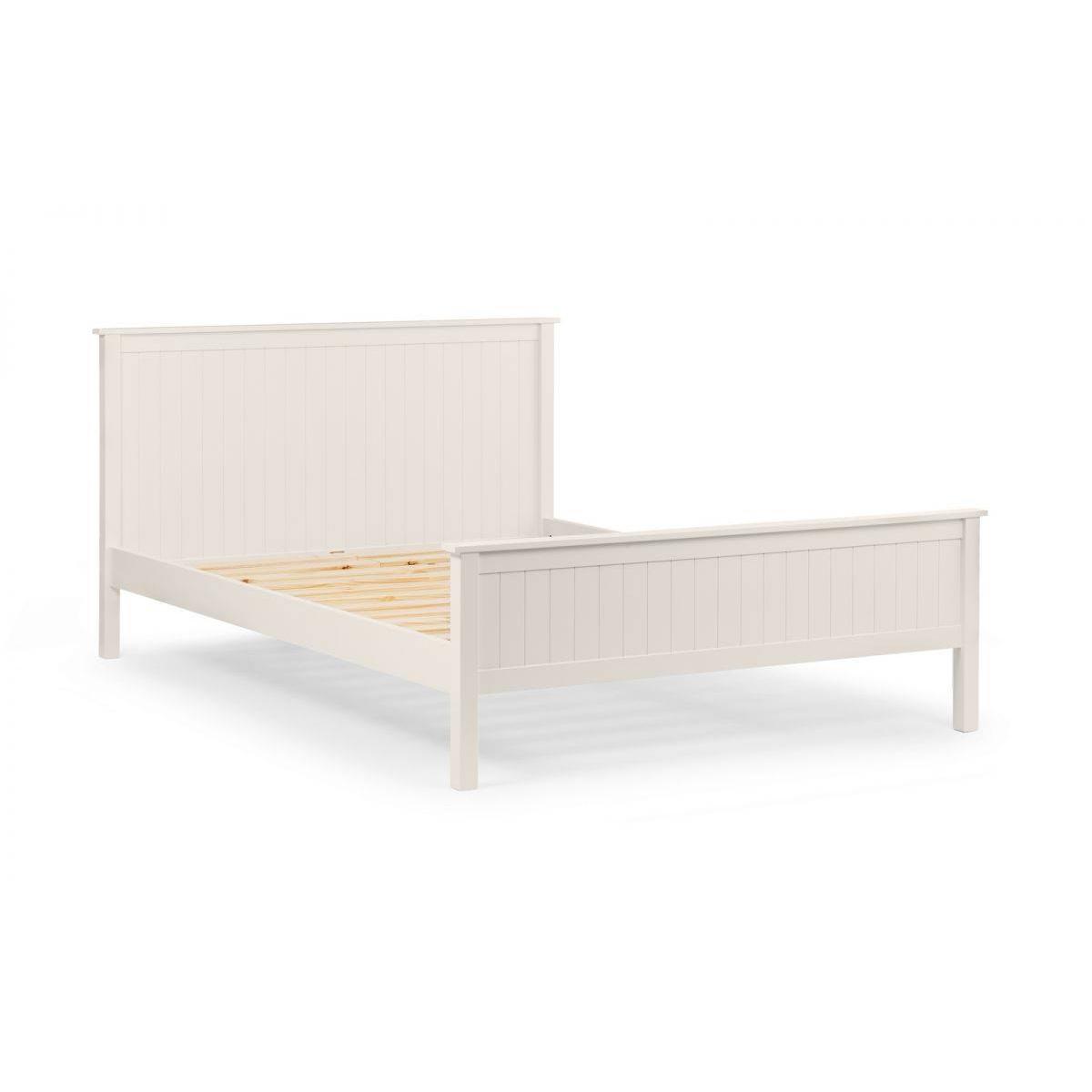 An elegant and simple New England style bed whose characteristic panelling is beautifully finished in an exquisite surf white lacquer to create a soothing and refined aesthetic with timeless appeal. A solid slatted base ensures supreme comfort and prolonged mattress life. Features: Requires assembly Durable Surf White Lacquered Finish or Surf White Timeless and Classic Design Solid Pine Slatted Base New England style panelling Matches Julian Bowen's beautiful Maine bedroom furniture range Bottom of side rail to floor - 24.5cm Available in 3 sizes: Single, Double, King