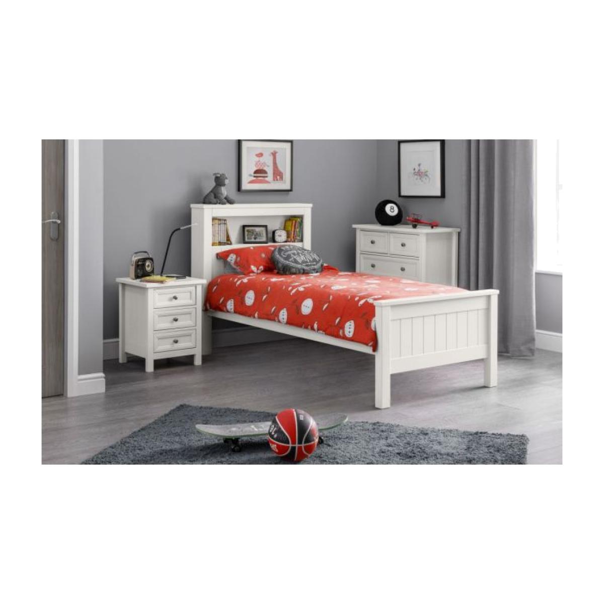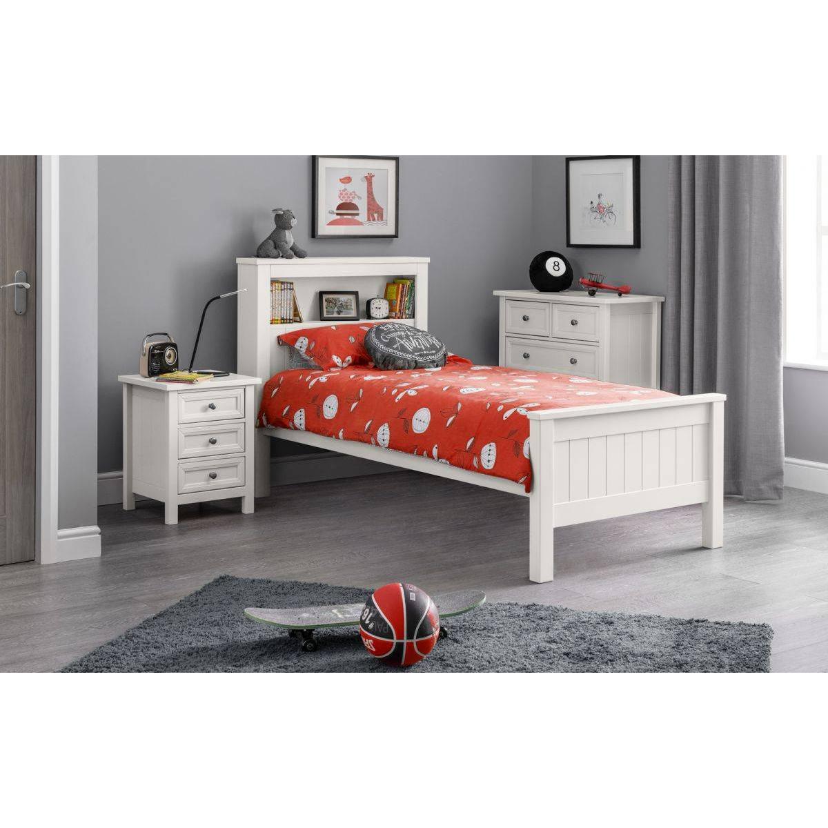 The Maine Bookcase Bed features a high headboard with a shelf, perfect for storing books at arms reach for your evening read! Crafted from MDF with an exquisite surf white lacquer, this bed features New England style panelling on the headboard creating a timeless appeal. A solid slatted base ensures supreme comfort and prolonged mattress life. The perfect match for the Maine Underbed, creating a space saving solution perfect for sleepovers! Features: Dimensions: 104cm D x 214cm W x 113cm H Fininshed in an exquisite surf white lacquer. Also available in Dove Grey. Strong and durable construction Featuring a shelf within the headboard, perfect for storing books Part of the Julian Bowen Maine Bedroom range Requires Assembly