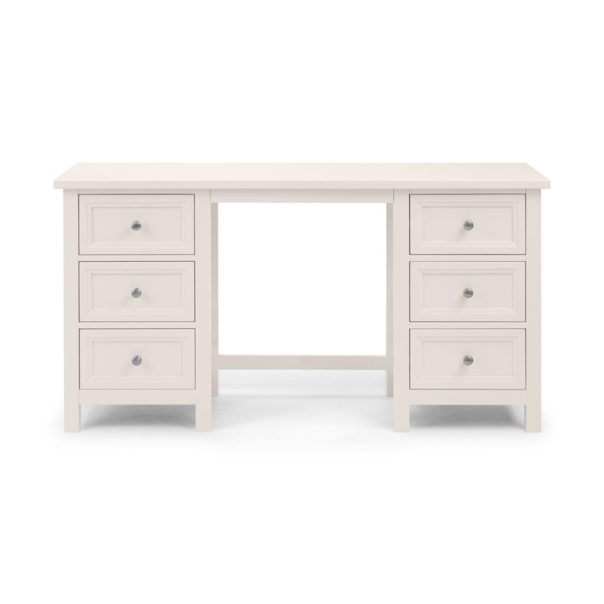 Dimensions W145cm x D44cm x H74cm Maine is an elegant New England style range of bedroom furniture. The combination of exquisite surf white lacquered finish with characteristic side panelling and detailed chamfered cabinetry makes for a soothing and refined aesthetic with timeless appeal while delicate pewter handles add the perfect finishing touch. The Maine Dressing Table offers copious amounts of storage with 6 drawers. The perfect match for the Maine Dressing Stool. Features. Panelled New England style with detailed chamfered cabinetry Surf White lacquered finish. Atractive pewter handles. Part of Julian Bowen's Maine bedroom collection12m product guarantee..