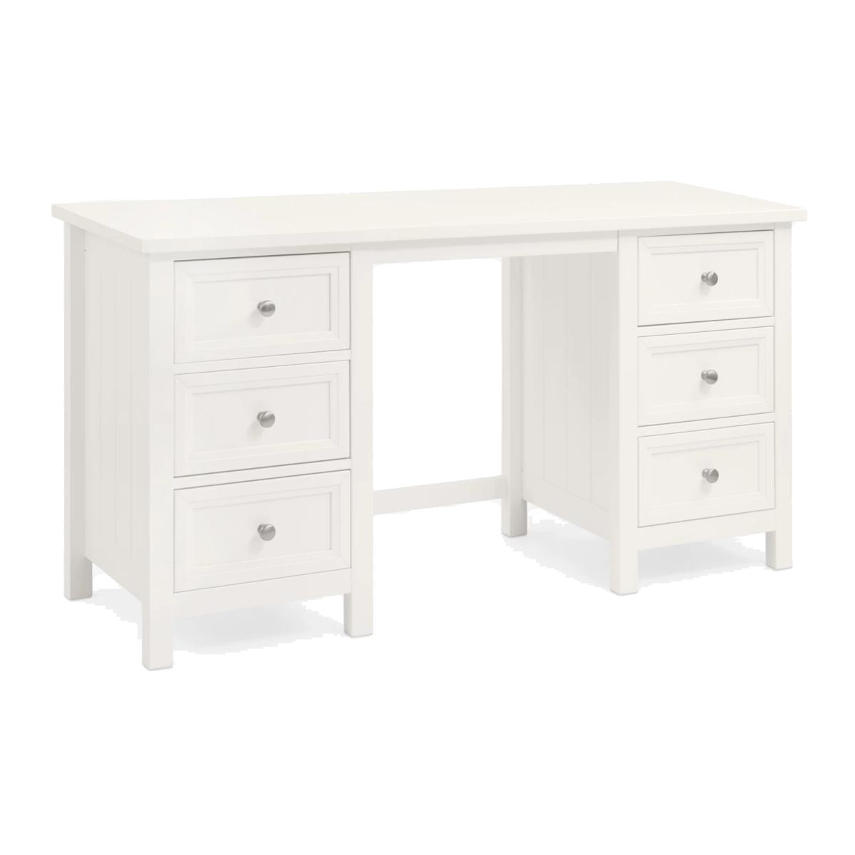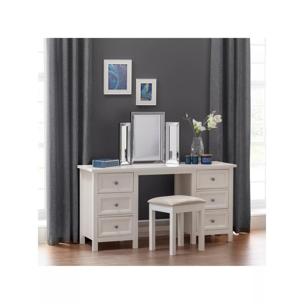 Maine is an elegant New England style range of bedroom furniture. The combination of exquisite surf white painted finish with characteristic side panelling and detailed chamfered cabinetry makes for a soothing and refined aesthetic with timeless appeal, while delicate pewter handles add the perfect finishing touch. The Maine dressing table offers plenty of storage space thanks to a total of six drawers. Want to see it first? You may want to see and get a feel for the furniture in one of our shops before ordering. We'll be able to tell you where the range you'd like to view is on display.