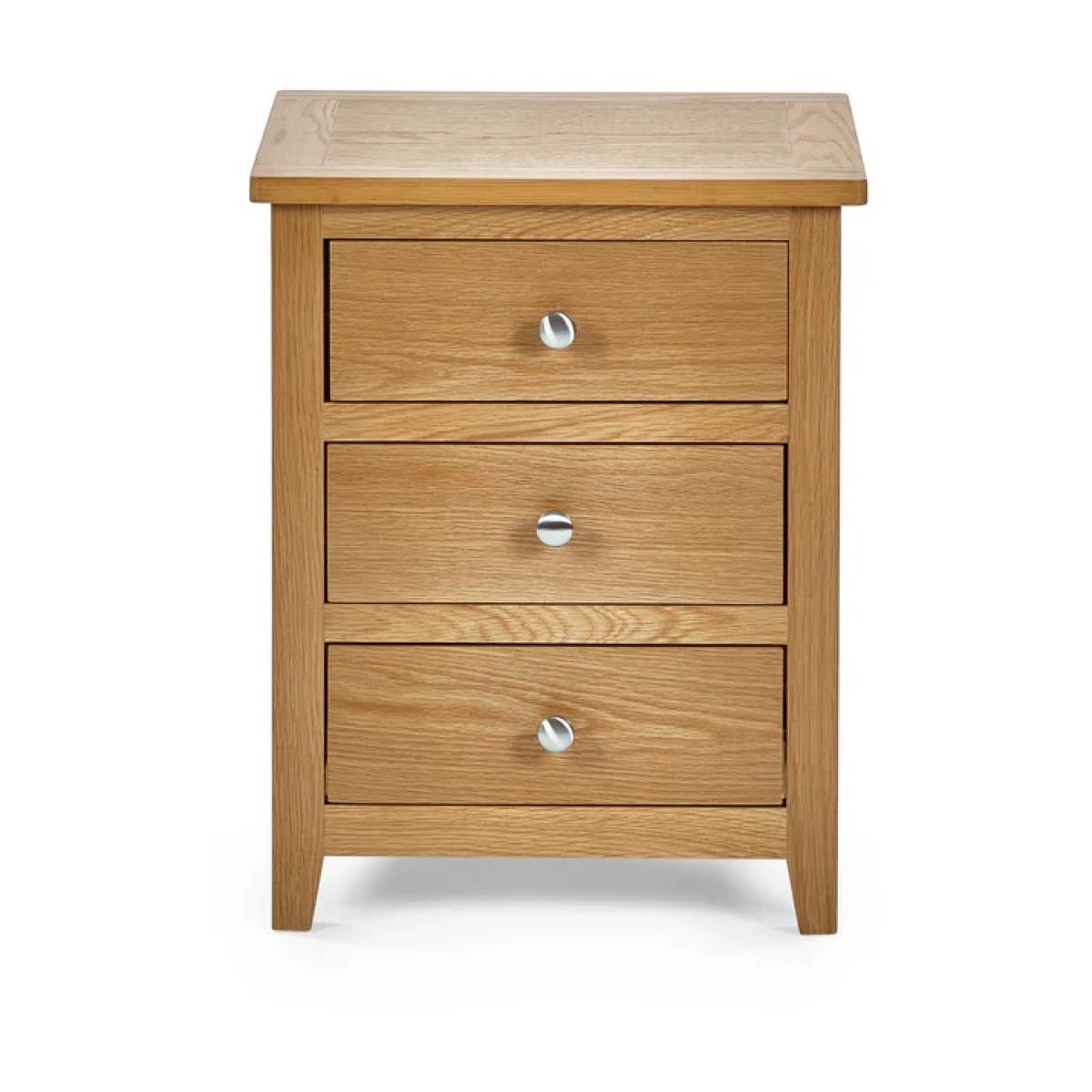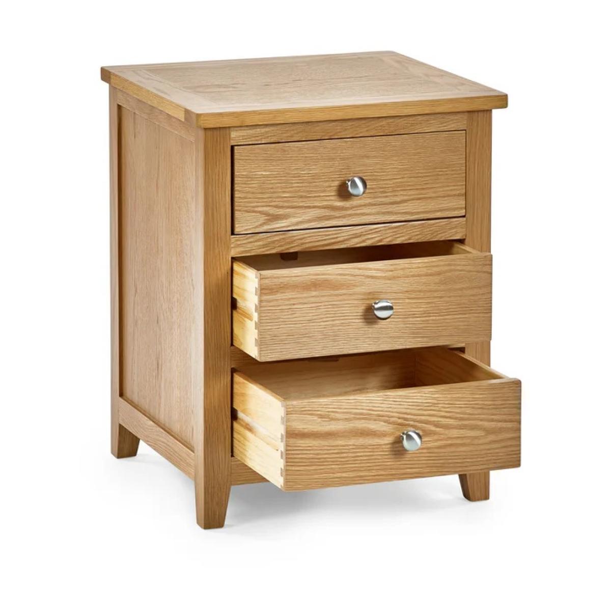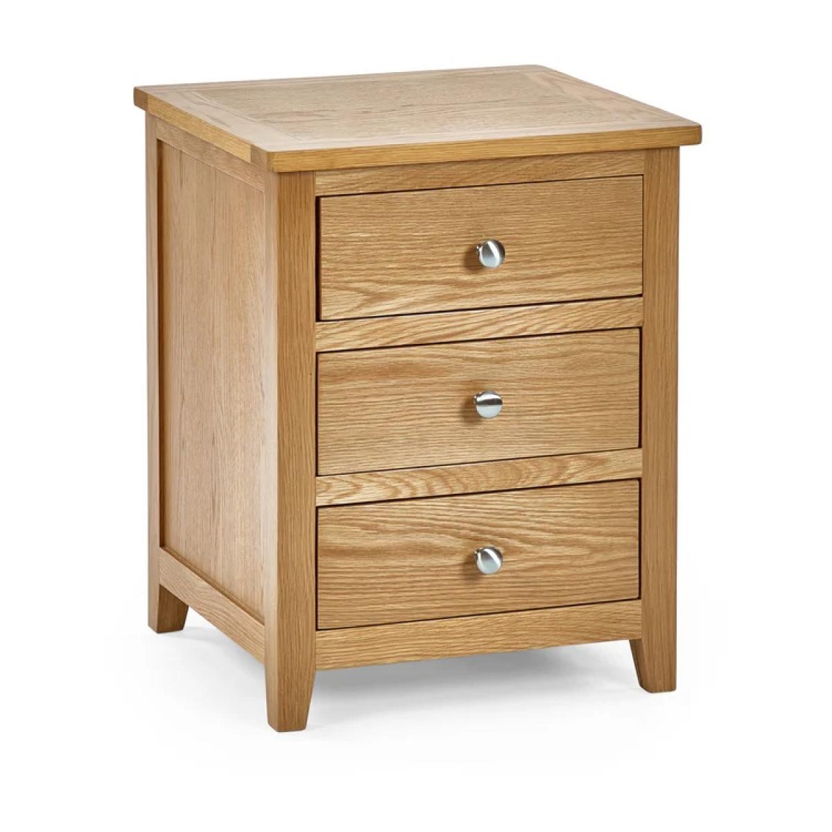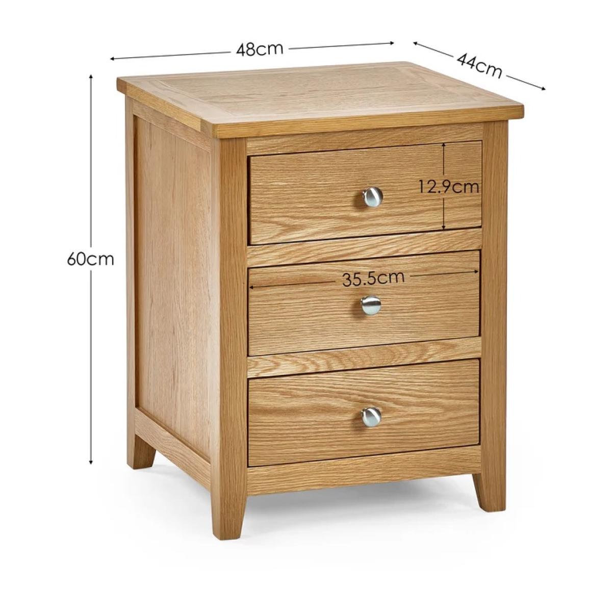 Bring timeless charm and everyday practicality to your bedroom with the Julian Bowen Mallory 3 Drawer Bedside. Beautifully crafted from solid oak and oak veneers, this elegant piece showcases a warm natural finish that enhances the wood’s grain and character. Its three spacious drawers offer plenty of room for keeping your nighttime essentials neatly tucked away, while the smooth-glide runners ensure easy access at any hour. Finished with understated round silver knobs and gently tapered legs, the Mallory bedside blends effortlessly into both modern and traditional interiors. Whether paired with the full Mallory range or used as a standalone feature, this bedside table is as functional as it is stylish. Features: Crafted from solid oak and oak veneers, ensuring long lasting durability Simple and stylish design Robust and durable 3 spacious drawers Round silver knobs Part of the Mallory bedroom collection Fully Assembled Dimensions: Height 60cm Width 48cm Depth 44cm All screens vary in colour reproduction and whilst every effort has been made to display the colour as accurately as possible it is for guidance only.