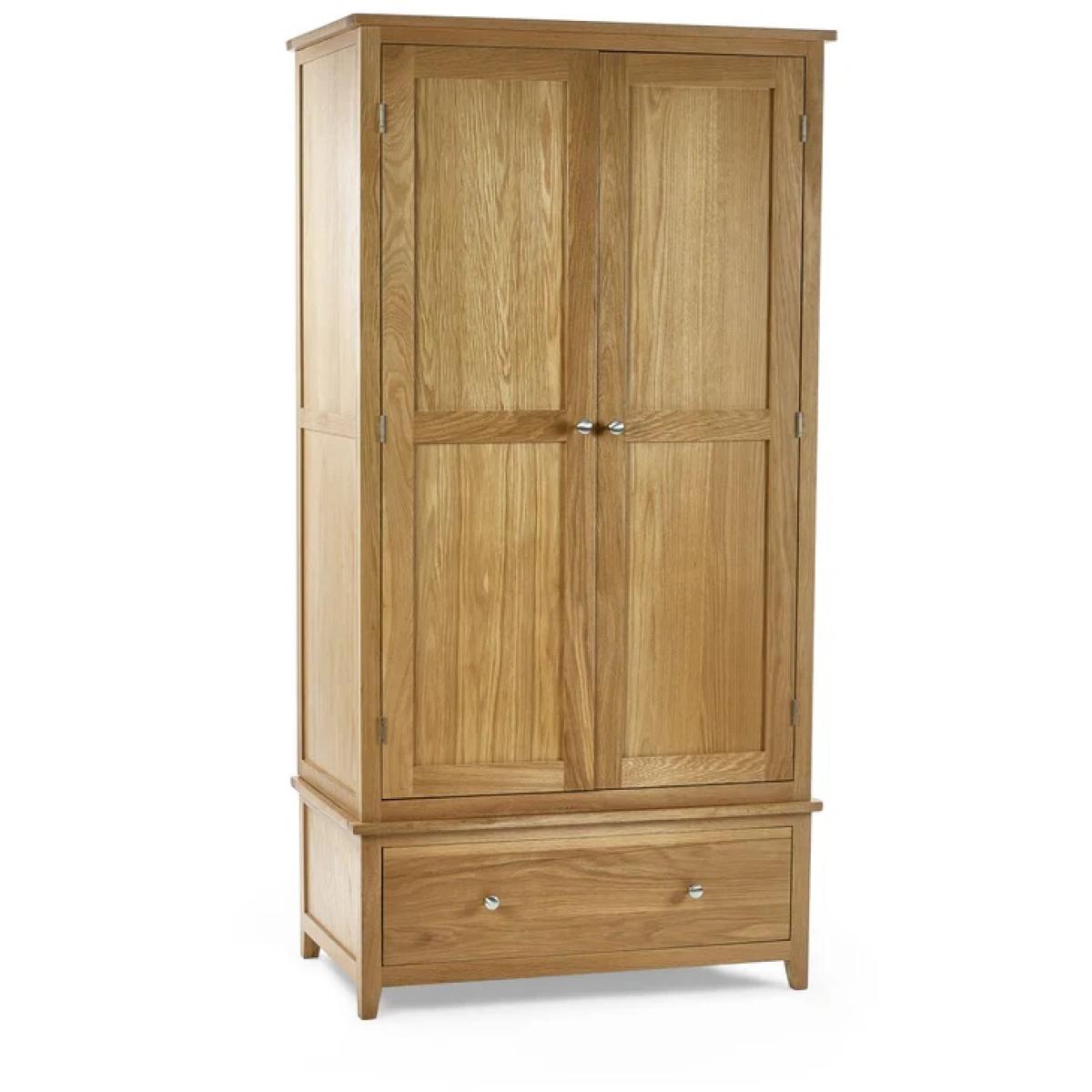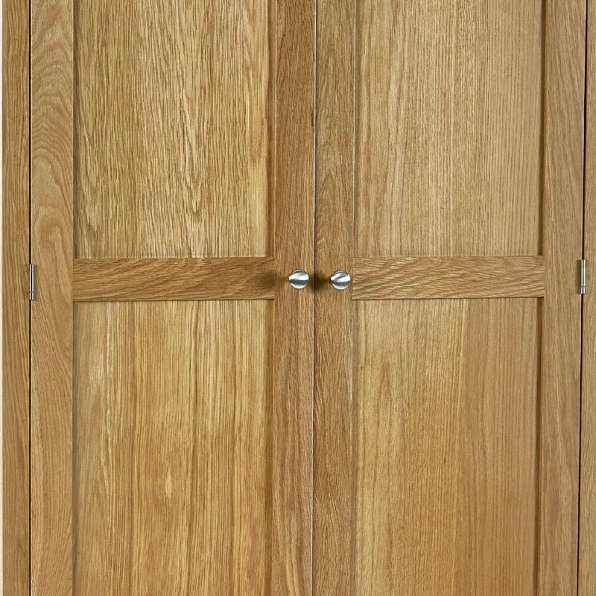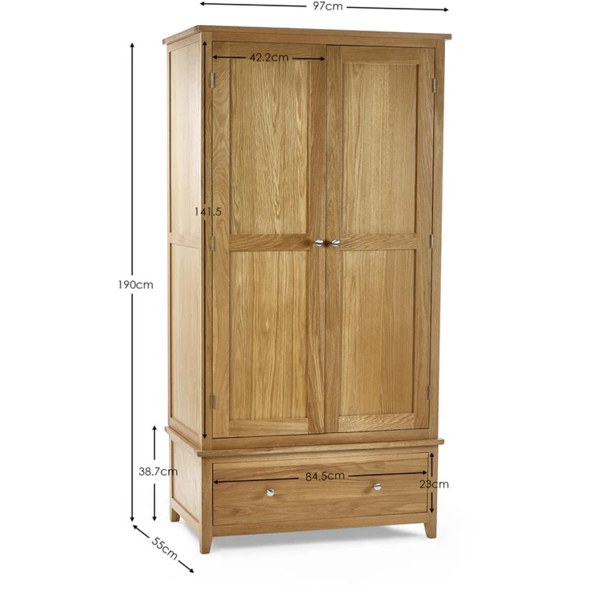 Bring warmth and functionality to your bedroom with the Julian Bowen Mallory Combination Wardrobe in Light wood. Crafted to offer practical storage without compromising on style, this wardrobe blends natural tones with a clean, contemporary design—perfect for both traditional and modern interiors. The wardrobe features a generous full-height hanging section for keeping clothes neat and crease-free, alongside a built-in three-drawer chest ideal for storing folded garments, accessories, or everyday essentials. Its vertical design maximises space, while sleek metal handles and smooth-glide drawer runners ensure ease of use. With its light wood finish and versatile layout, the Mallory Combination Wardrobe is a timeless addition to any bedroom setting. Features: Attractive light wood for a natural, airy look Combination of full-height hanging space and three drawers Smooth metal runners for easy drawer operation Sleek brushed metal handles for a modern edge Durable construction with a space-efficient footprint Part of the coordinated Julian Bowen Mallory range Full Assembly Required Dimensions: Height 190cm Width 97cm Depth 55cm All screens vary in colour reproduction and whilst every effort has been made to display the colour as accurately as possible it is for guidance only.