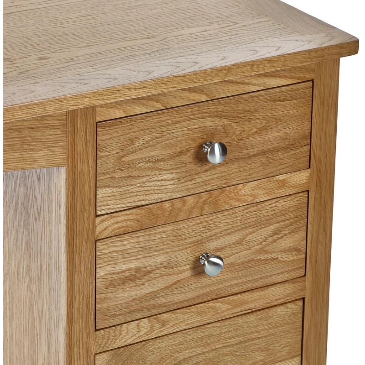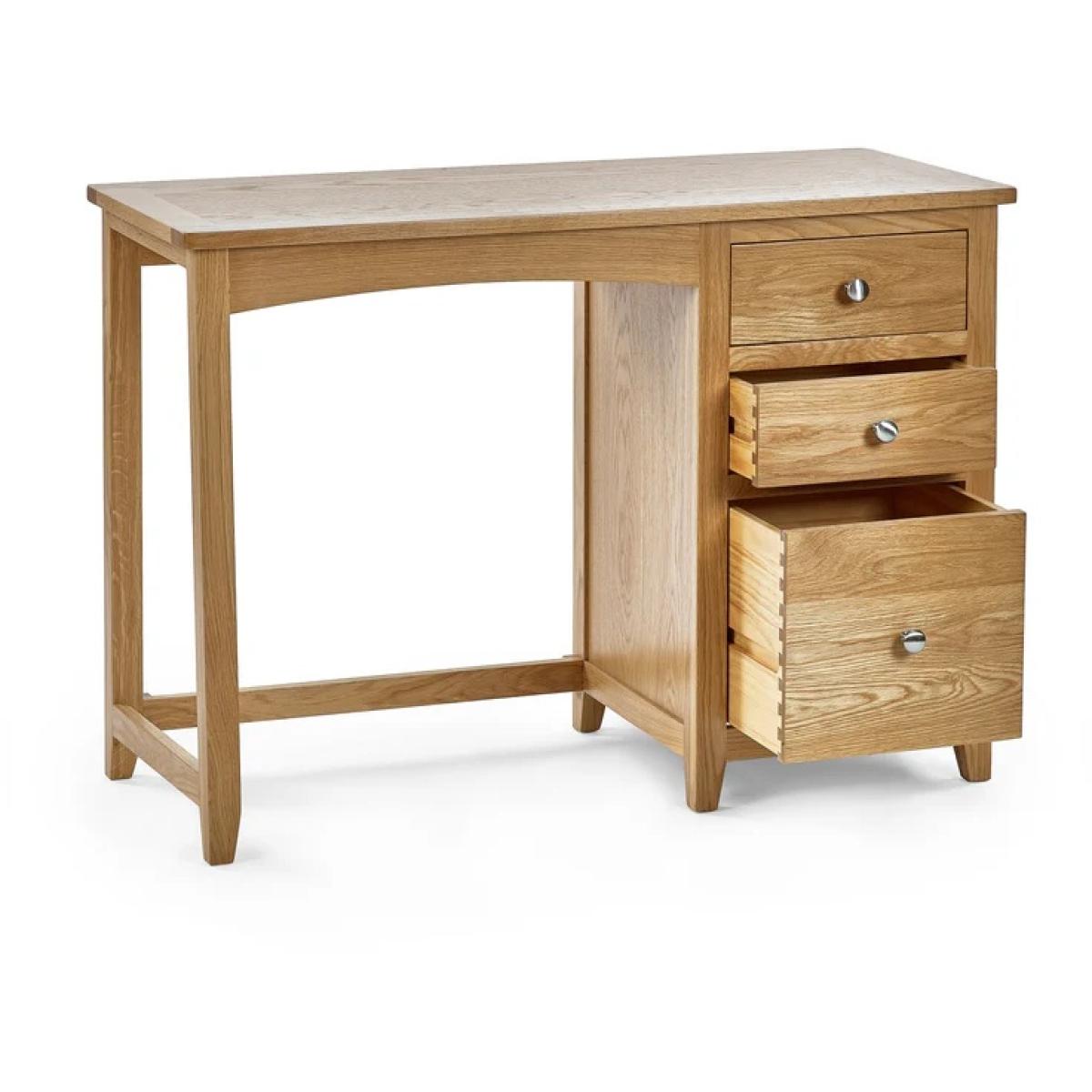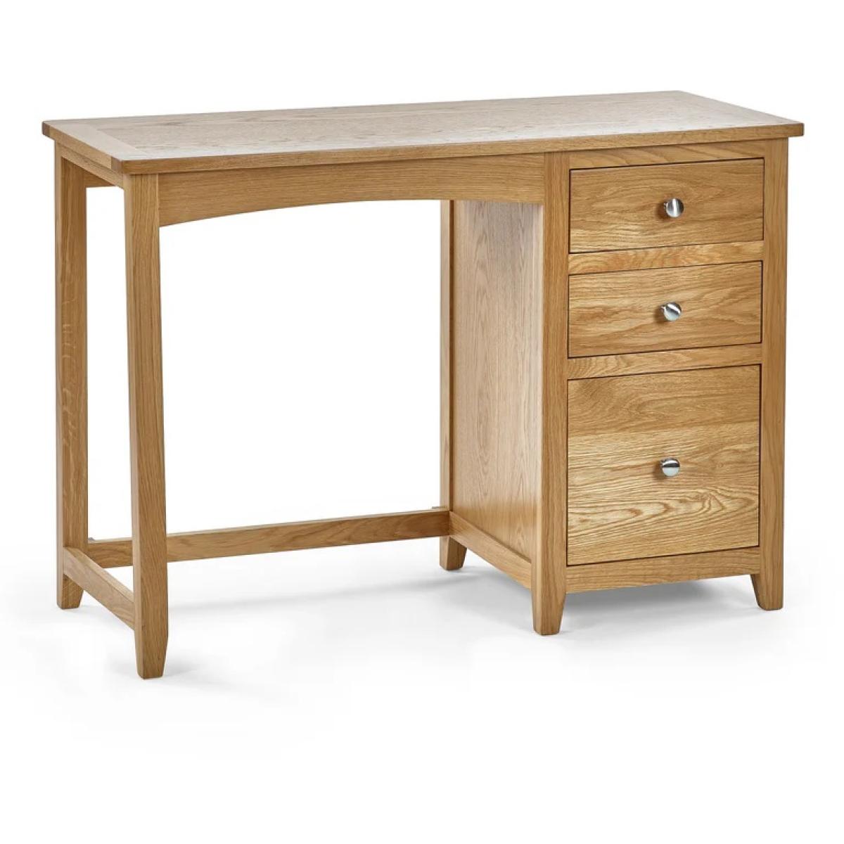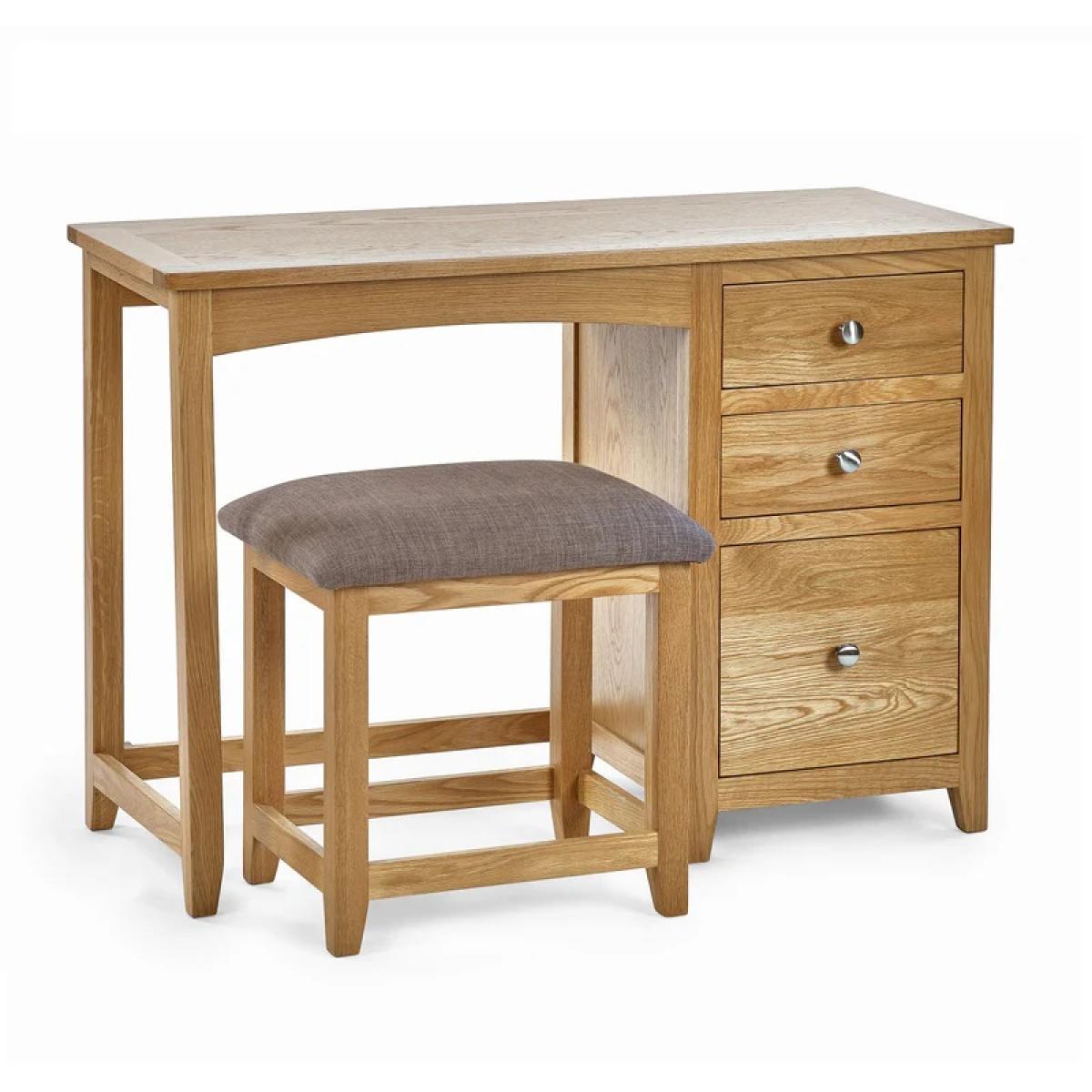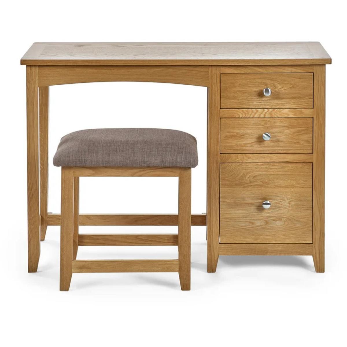 Add a touch of understated elegance to your bedroom with the Julian Bowen Mallory Single Dressing Table & Stool Set in Light Wood. Designed with both style and practicality in mind, this compact yet functional set offers a warm, natural finish that complements a wide range of interior décors. The dressing table features a spacious tabletop—ideal for daily grooming or displaying your favourite beauty essentials—alongside a single drawer for discreet storage. The accompanying stool is comfortably cushioned and tucks neatly beneath the table when not in use, making it perfect for smaller spaces. Crafted with clean lines and a light wood grain effect, the Mallory Dressing Table Set delivers timeless simplicity with everyday functionality. Features: Light wood finish for a natural, versatile look Three drawers with smooth-glide runners for convenient storage Coordinating cushioned stool included Compact design ideal for smaller bedrooms or dressing areas Sturdy build with modern, minimalist styling Part of the Julian Bowen Mallory bedroom furniture collection Fully Assembled Dimensions: Height 75cm Width 107cm Depth 44cm All screens vary in colour reproduction and whilst every effort has been made to display the colour as accurately as possible it is for guidance only.