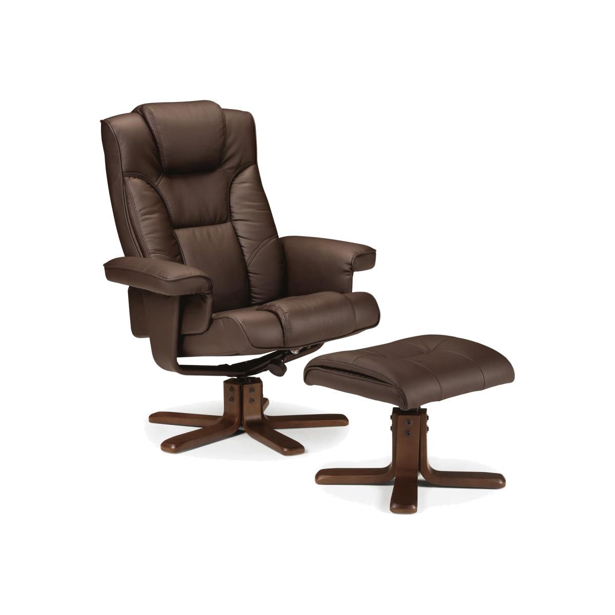 Spin swivel and recline to reach your maximum comfort position in the Malmo armchair then put your feet up on the accompanying footstool!. Dimensions W83 x D82 x H105 cm / W32.6 x D32.2 x H41.3 Inches Quick Feature Summary. Soft supportive padding for ultimate comfort360 swivel to reach your perfect angle. Fully manual adjustable recliner to lay back and relax. Deep sumptuous brown faux leather Dark walnut veneer star base for great stability. Included footrest excellent for after a hard days work. How big am I?The Malmo recliner is a compact shape with a space saving star base. Ideal for an extra seat in the living room or a great relaxation spot in the office. Taking up less room than a regular arm chair as well as offering plenty more seating positions and comfort. How do I look?With a smart appearance the Malmo is ideal for many rooms. Dark sumptuous brown faux leather gives a rich versatile image. The padded seat combined with the twin needle stitching creates an enticing comfortable look that's hard to resist. What am I made of?Soft touch faux leather combines with walnut venner to create the welcoming Malmo recliner. With a strong sturdy wooden base recline and swivel all you want with no worries. Treat me right. Simply wipe down with a slightly damp cloth to clean the faux leather. It is advised to avoid household cleaners and abrasives. How easy am I to put together?Arriving flat packed accompanied with easy to follow step by step instructions. As with any flat pack furniture for safe and easy construction we would recommend this item to be assembled by two. Who are Julian Bowen Julian Bowen have been supplying the UK for 27 years with value for money furniture. Each of their products is carefully researched to respond to the needs and aspirations of the final consumer in terms of design quality and price. Julian Bowen have been awarded the title of the UK's best furniture wholesaler for the second consecutive year. Useful Information. The pictured footstool is included. The Malmo is also available in black (MAL003). .